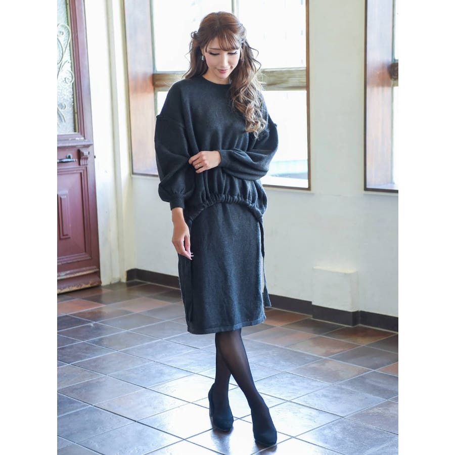 ☆バルーン袖が愛らしい印象を与える長袖トップスと品のある膝丈スカートを合わせた2pワンピはおしゃれさんの秋冬マストアイテム♪