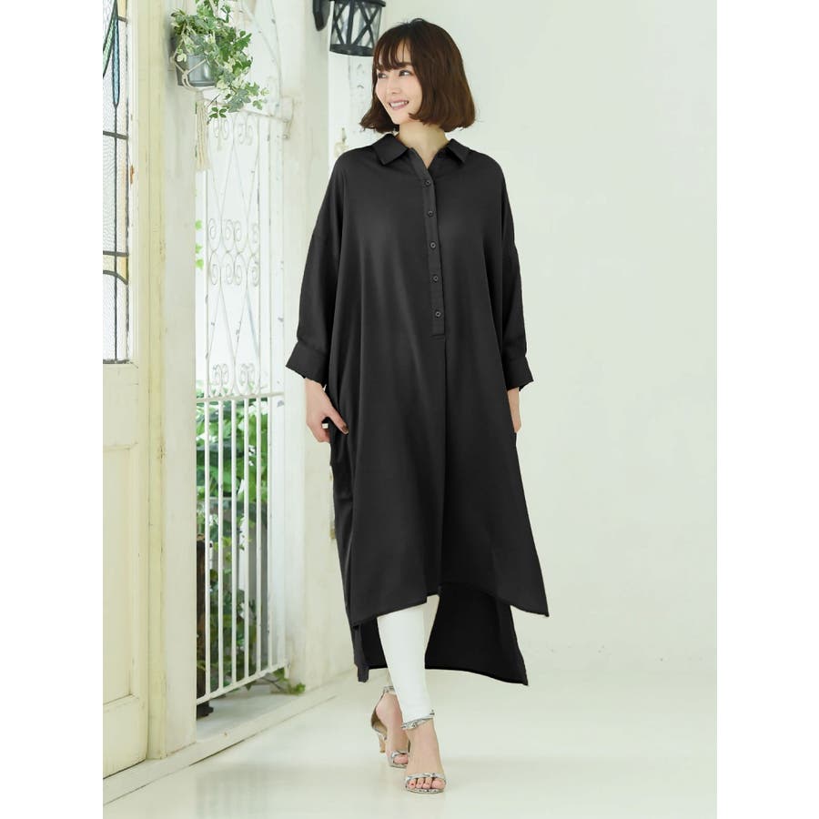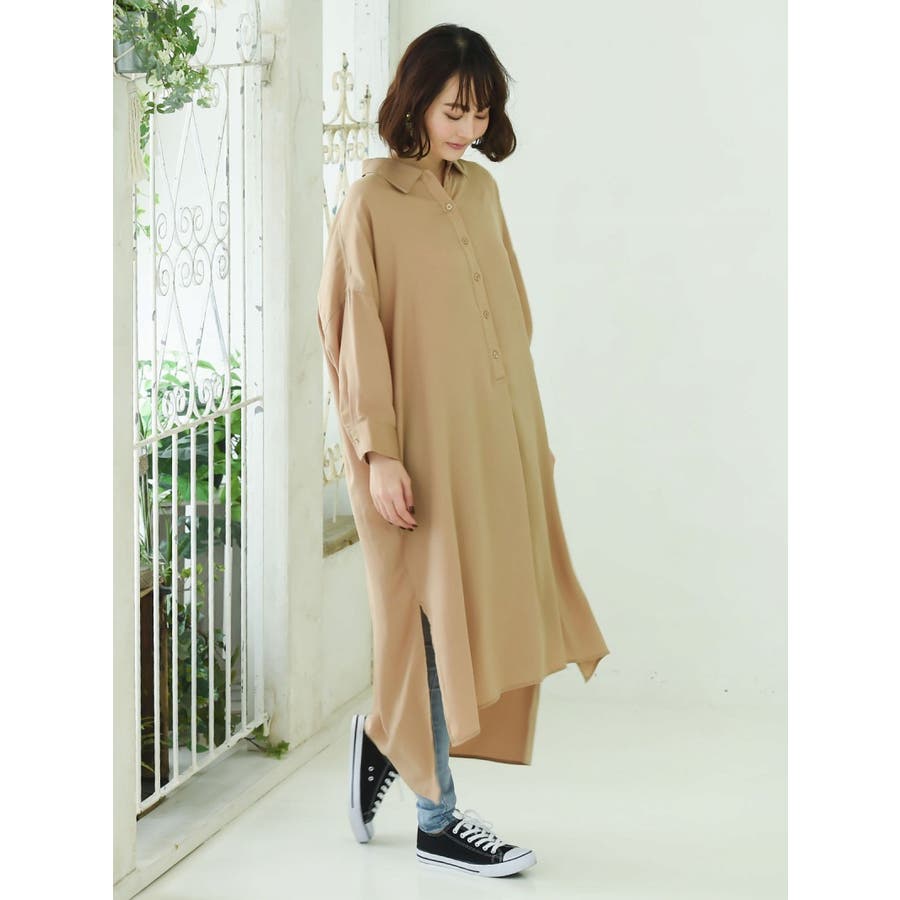 ☆ビックシルエットの無地シャツワンピースは前後差デザインがオシャレなミモレ丈ワンピース♪