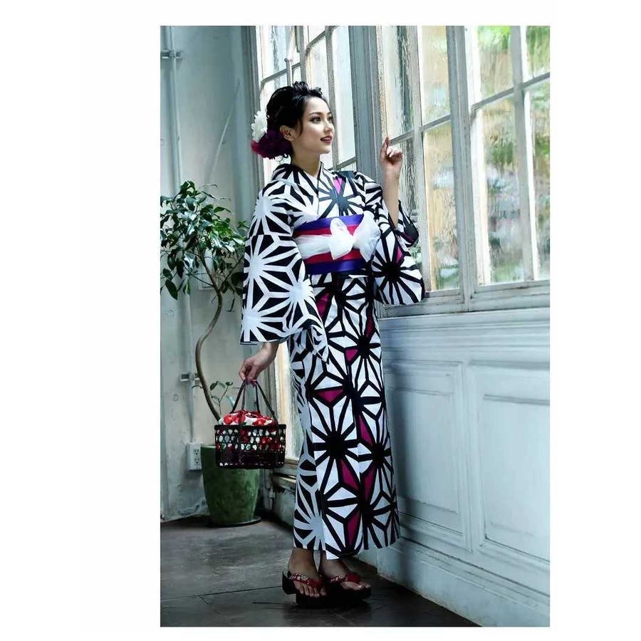 ☆古典柄の麻の葉柄にピンクを差し色にしたレトロモダンな浴衣は、片側がホワイトとブラックのモノクロの半身柄デザインがシックで大人可愛いゆかた♪