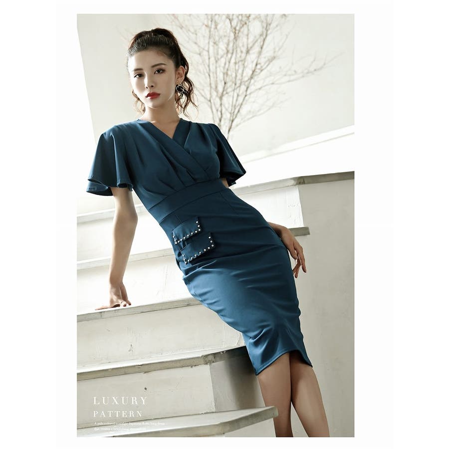 ☆カシュクールデザインのシンプルなワンカラーキャバワンピは二の腕カバー効果抜群のフレア袖となっておりハイウエスト切り替えデザインがスタイルアップ効果も期待できる韓国キャバドレスです♪