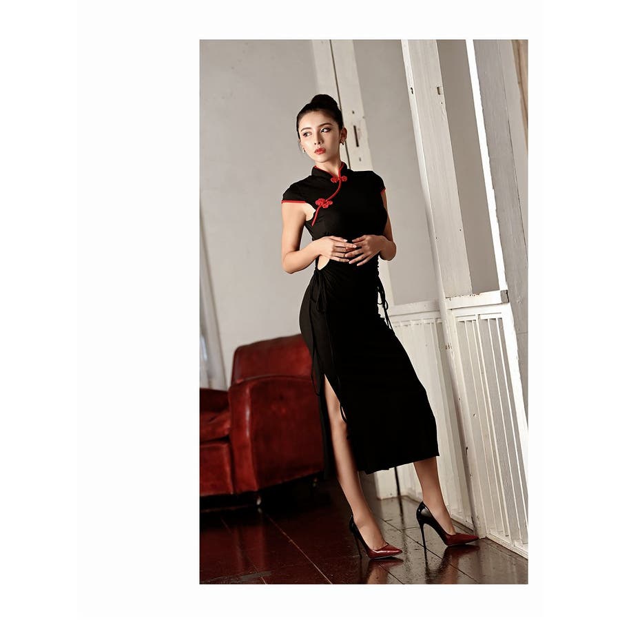 ☆大人っぽいデザインのチャイナ風ワンカラードレスはサイドに調節可能な紐がついておりカットデザインを絞って着用することもできるセクシードレスです♪