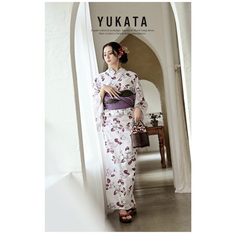 ☆ホワイトベースにパープルのレトロ感ある牡丹柄が大人女性にも上品に着こなしていただける高級感あるレディース浴衣セット♪