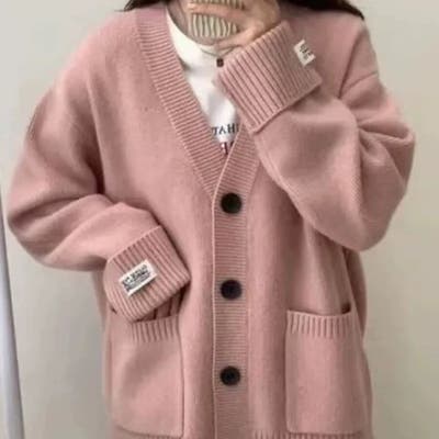 厚手ニットカーディガン ワッペン付き ゆったり レディース