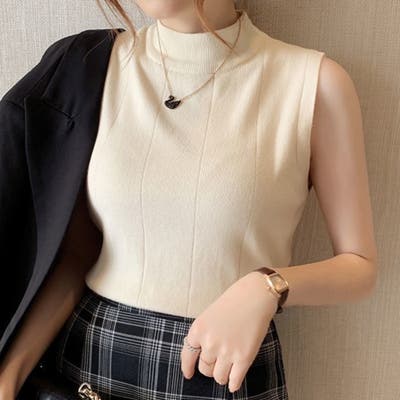 素材 | ハイネックノースリーブプリーツ ニットソー サマーニット ニットタンクトップ トップス 洗える 春夏新作 タートルネック 韓国ファッションニット リブニット キャミソール シンプルタンクトップ |