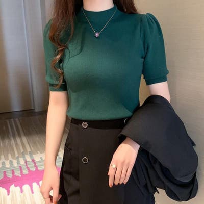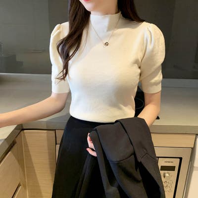パワーショルダーリブニットさらっとした肌ざわり サマーニット ハーフタートルネック