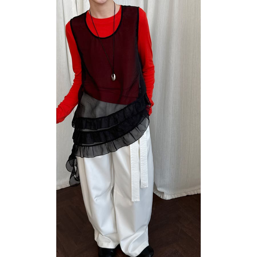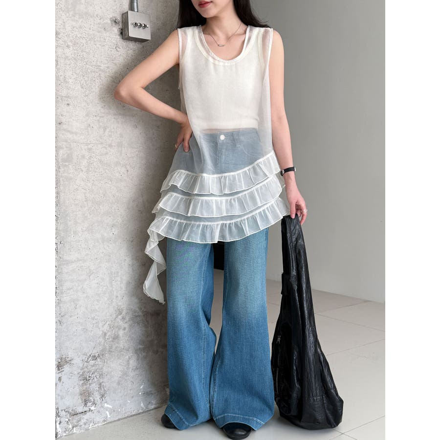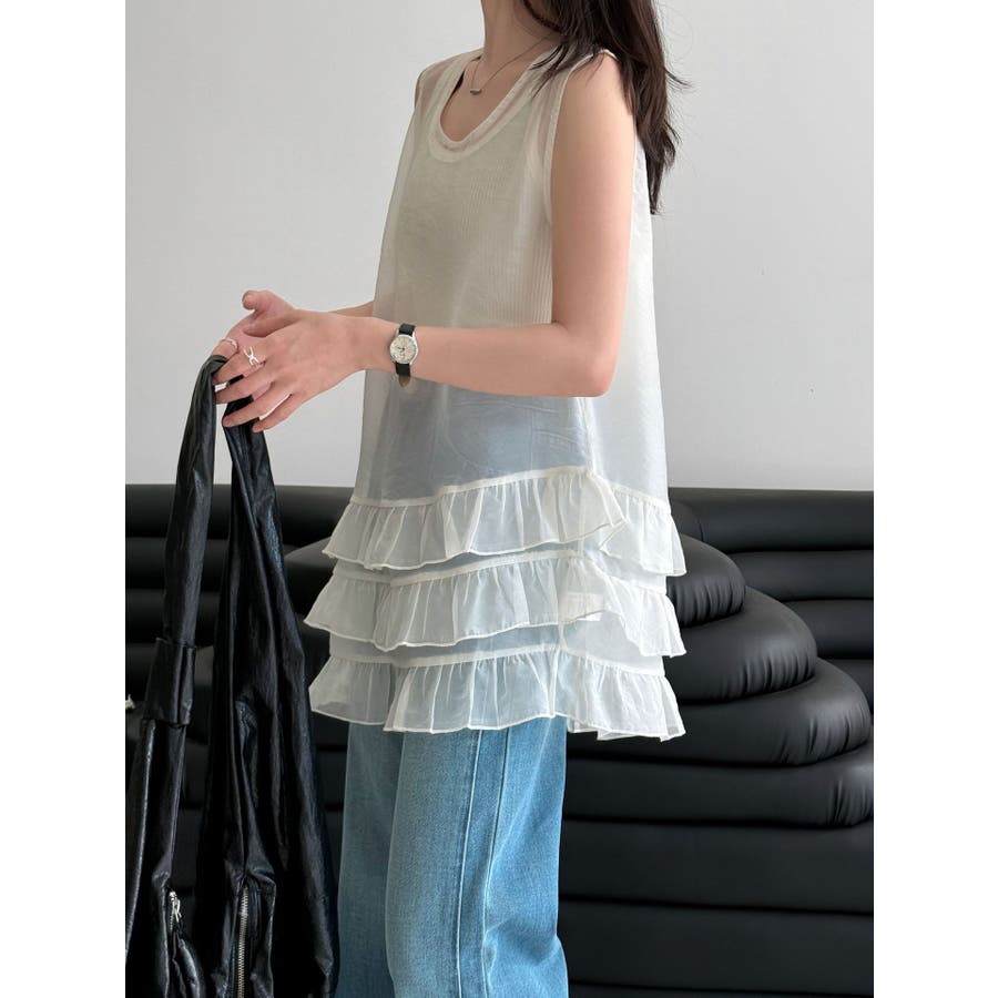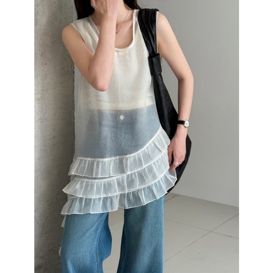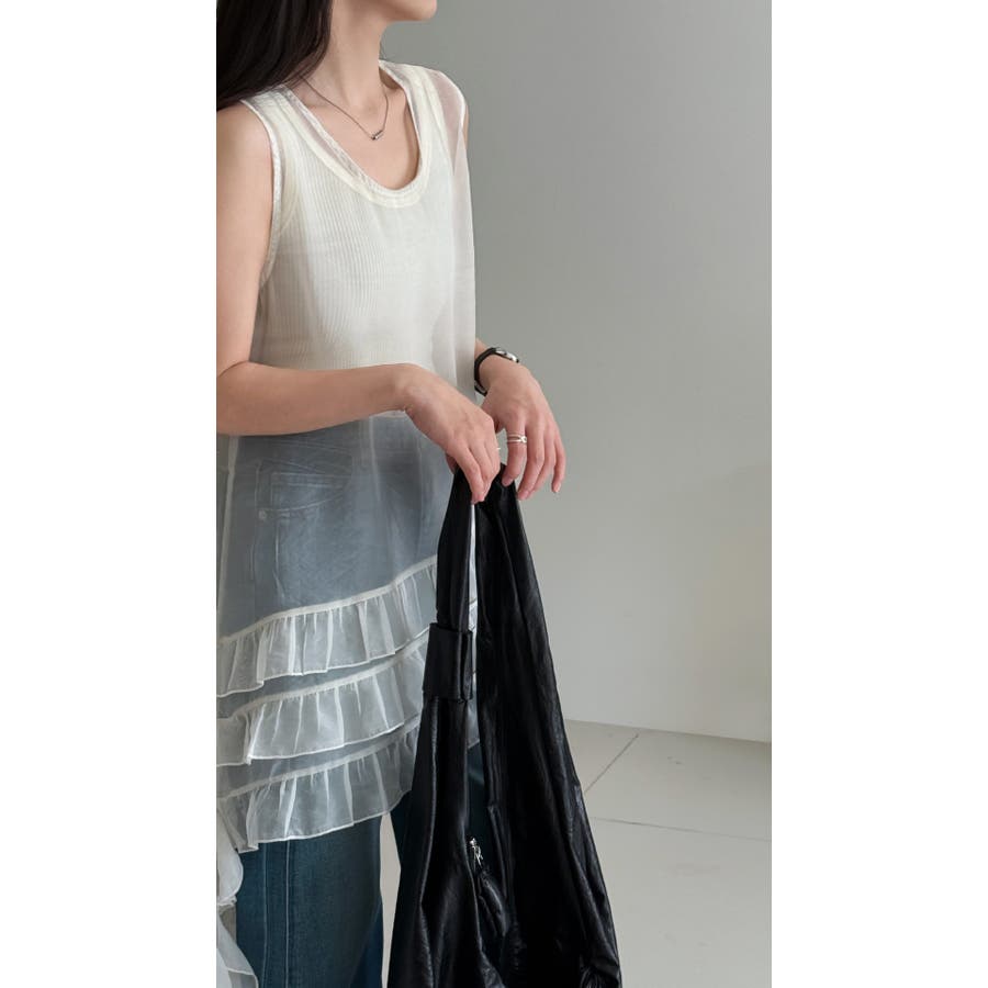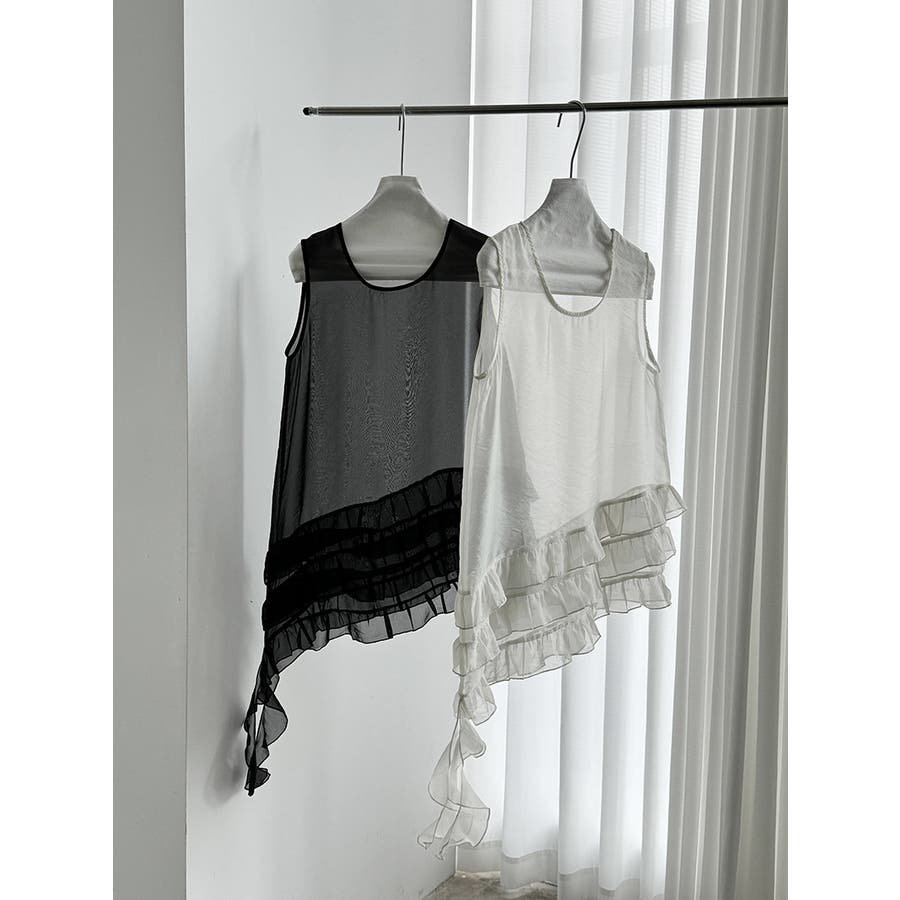 フレンチ アシメフリル ノースリーブ トップス