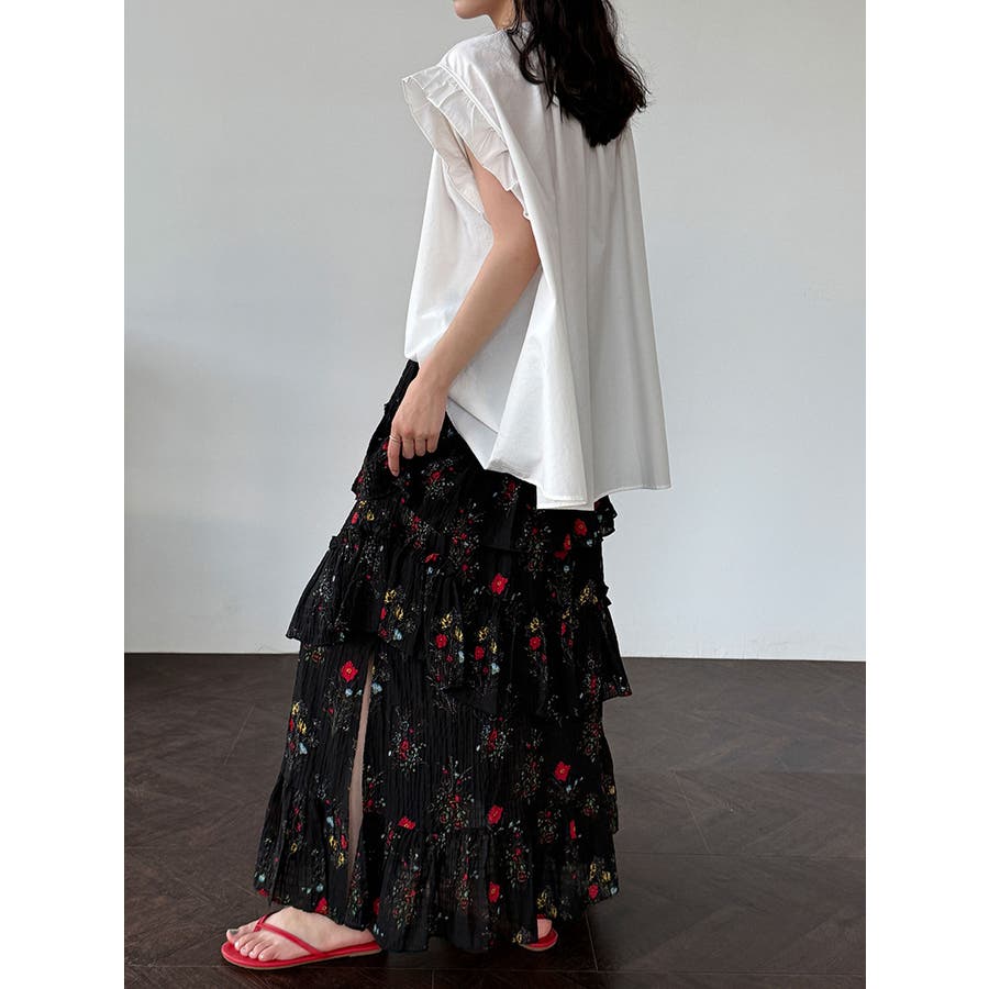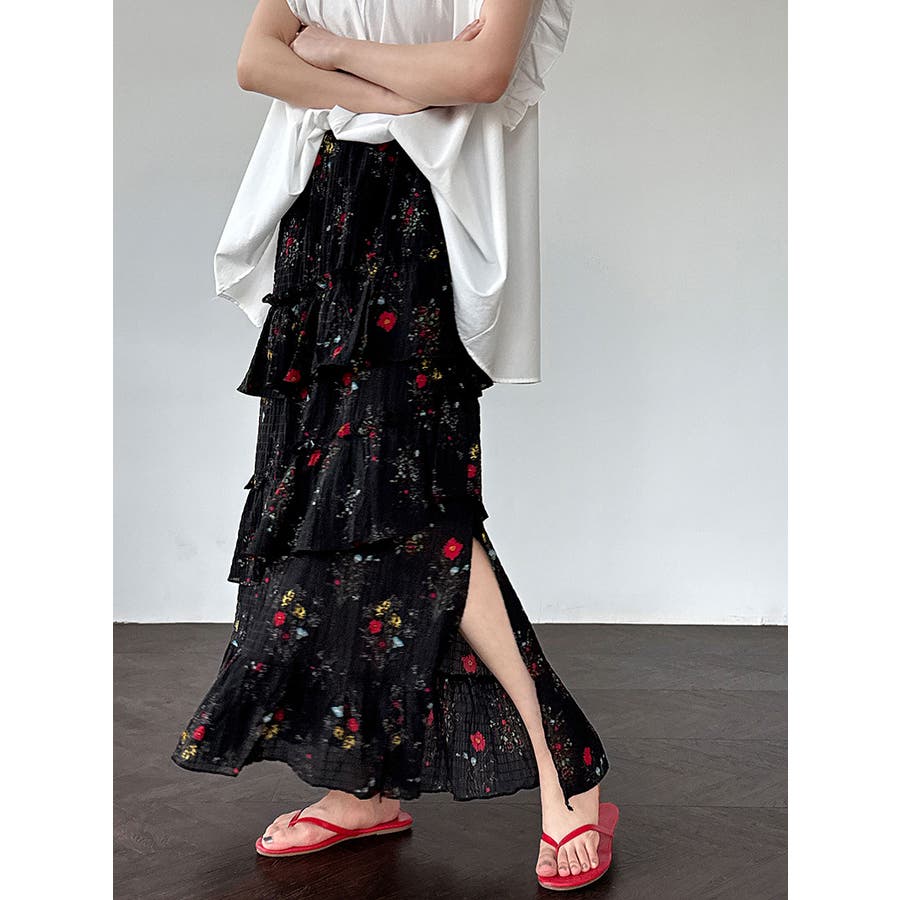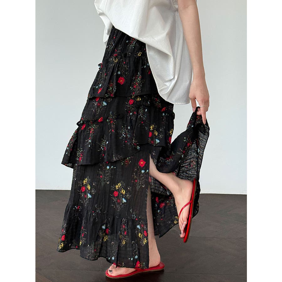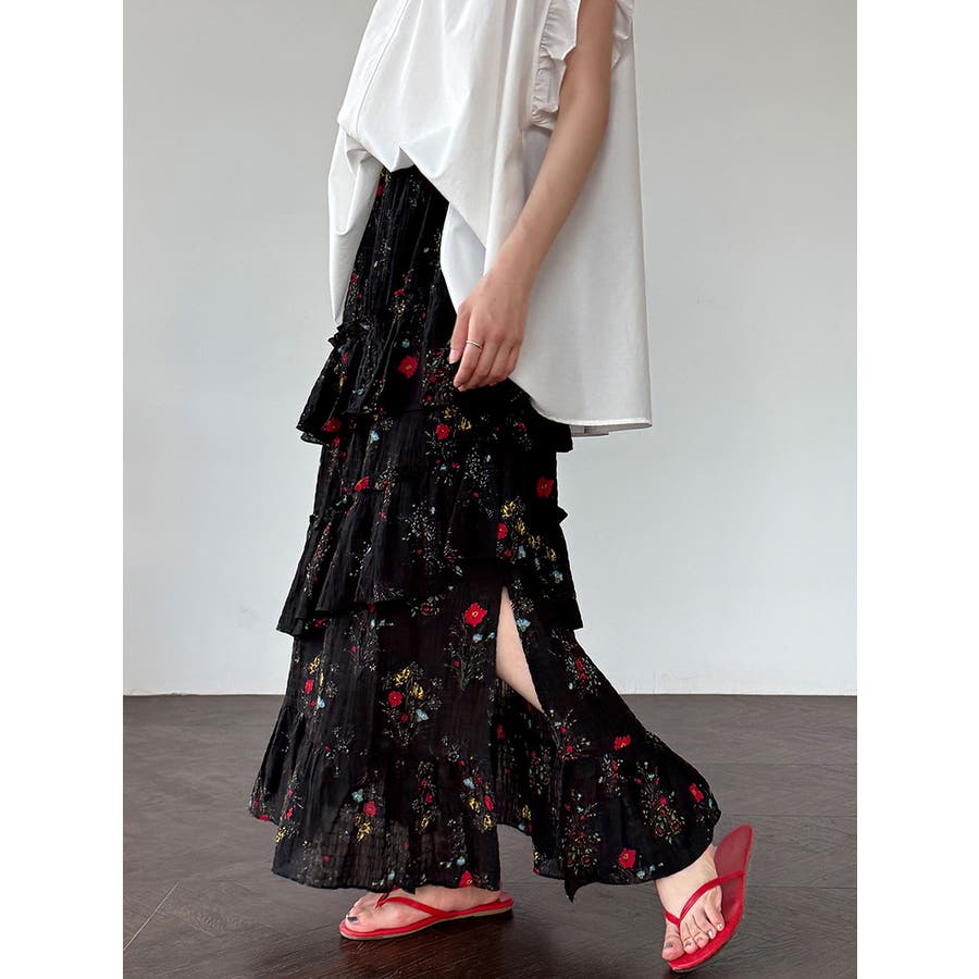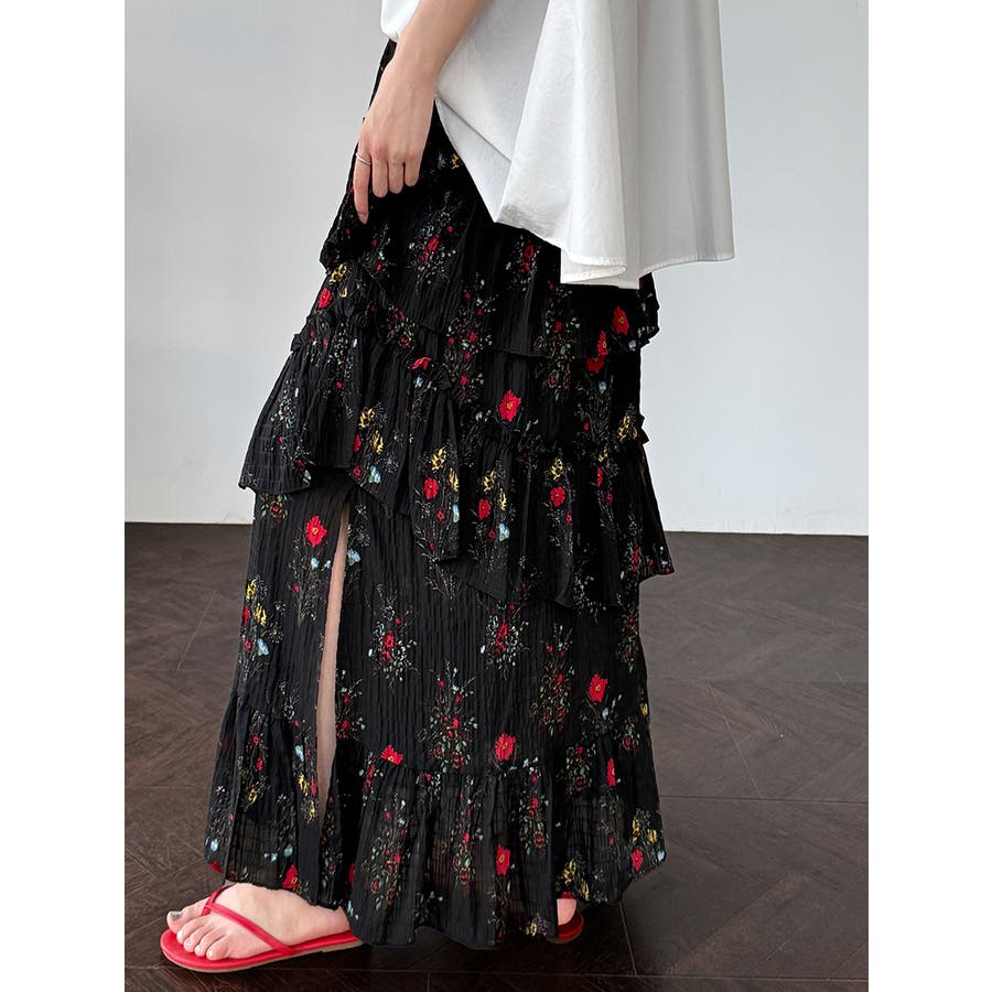 フラワープリント ティアードスカート スリット入り