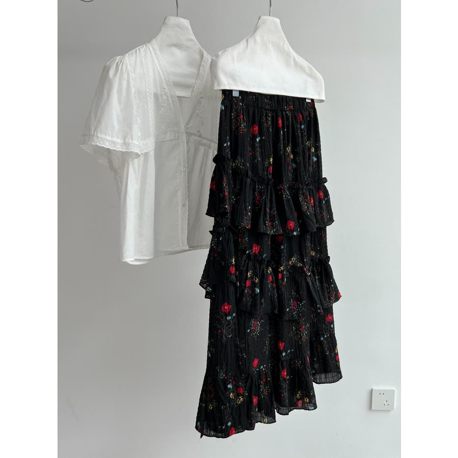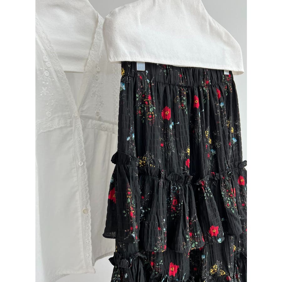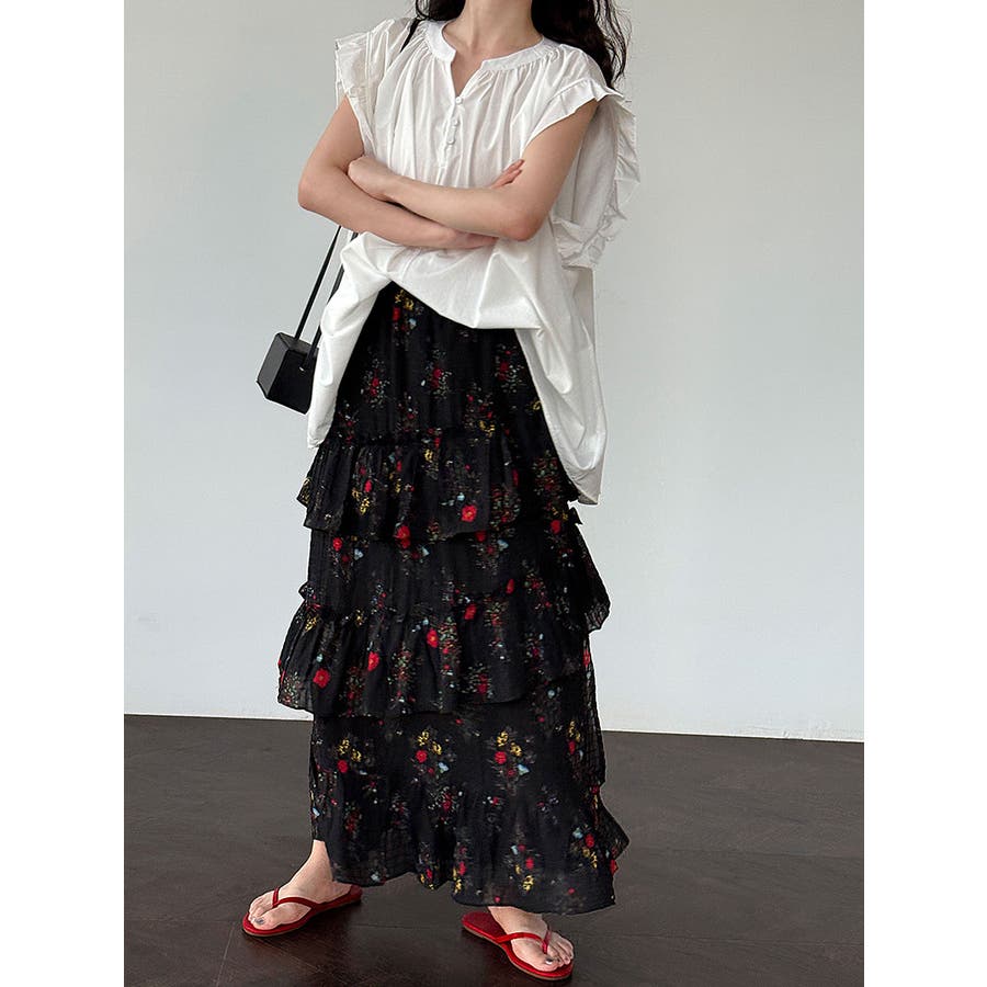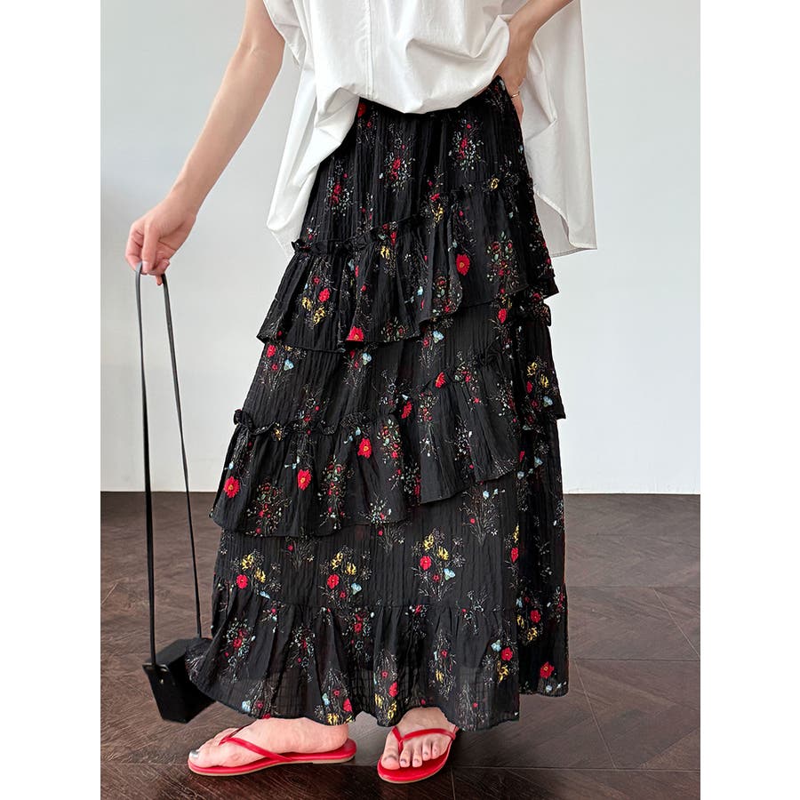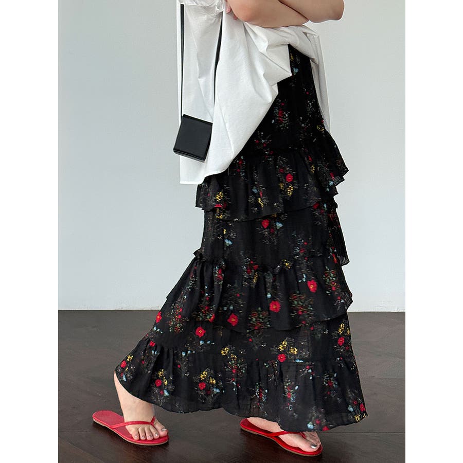 フラワープリント ティアードスカート スリット入り