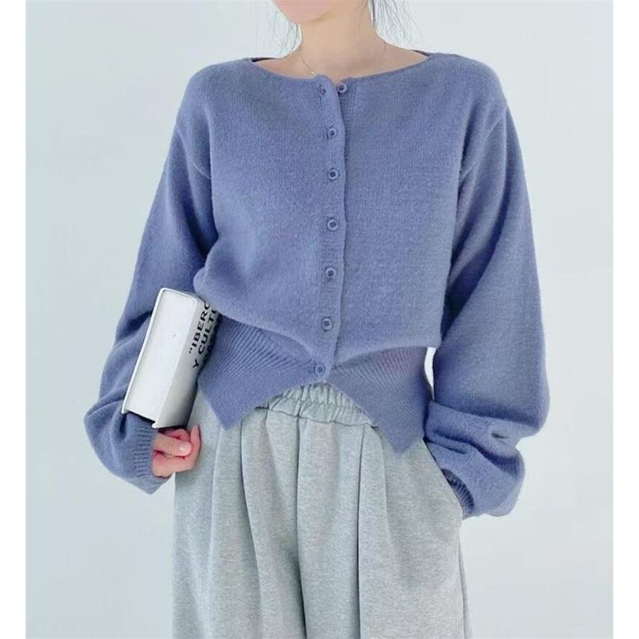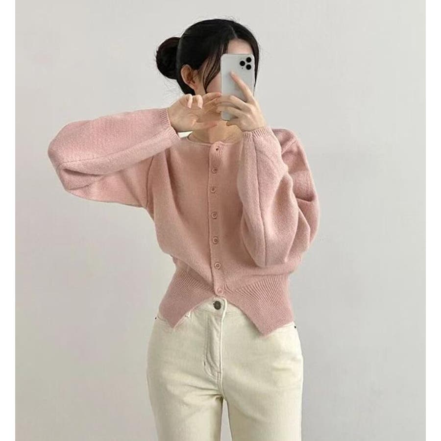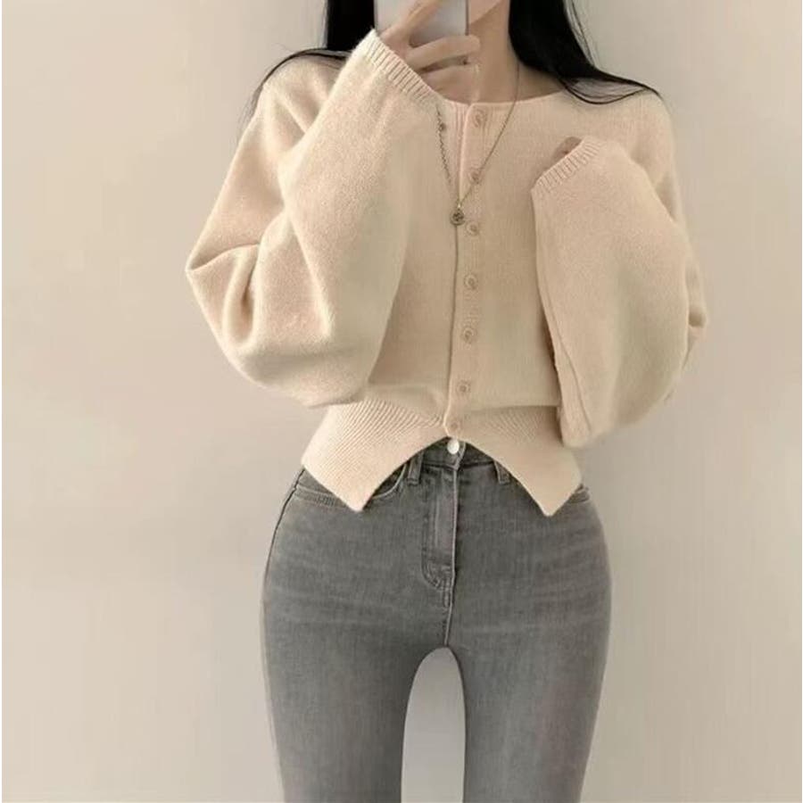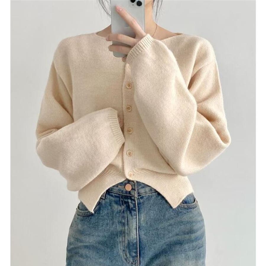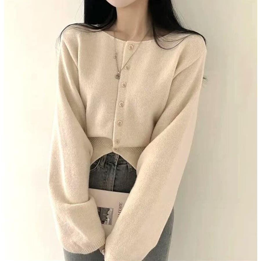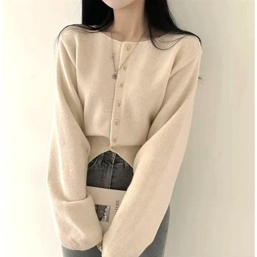 【ベージュ】丸ネック ボタン ショートニットカーディガン