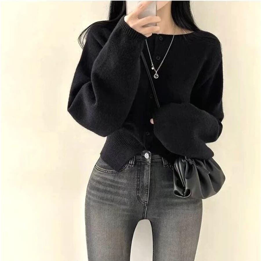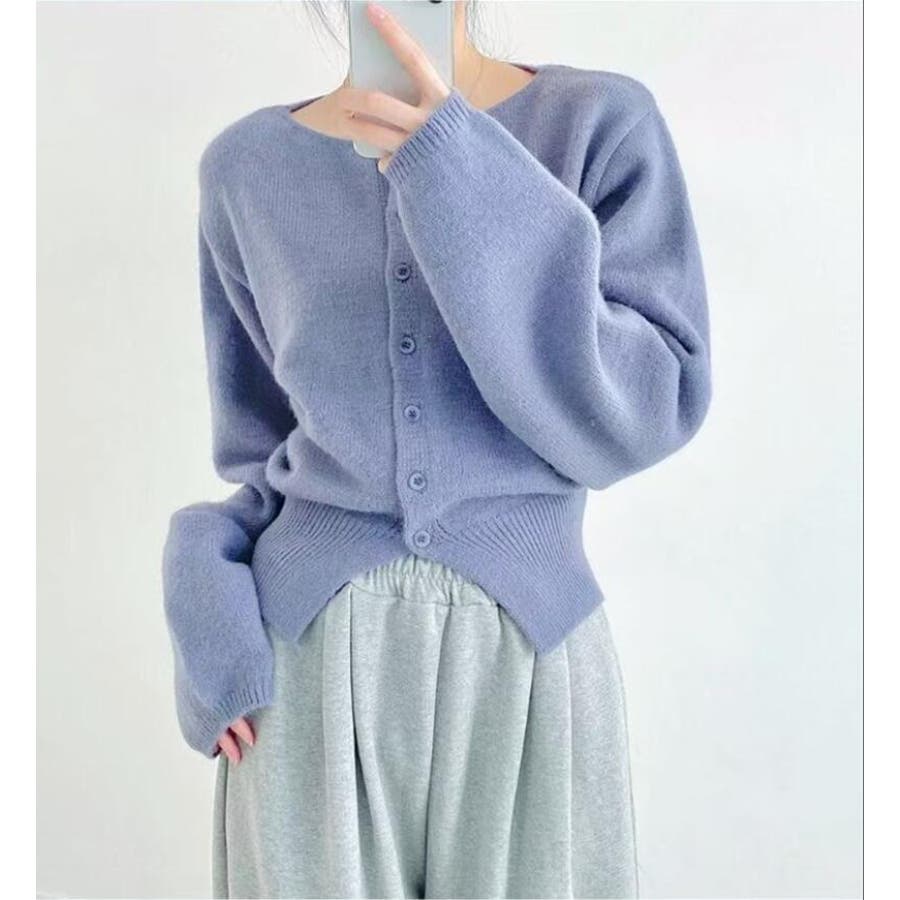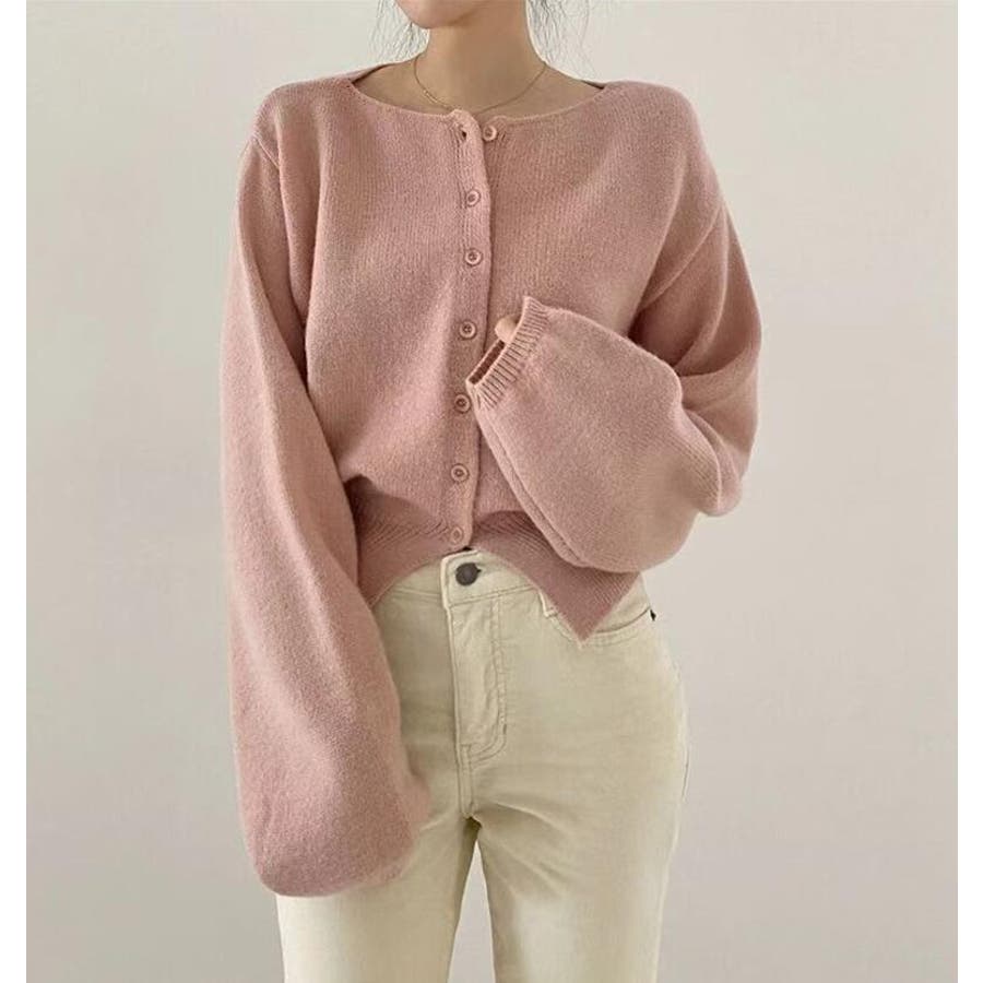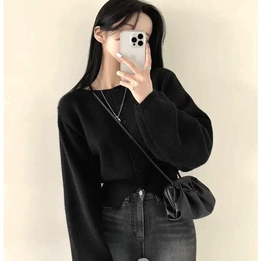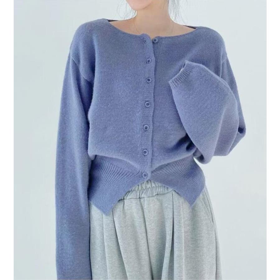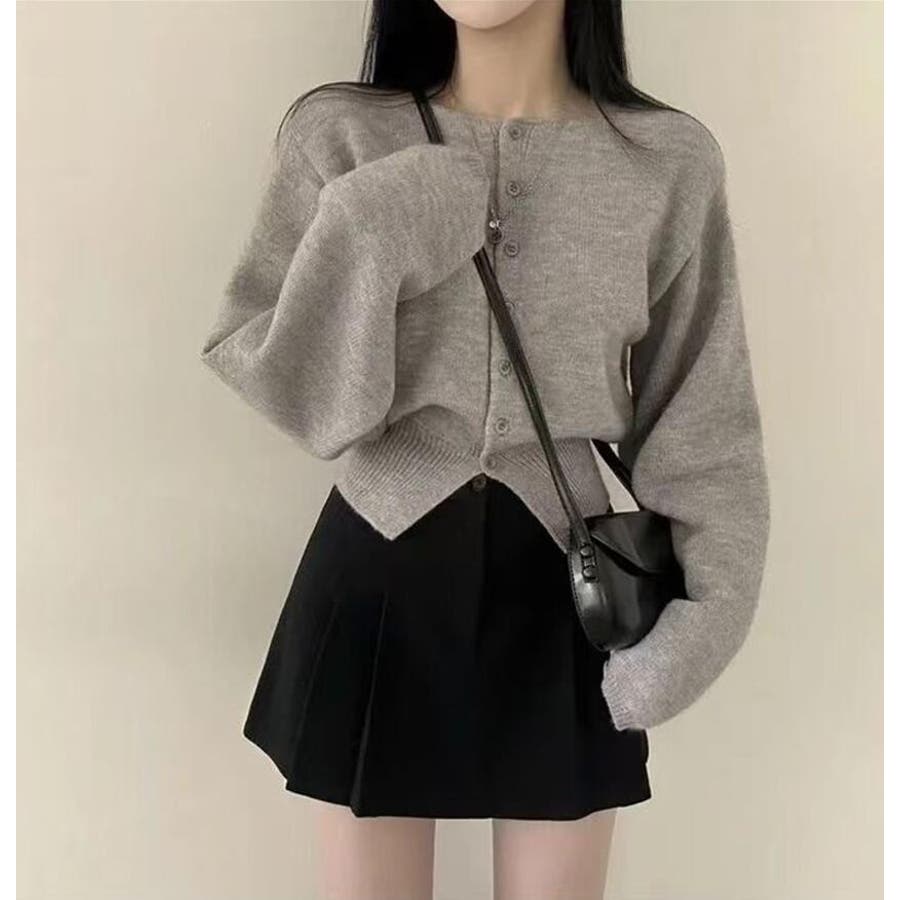 【ベージュ】丸ネック ボタン ショートニットカーディガン