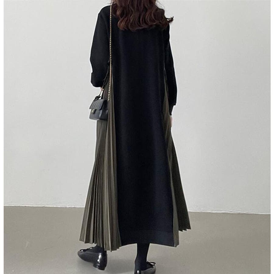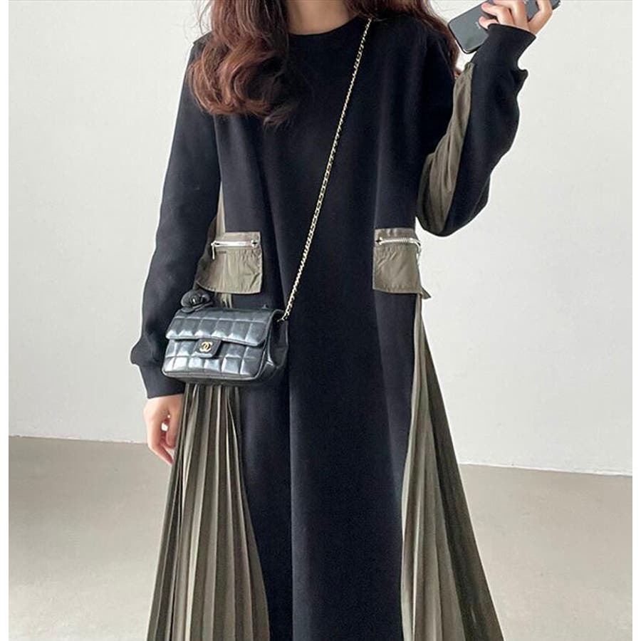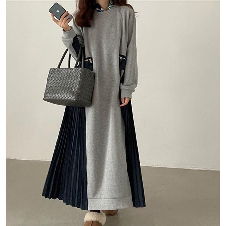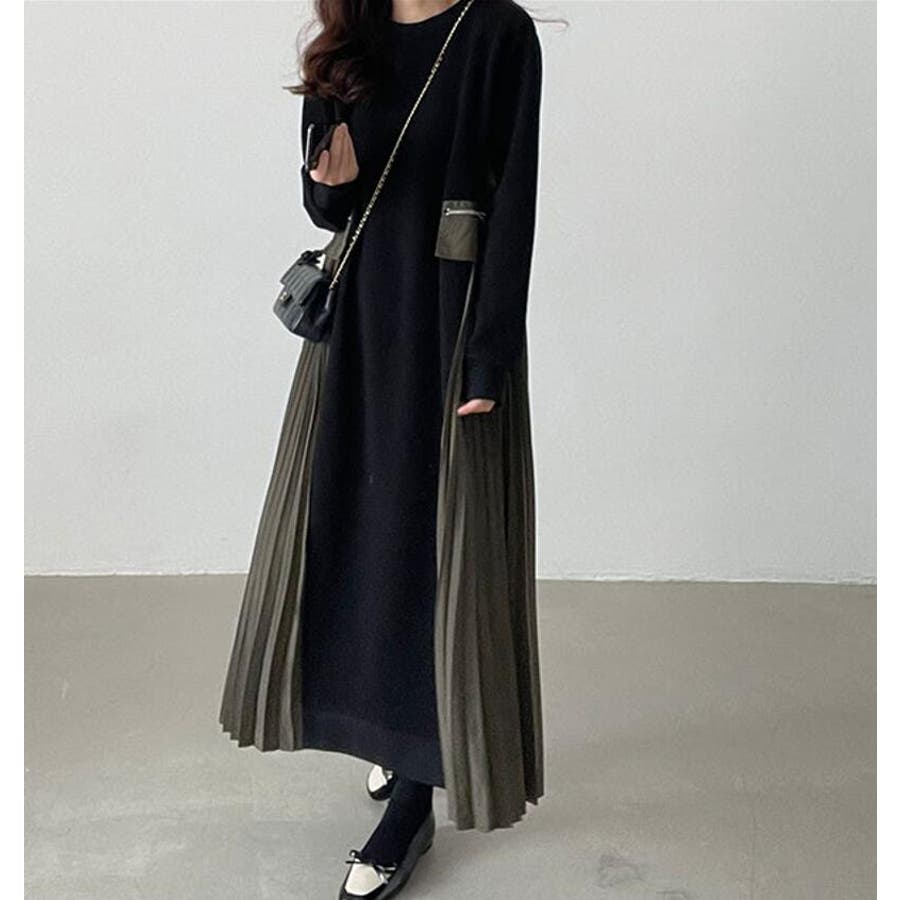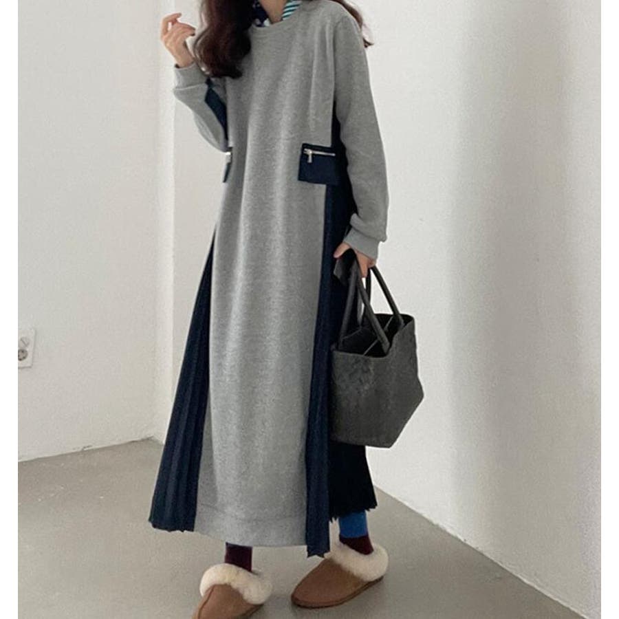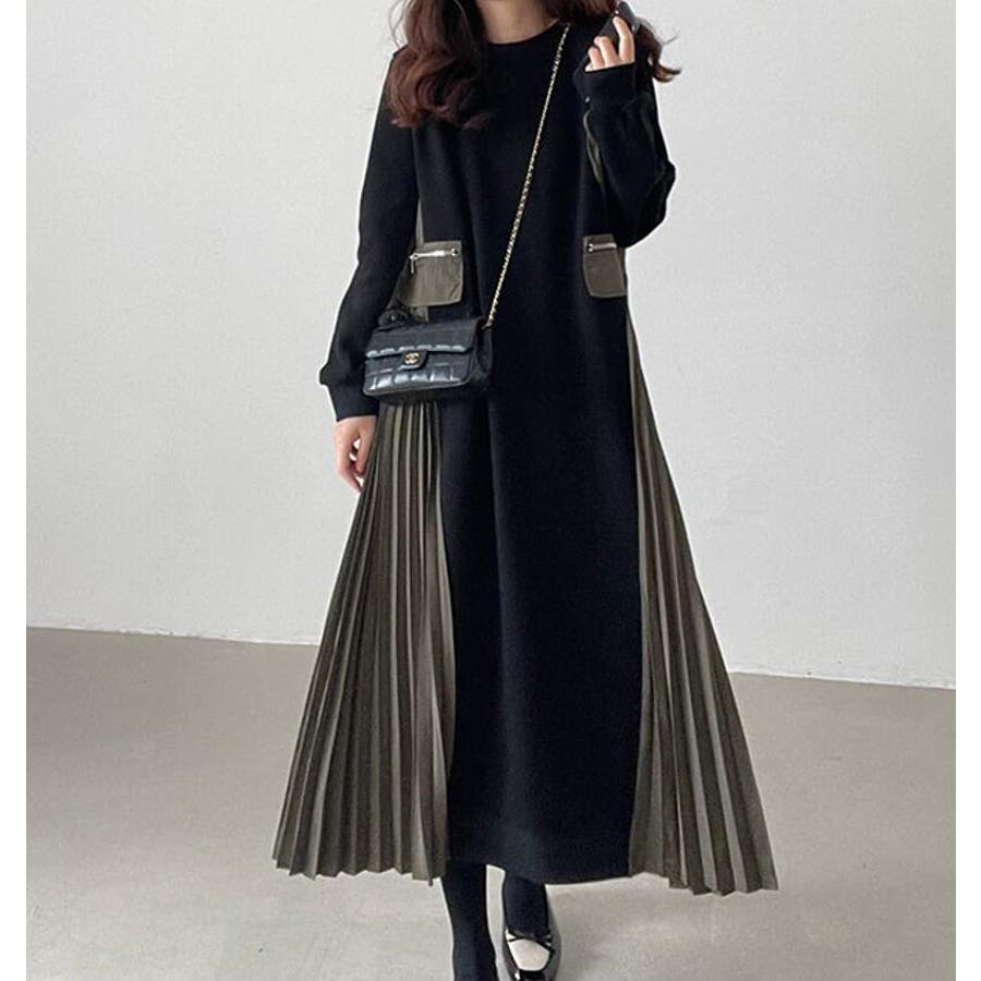 パッチワーク プリーツ ポケット付き ロングスリーブ ワンピース