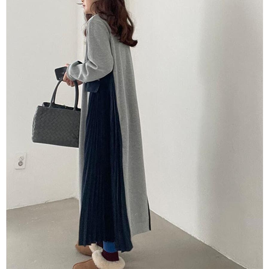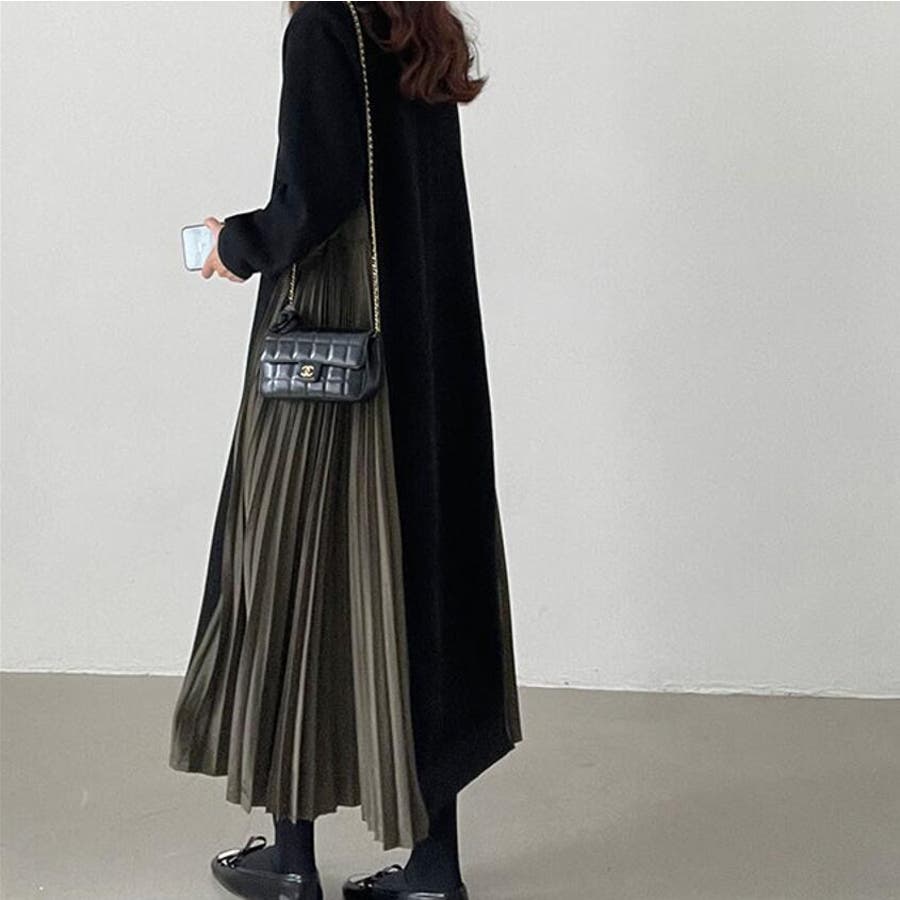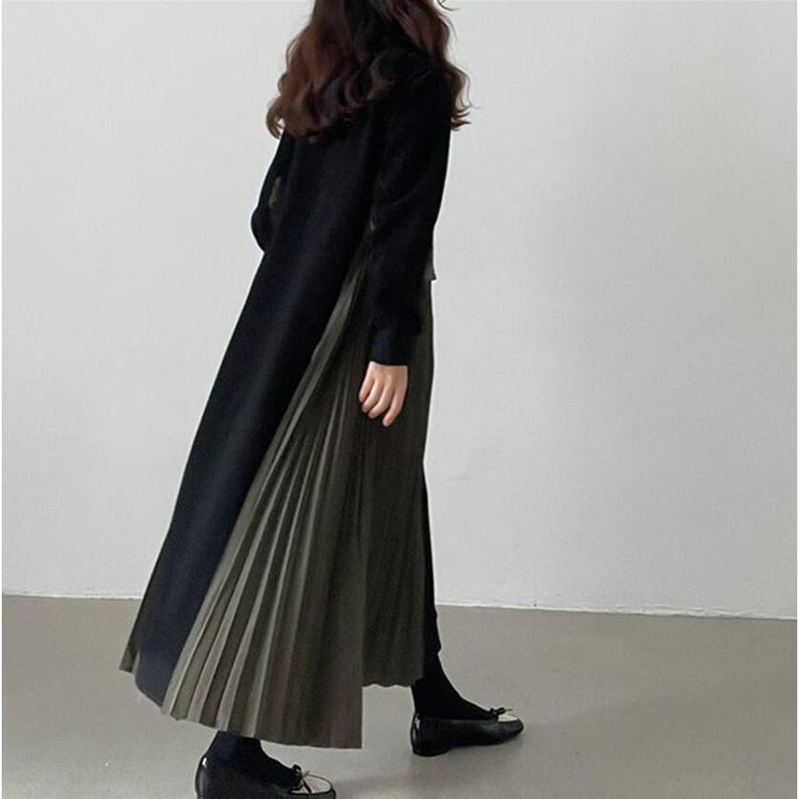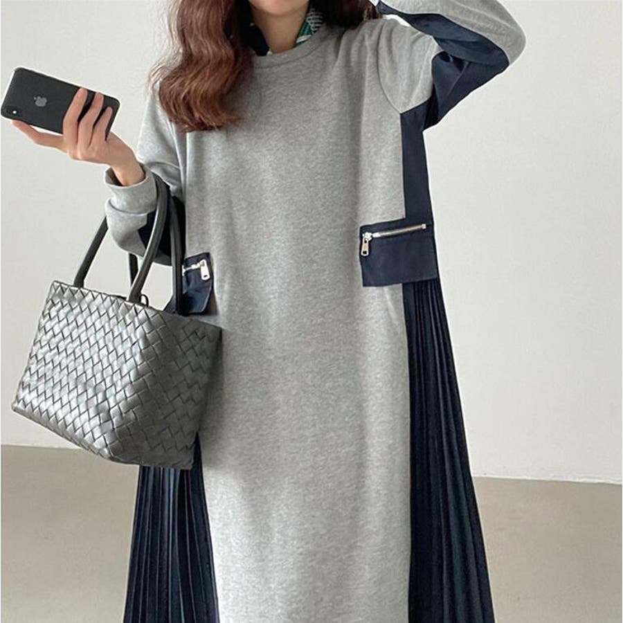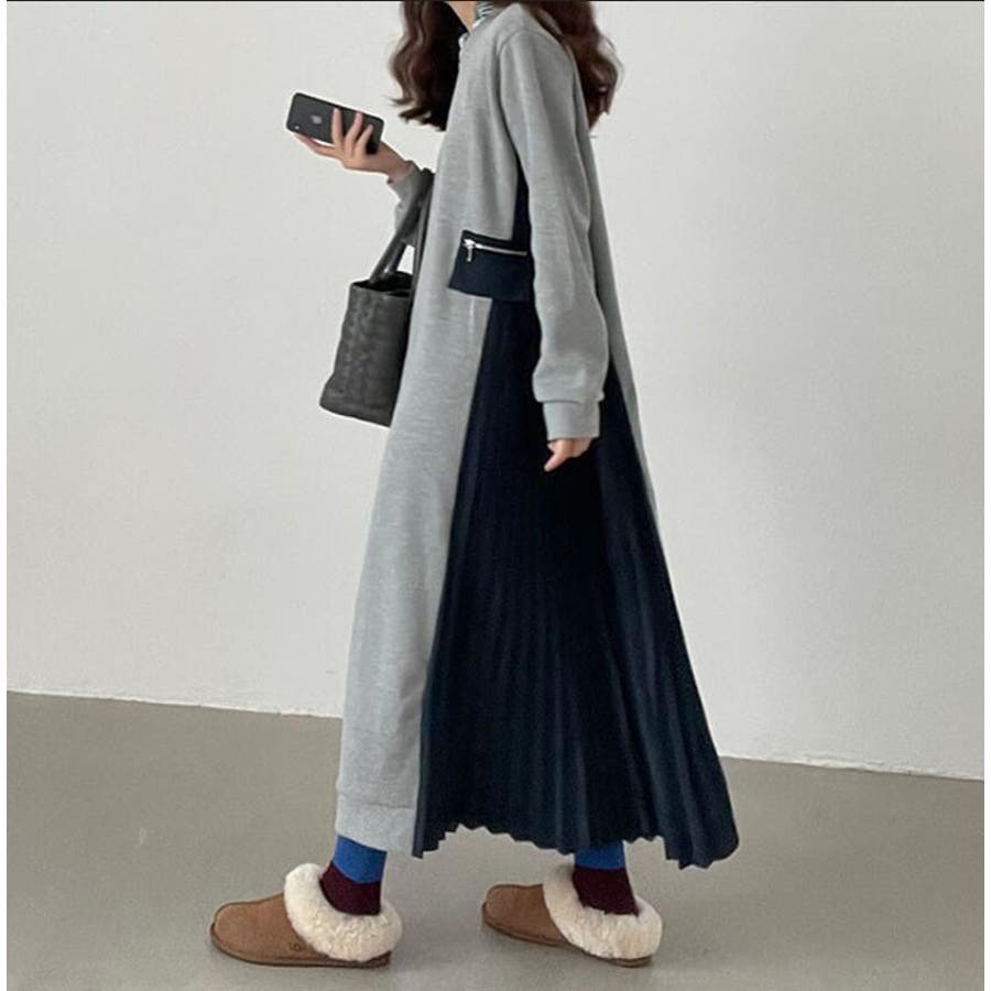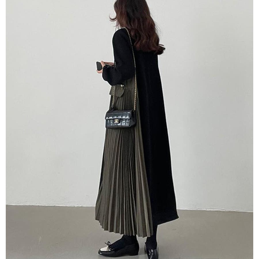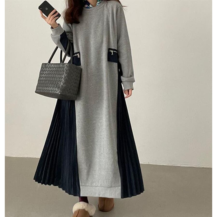 パッチワーク プリーツ ポケット付き ロングスリーブ ワンピース