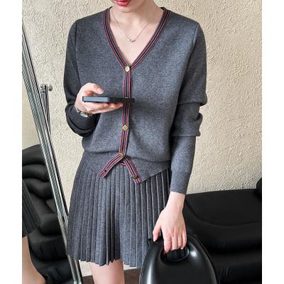 【ネイビー】ボーダーラインアクセントの V ネックカーディガンとプリーツスカートセット