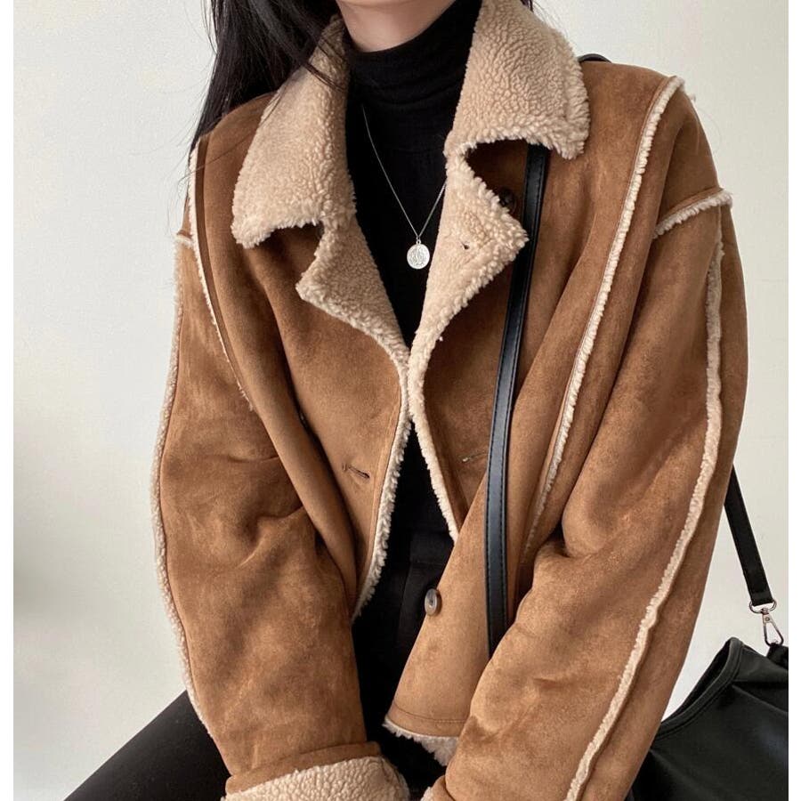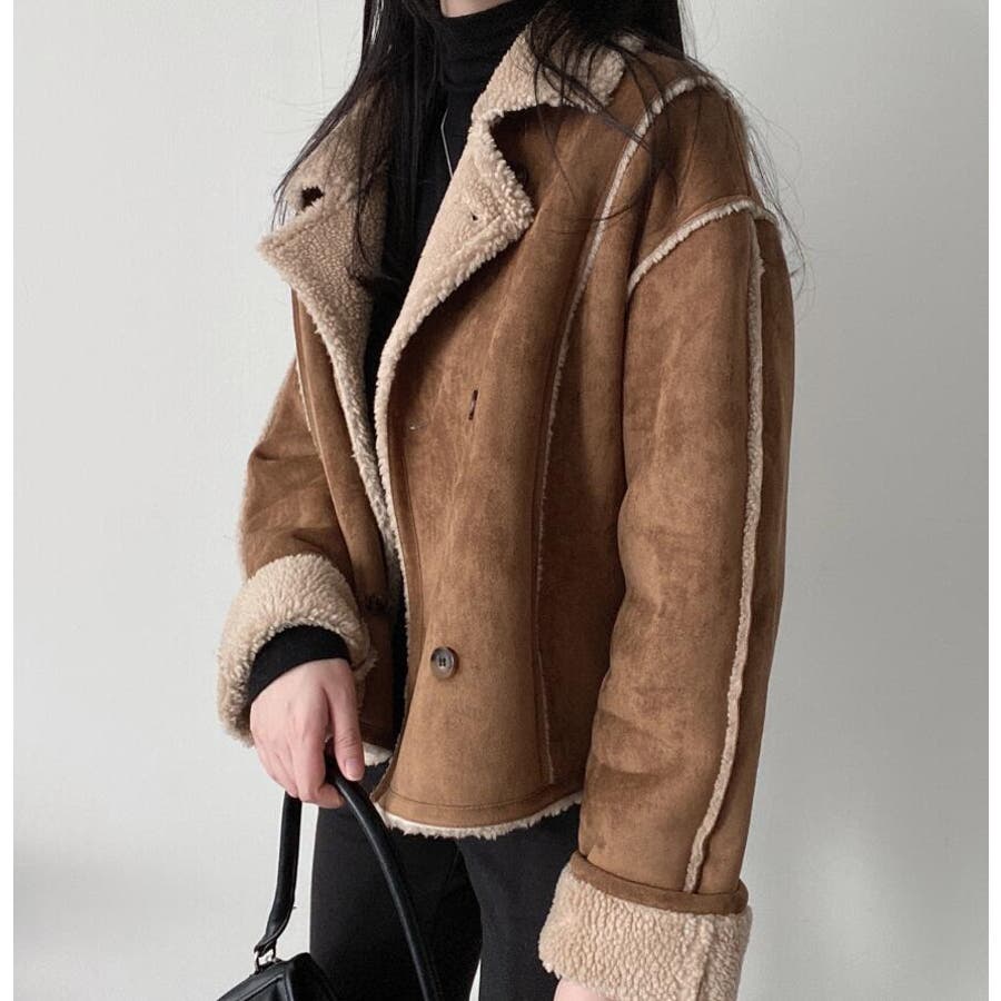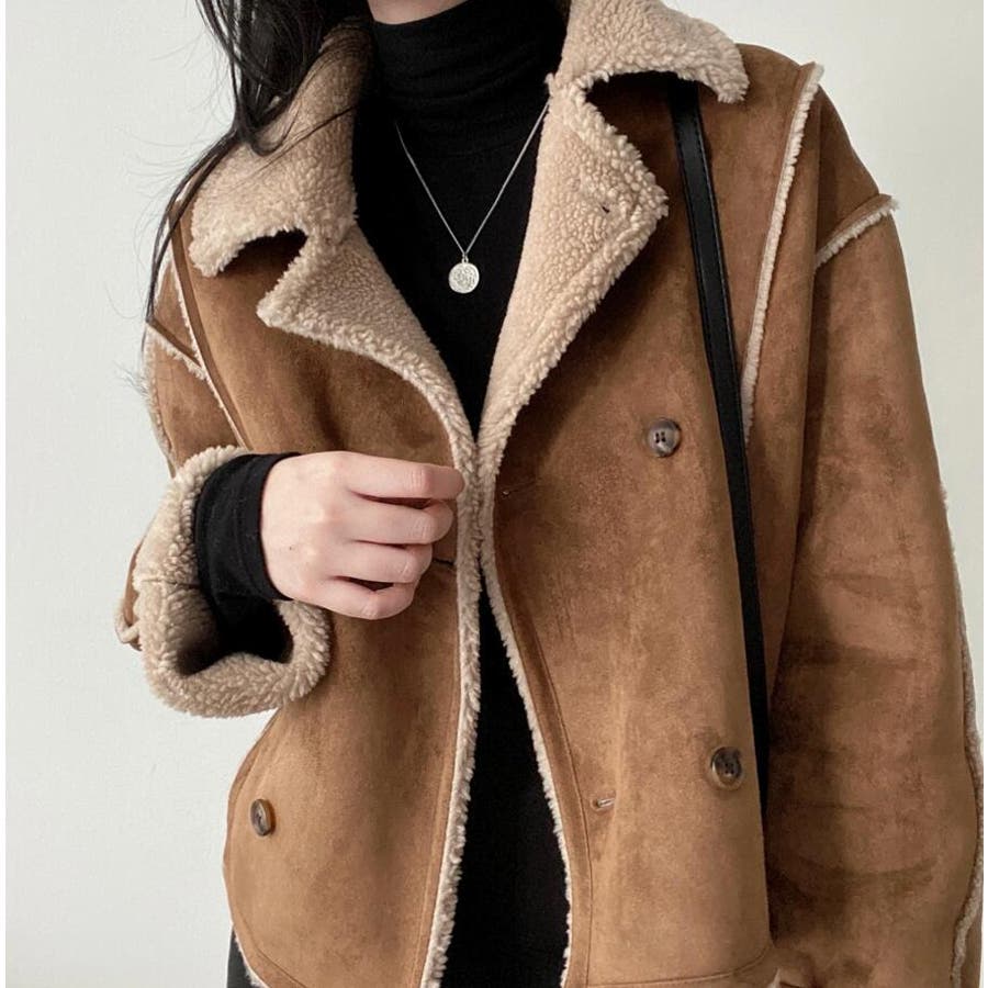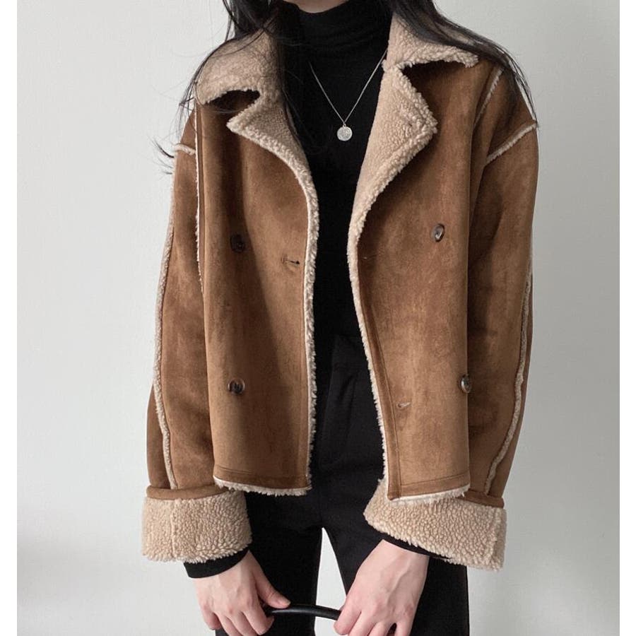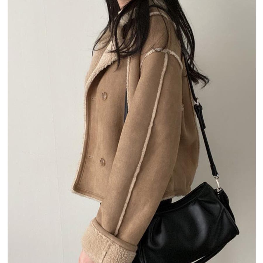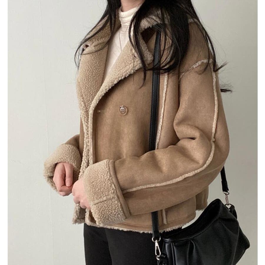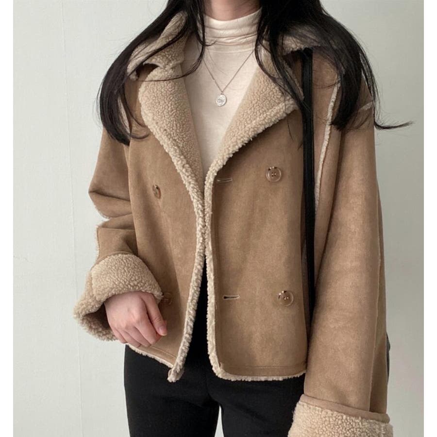 【ベージュ】ダブルブレストデザインのスエード調ボアコート