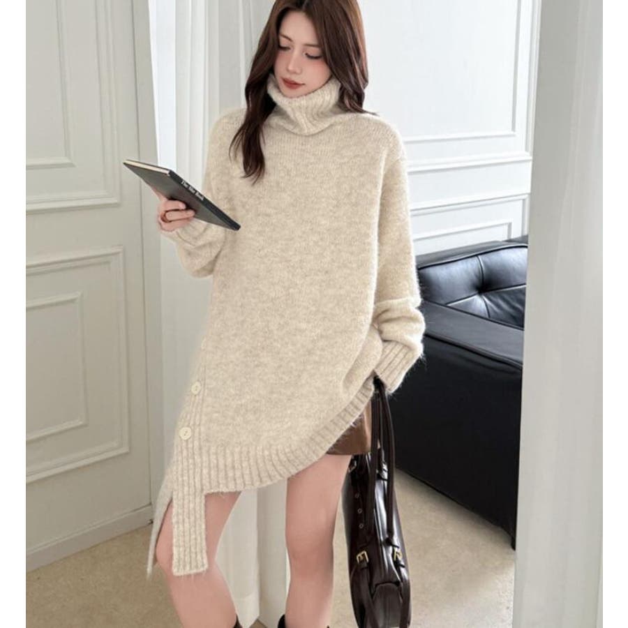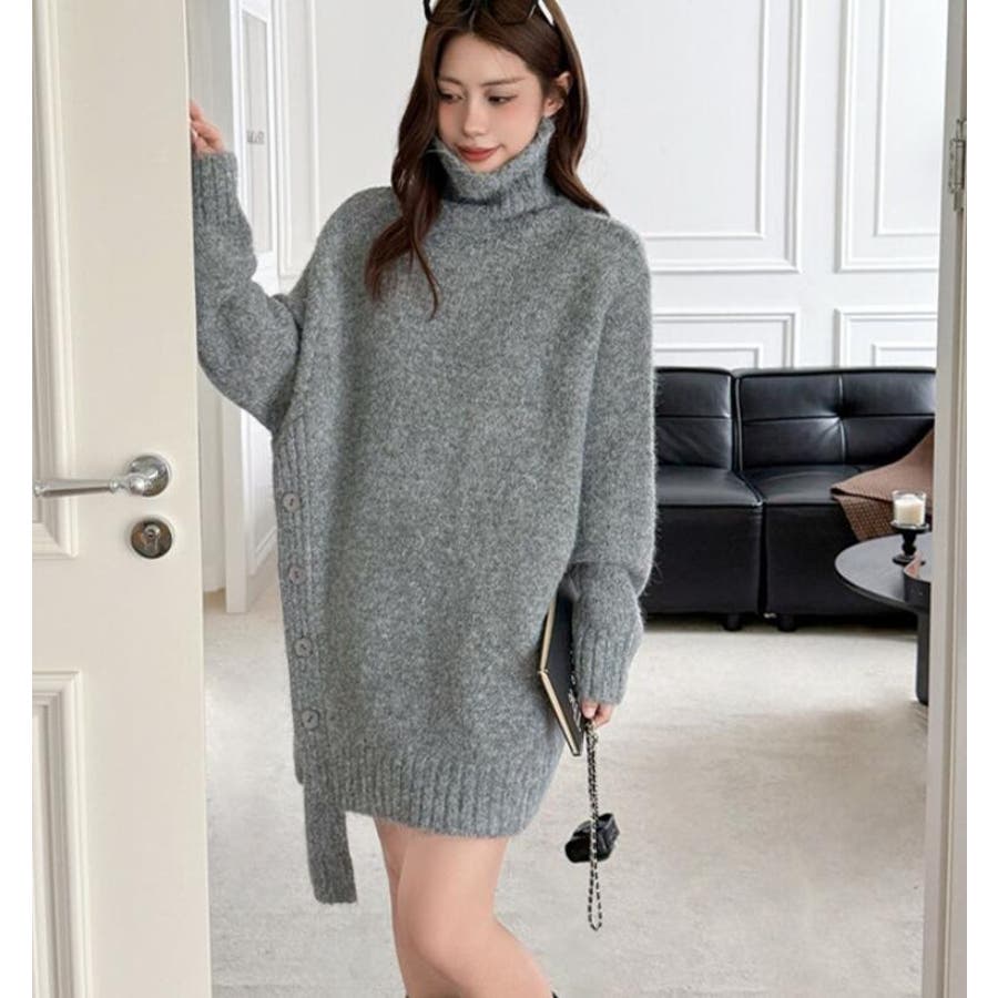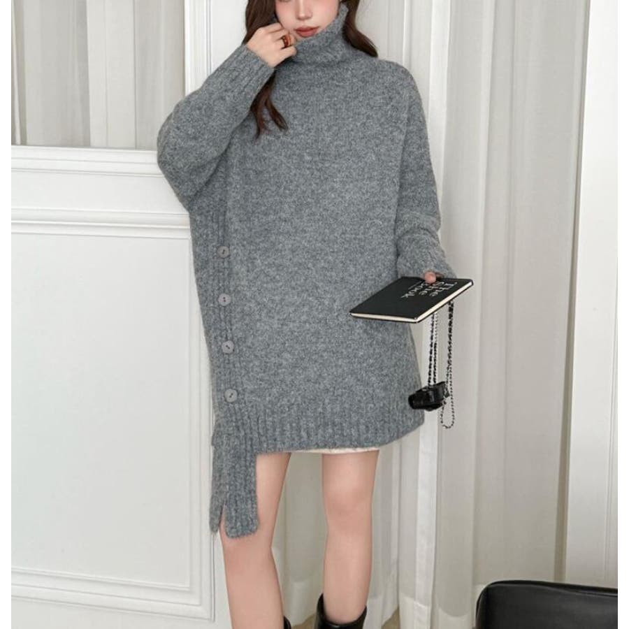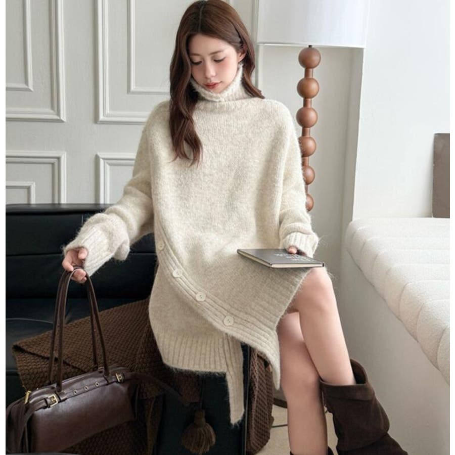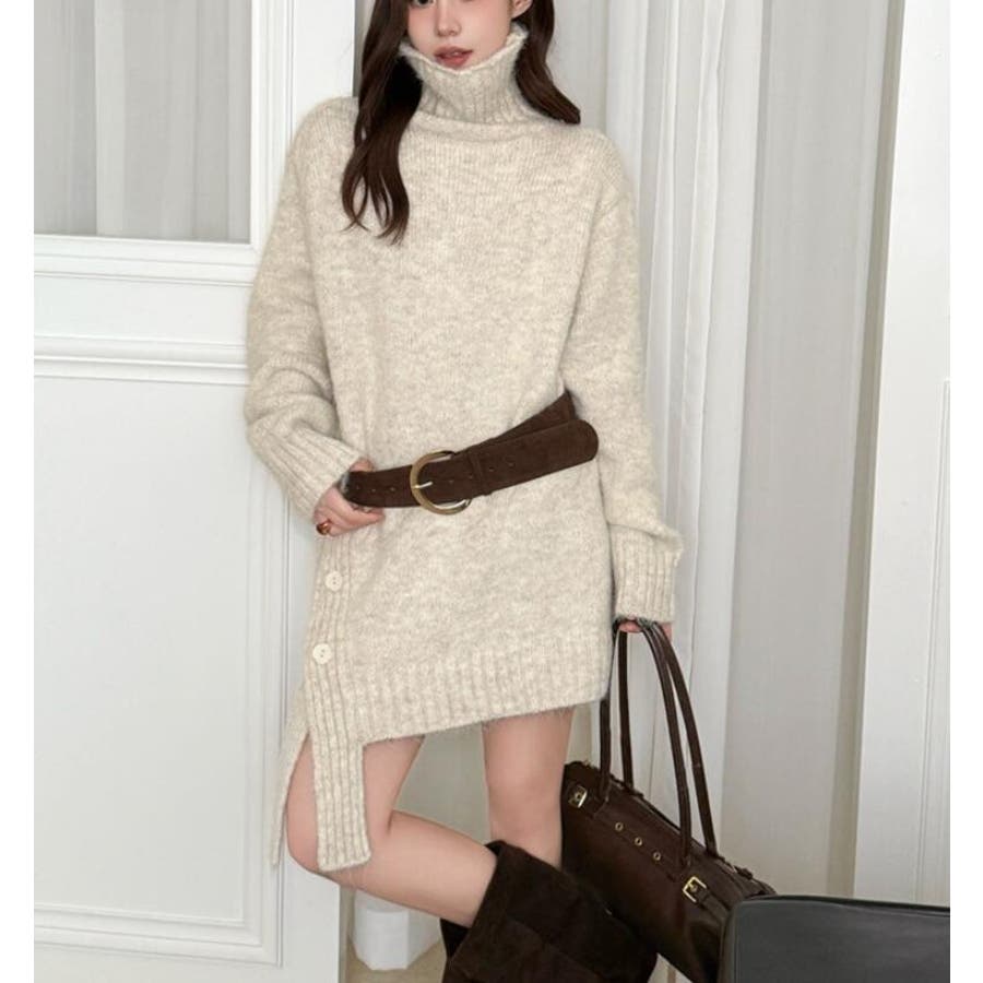不規則ボタンデザインのオーバーサイズハイネックニットワンピース