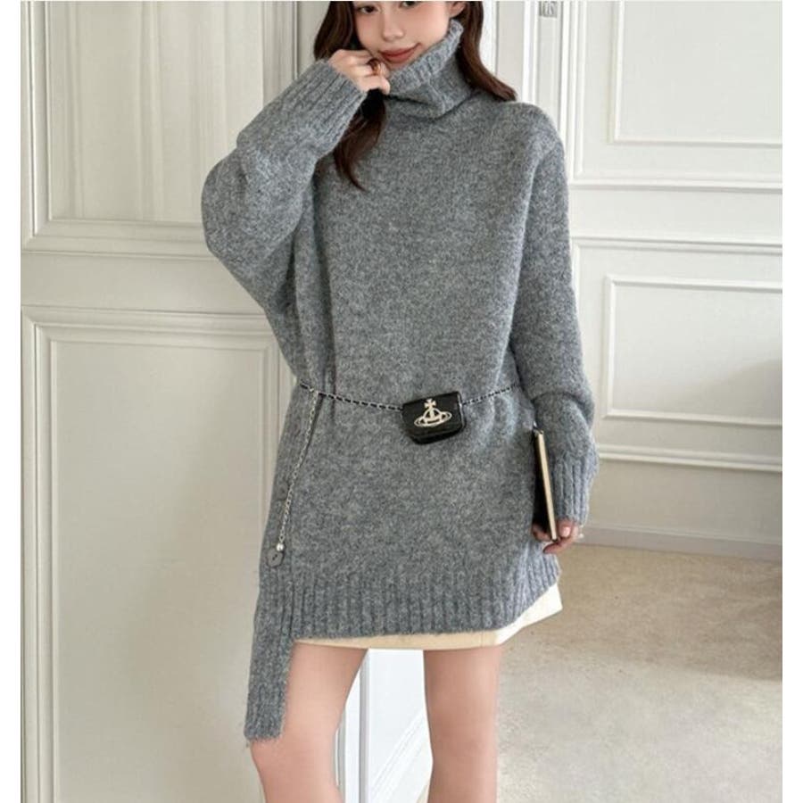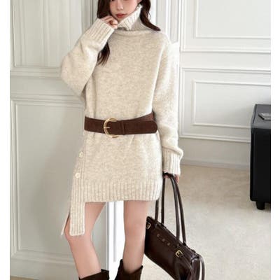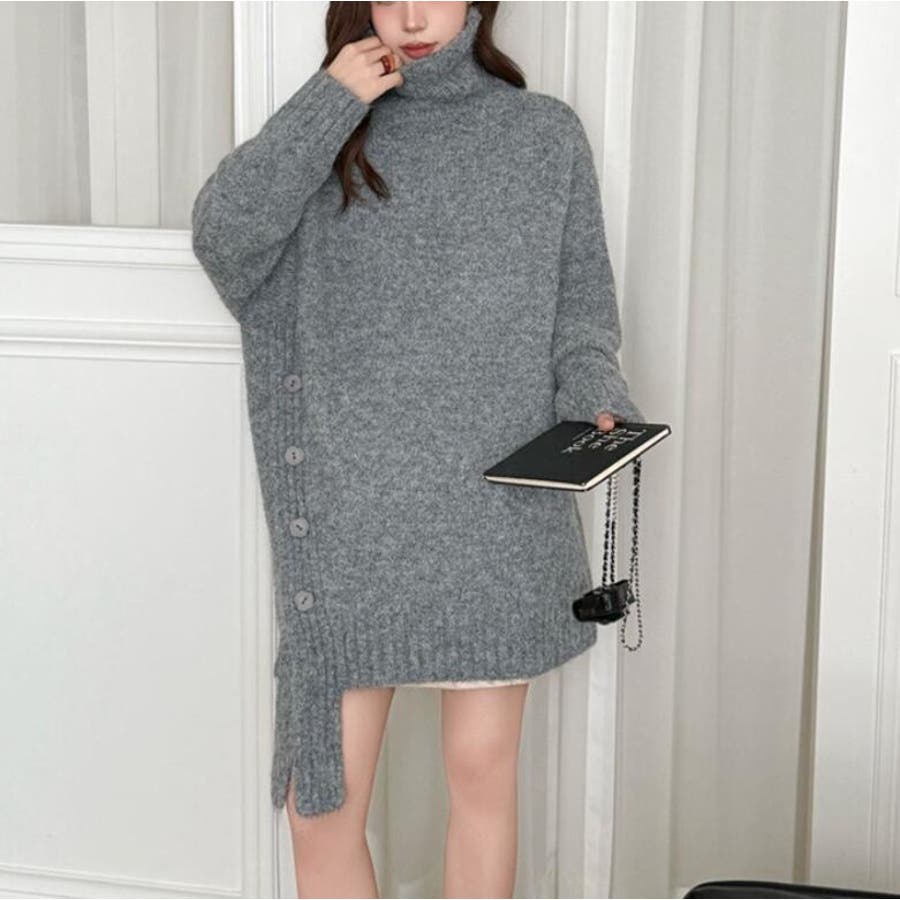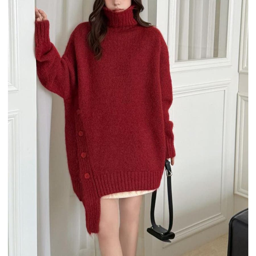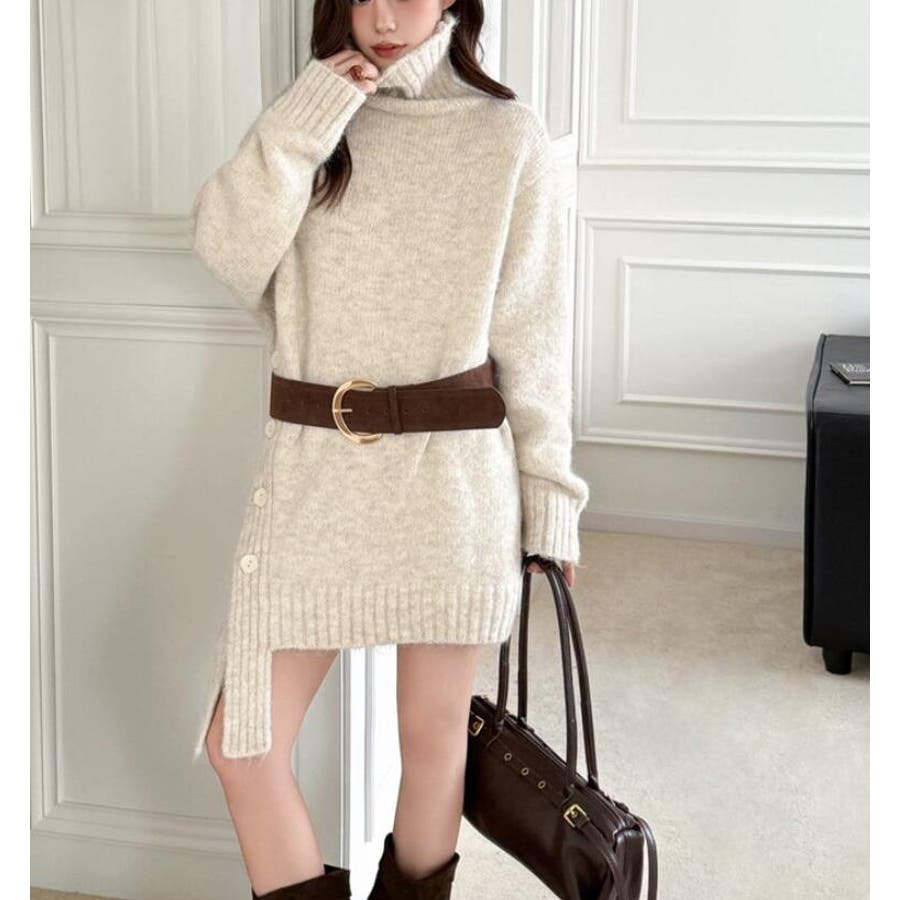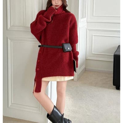 不規則ボタンデザインのオーバーサイズハイネックニットワンピース