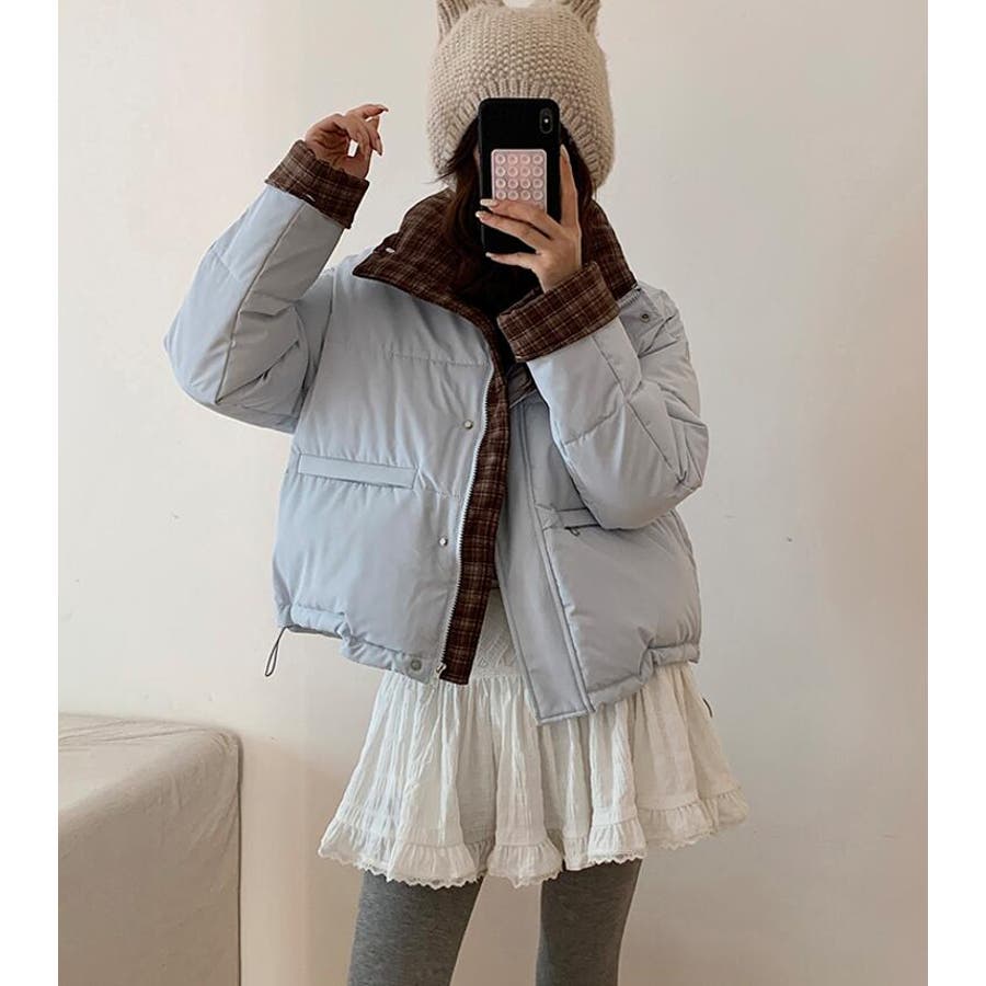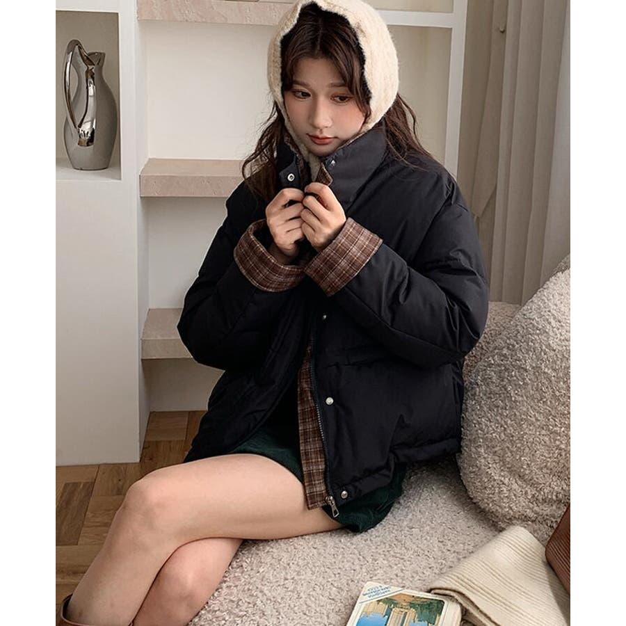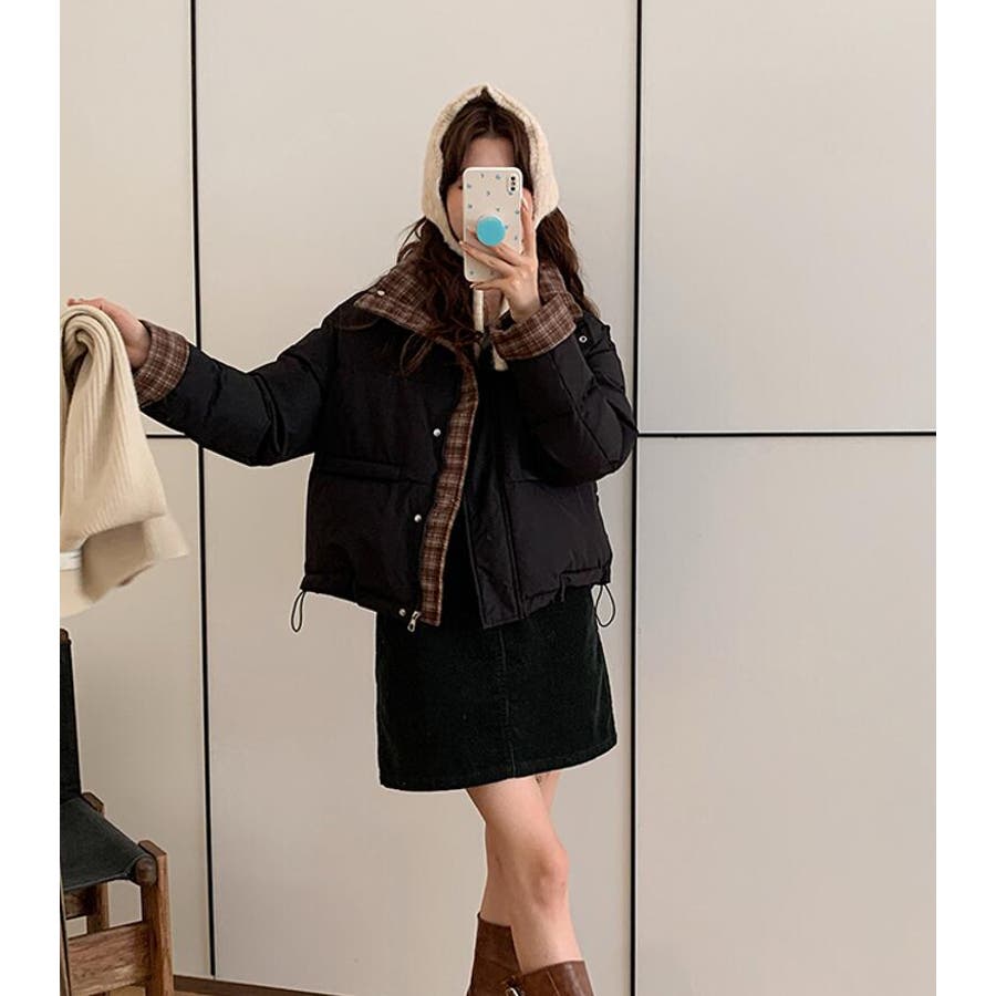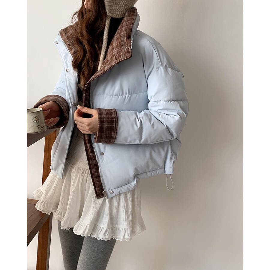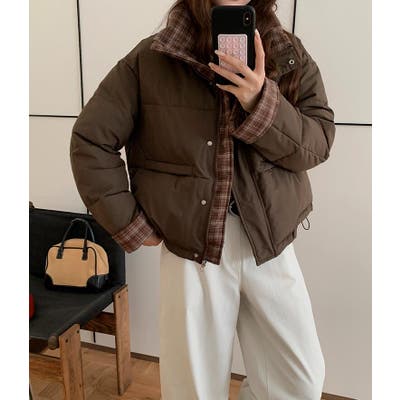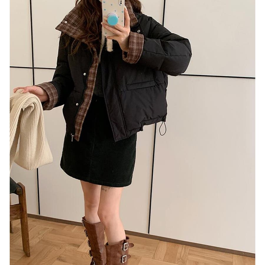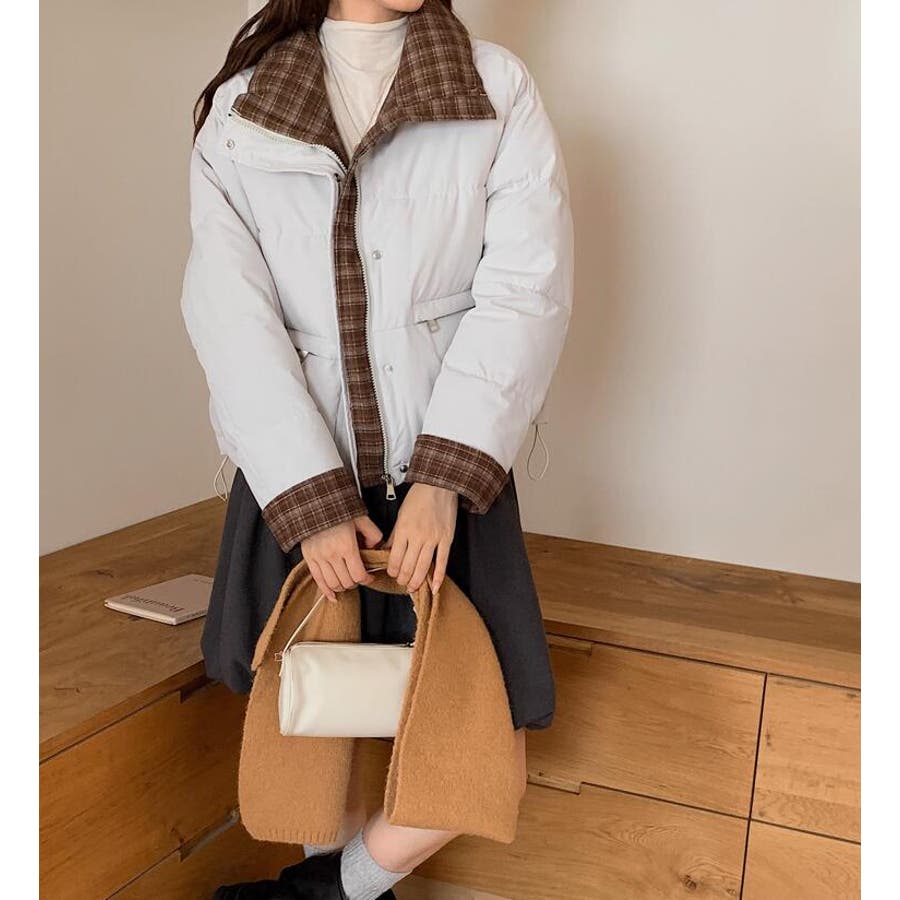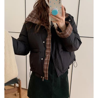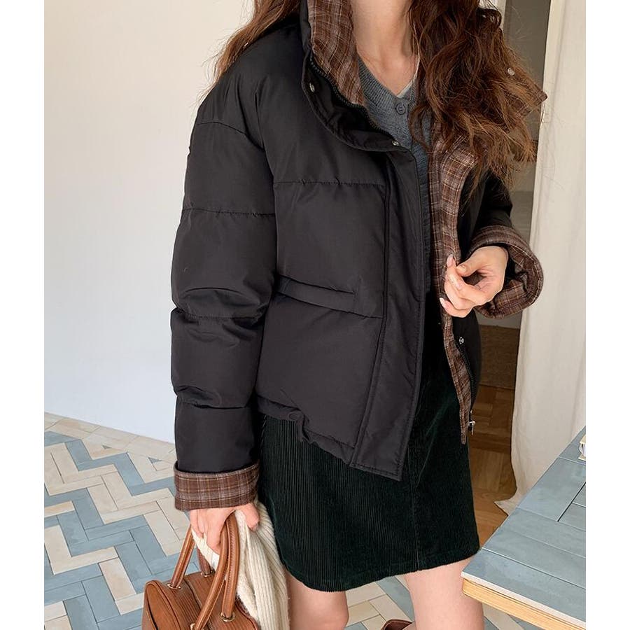 チェック裏地ダウンジャケット ハイネック