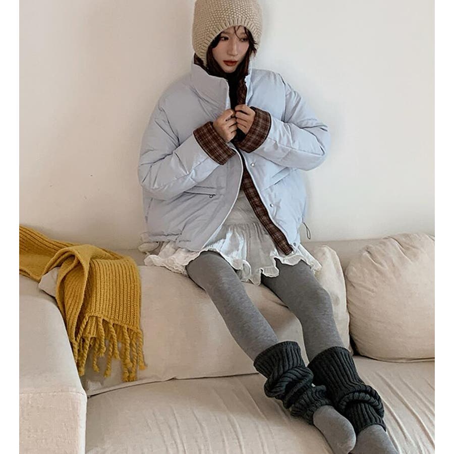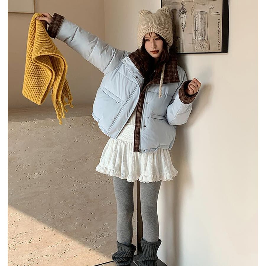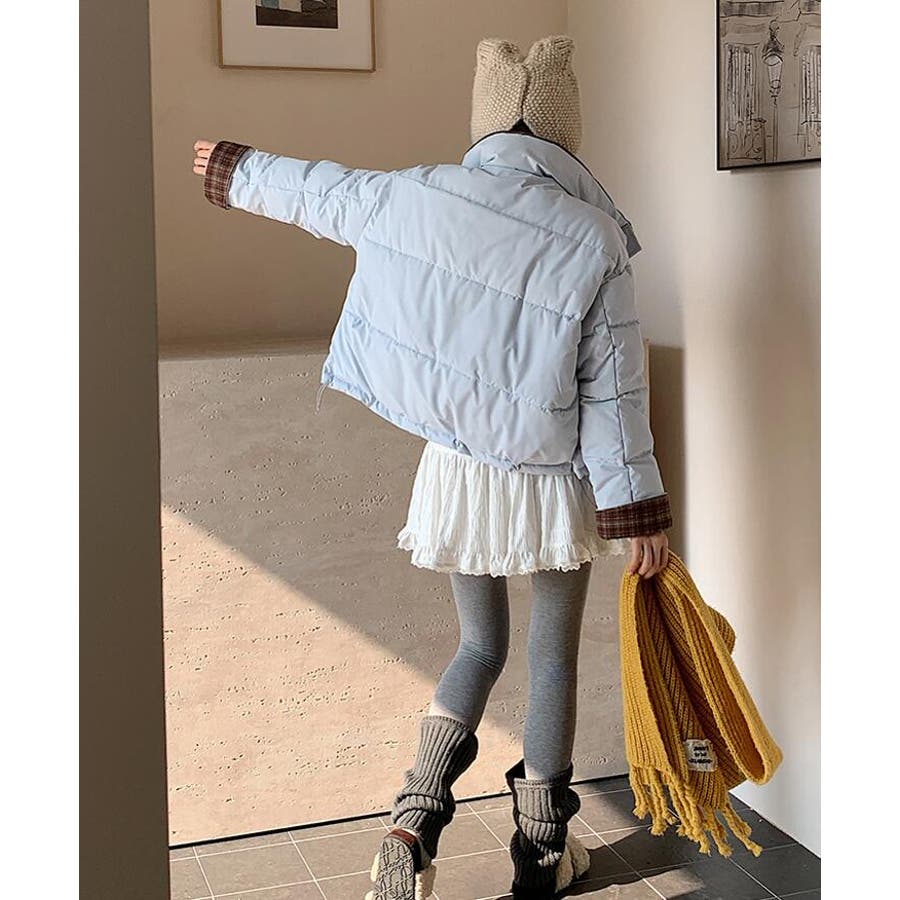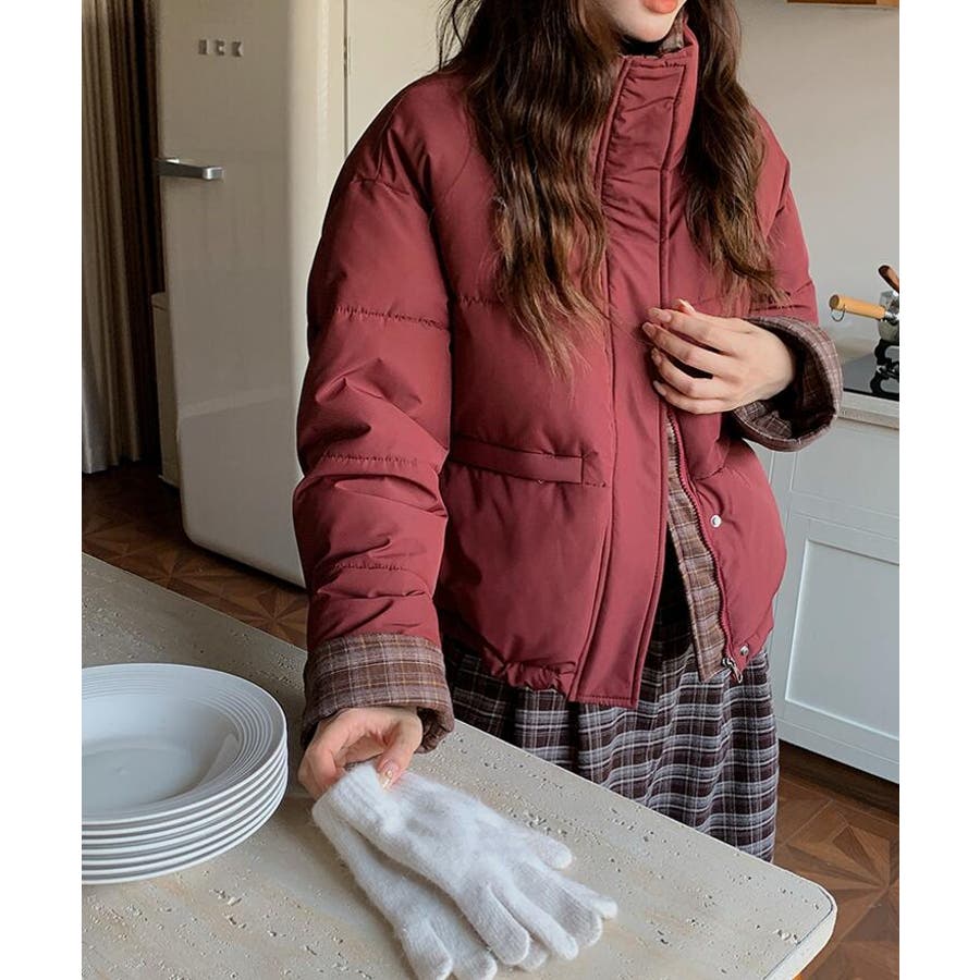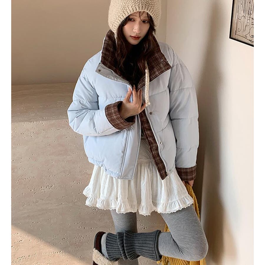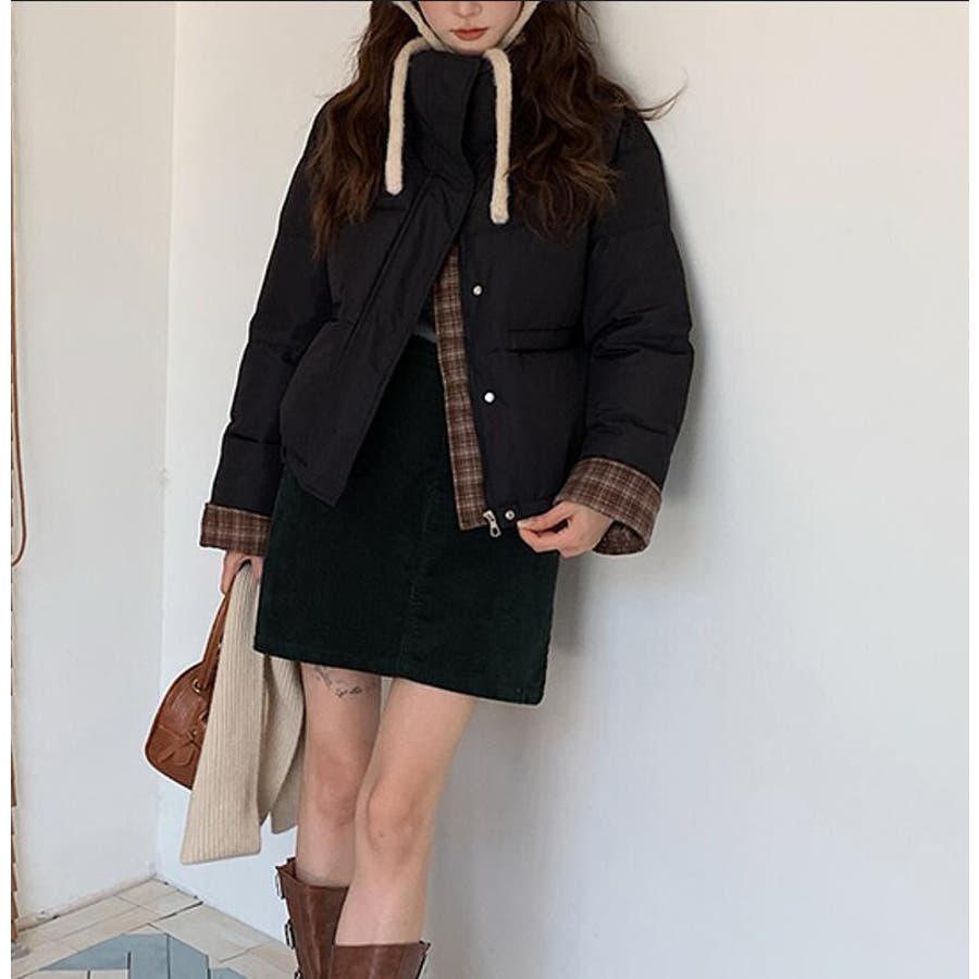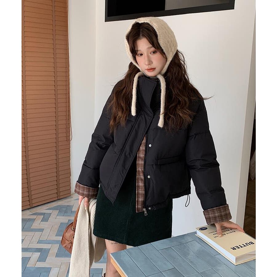 チェック裏地ダウンジャケット ハイネック