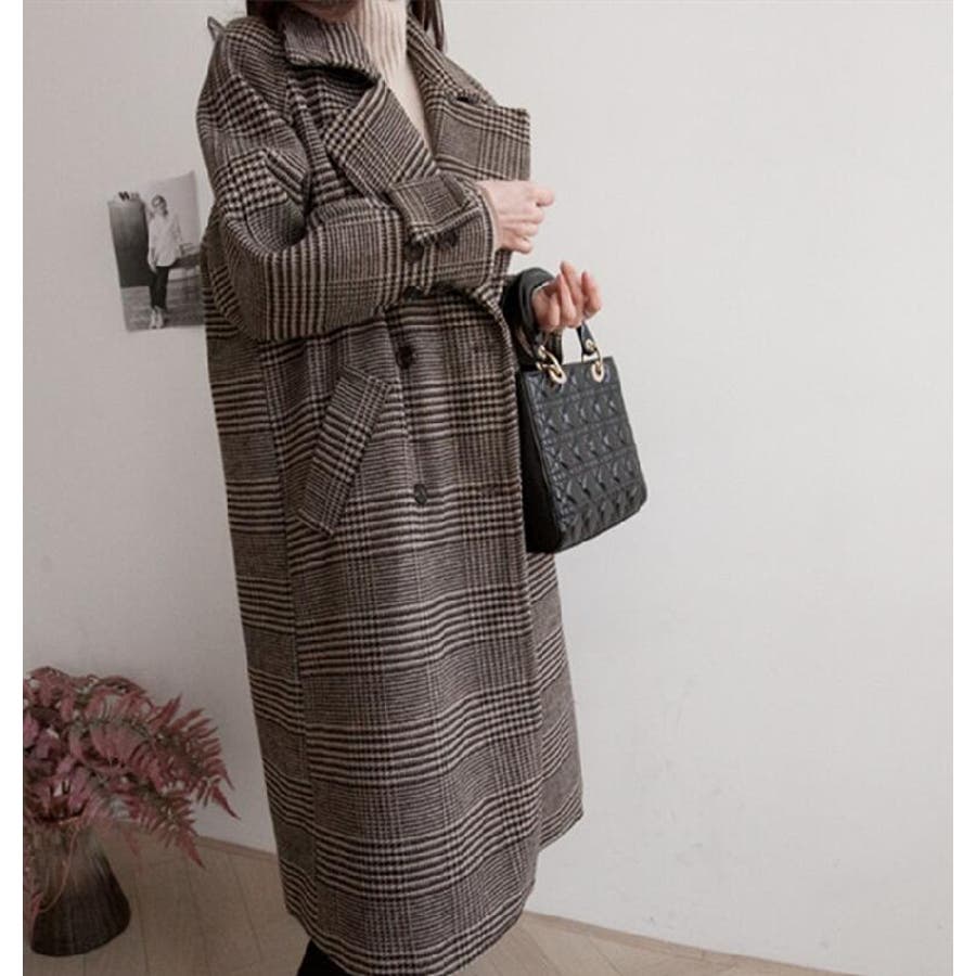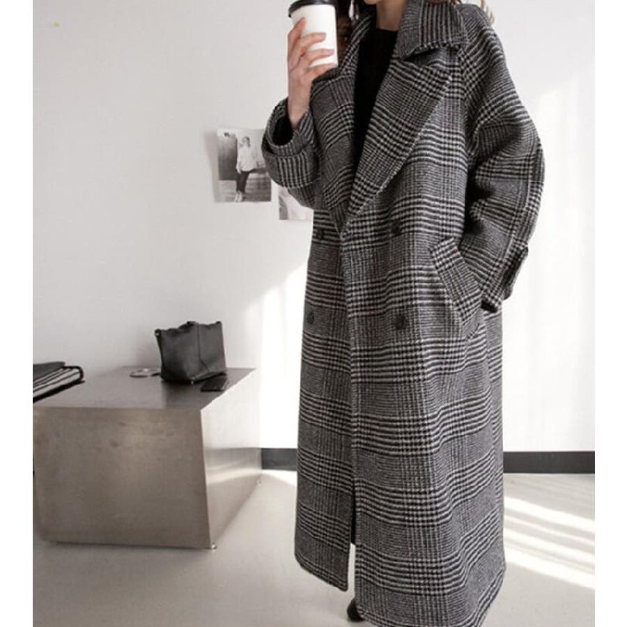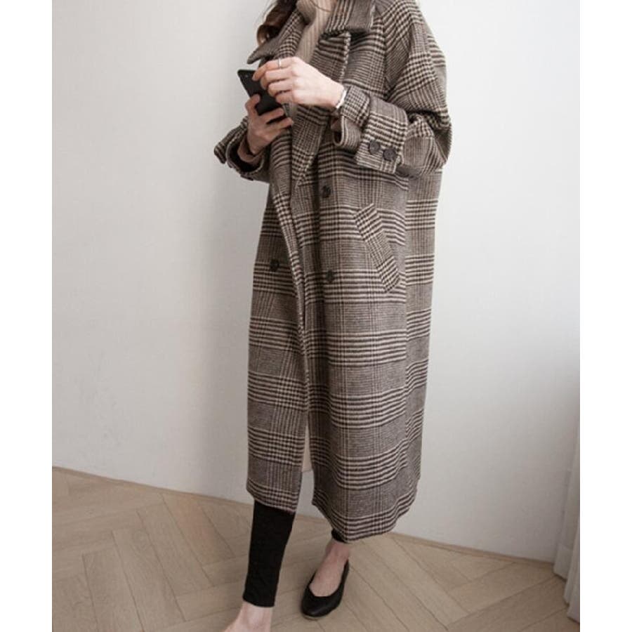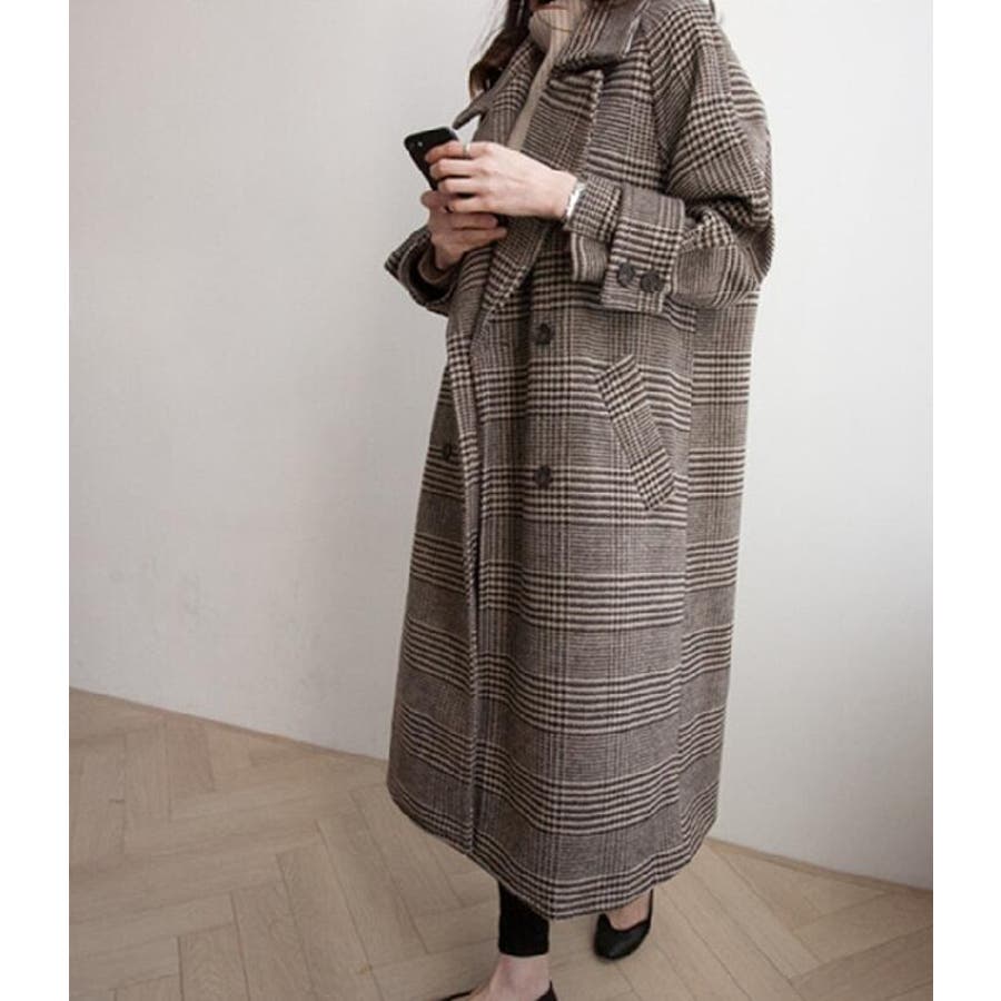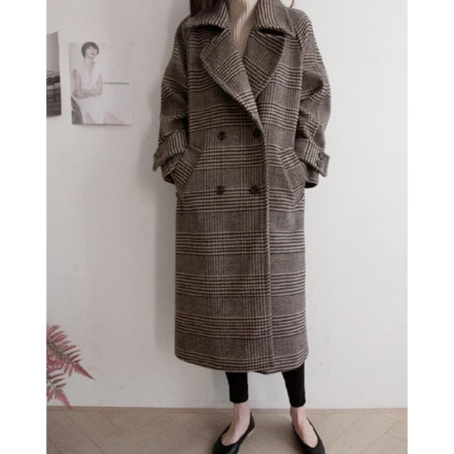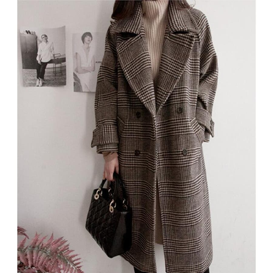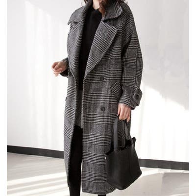 チェック柄デザイン 大きなラペルとダブルブレストが特徴的なロングコート