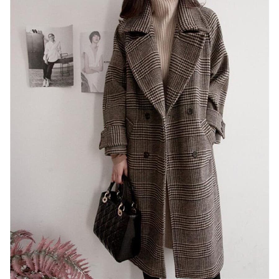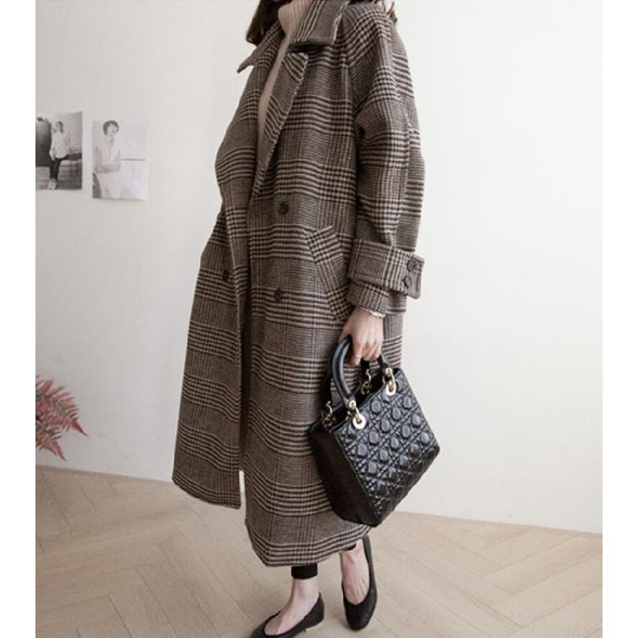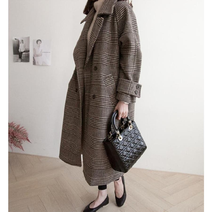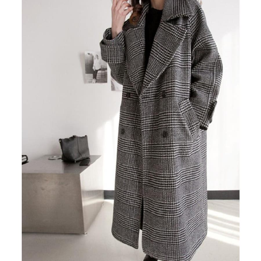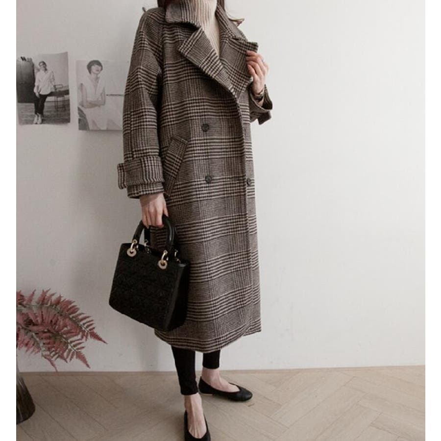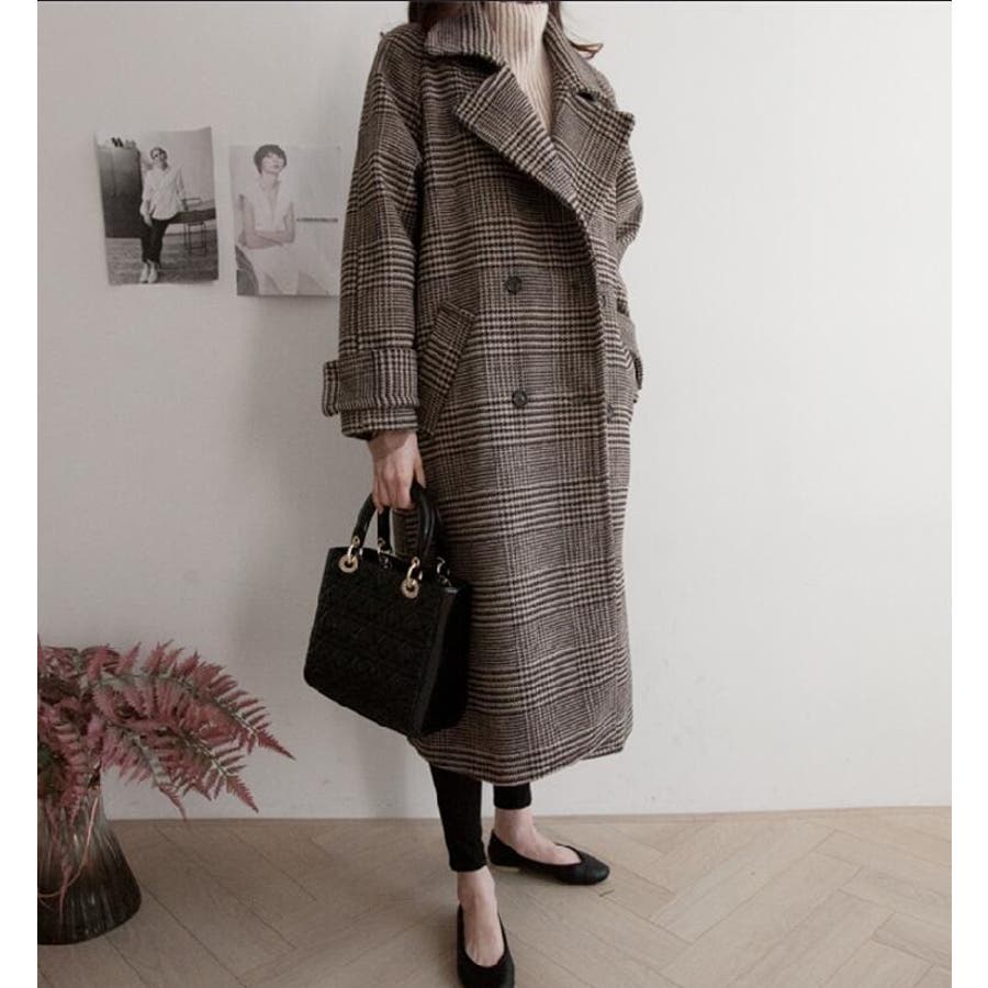 チェック柄デザイン 大きなラペルとダブルブレストが特徴的なロングコート
