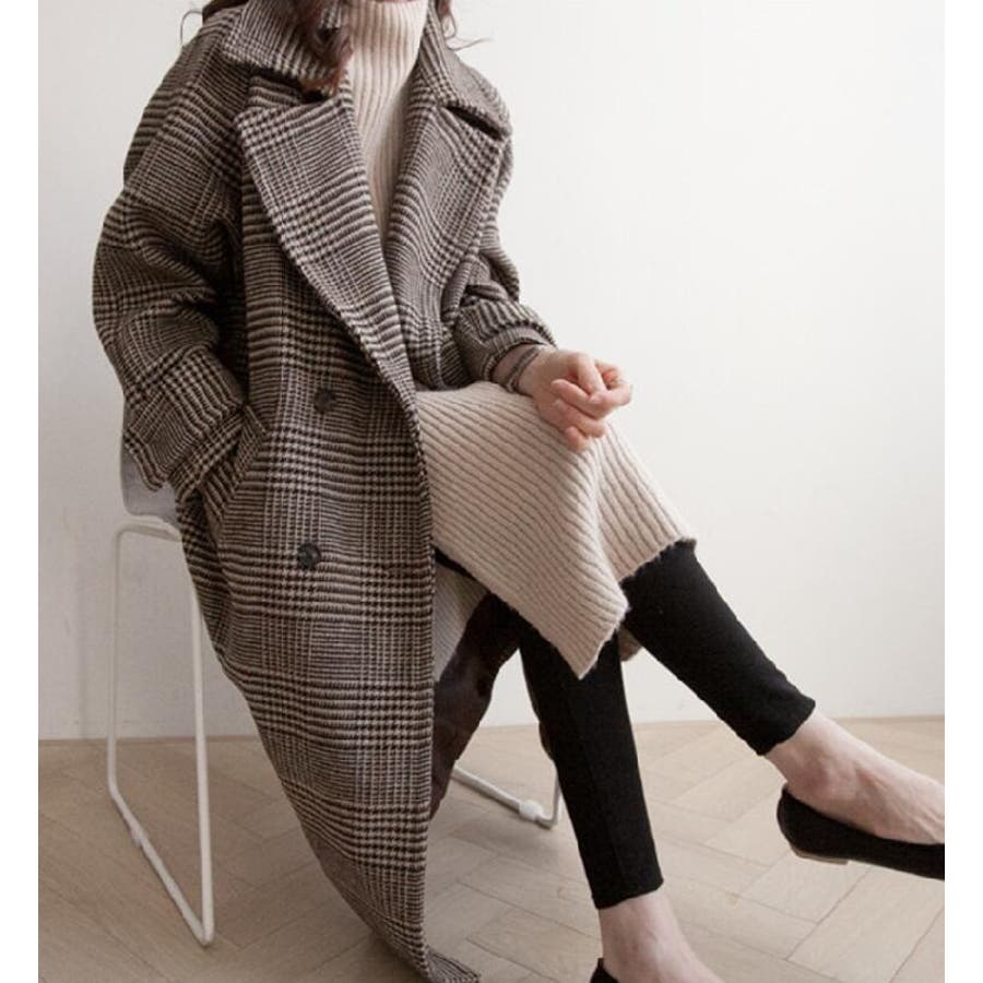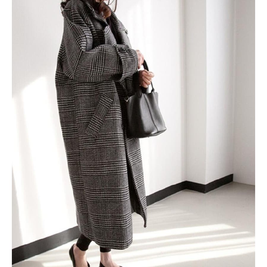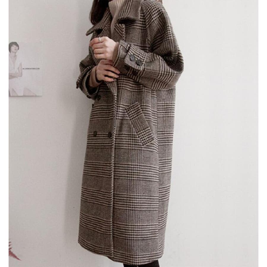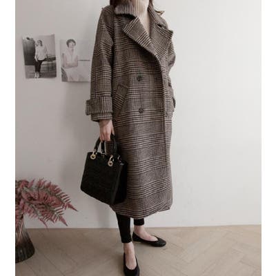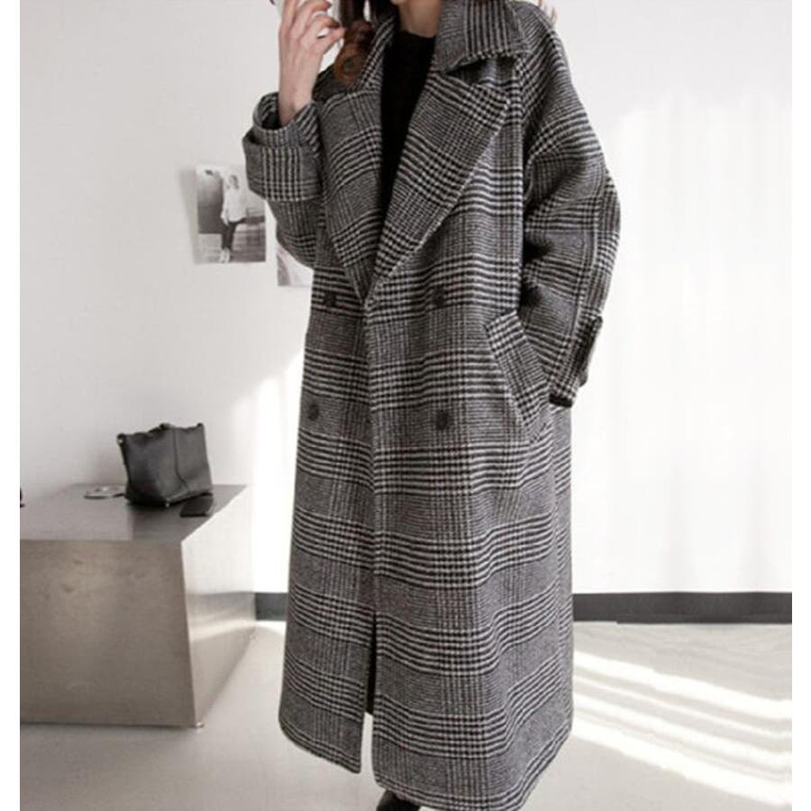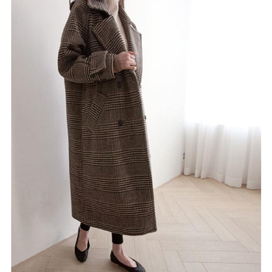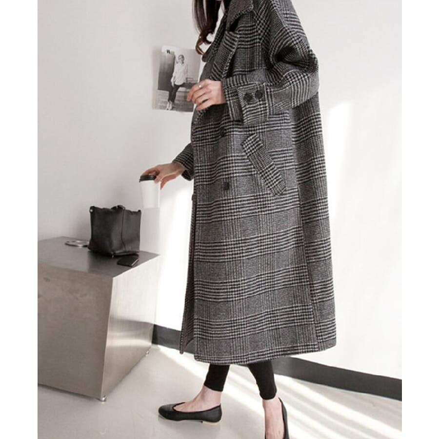 チェック柄デザイン 大きなラペルとダブルブレストが特徴的なロングコート