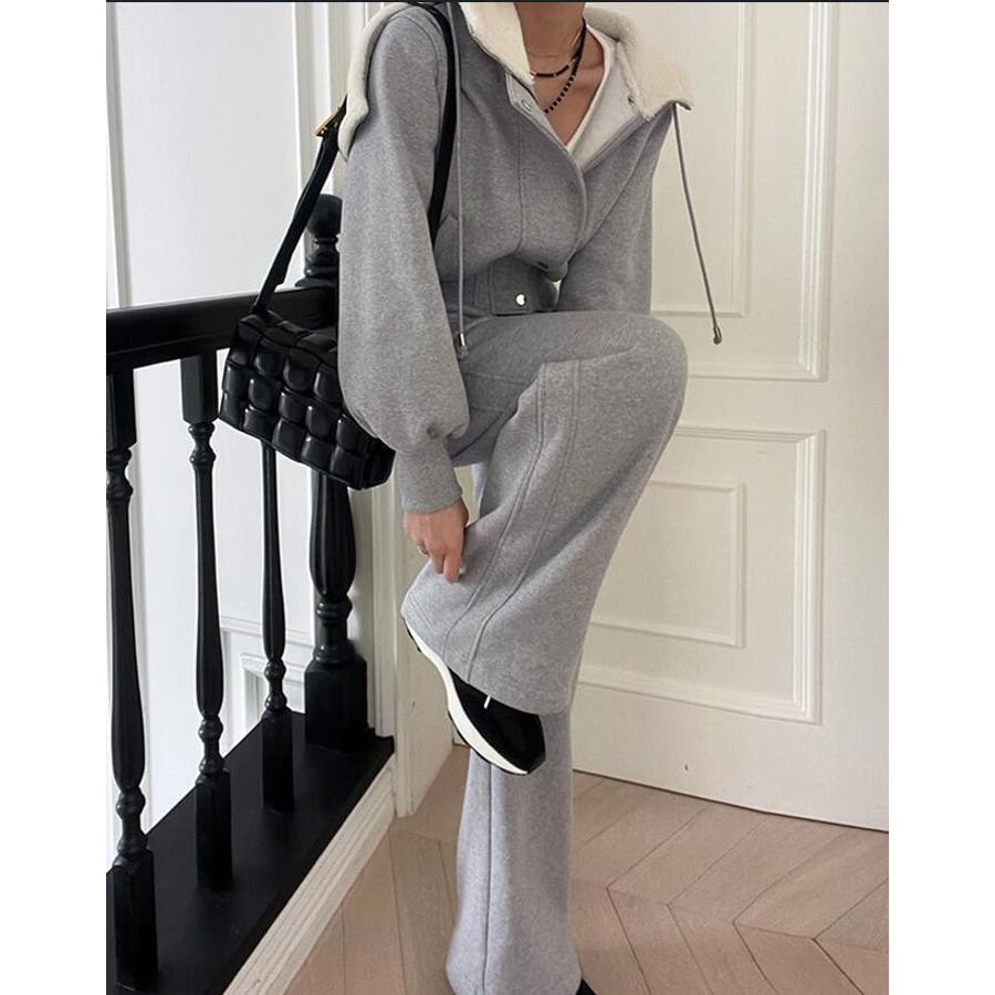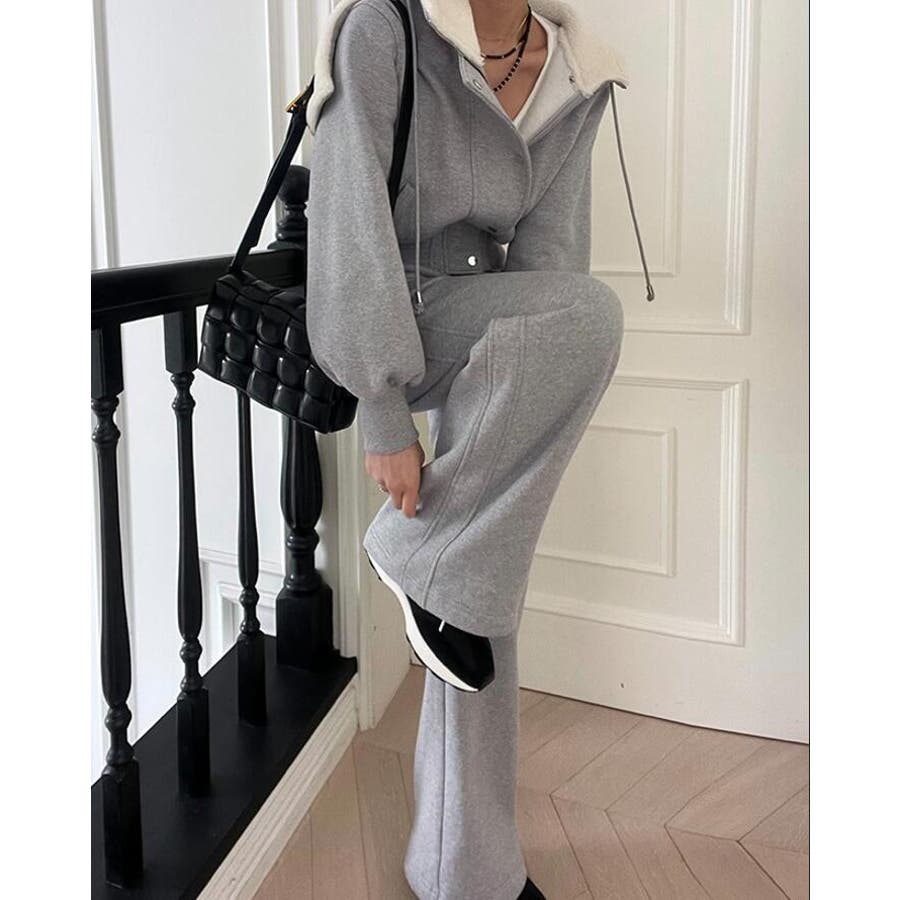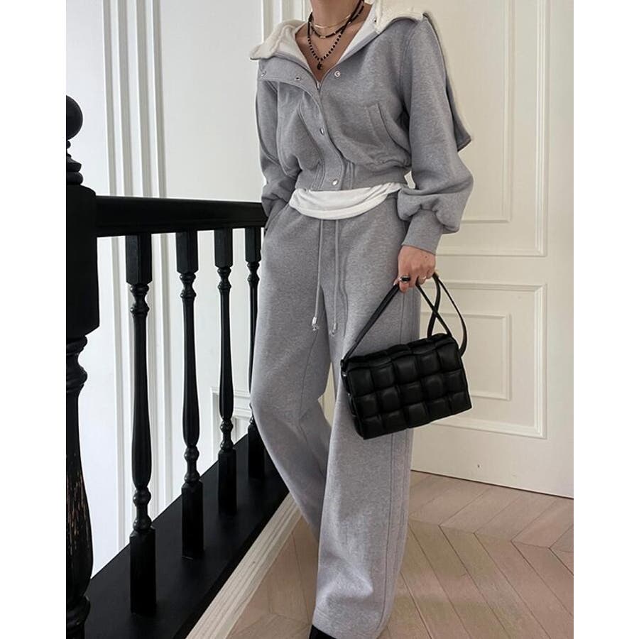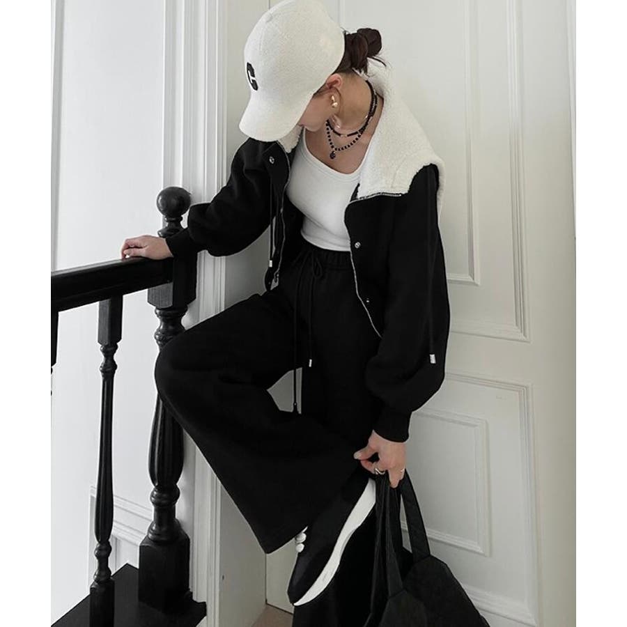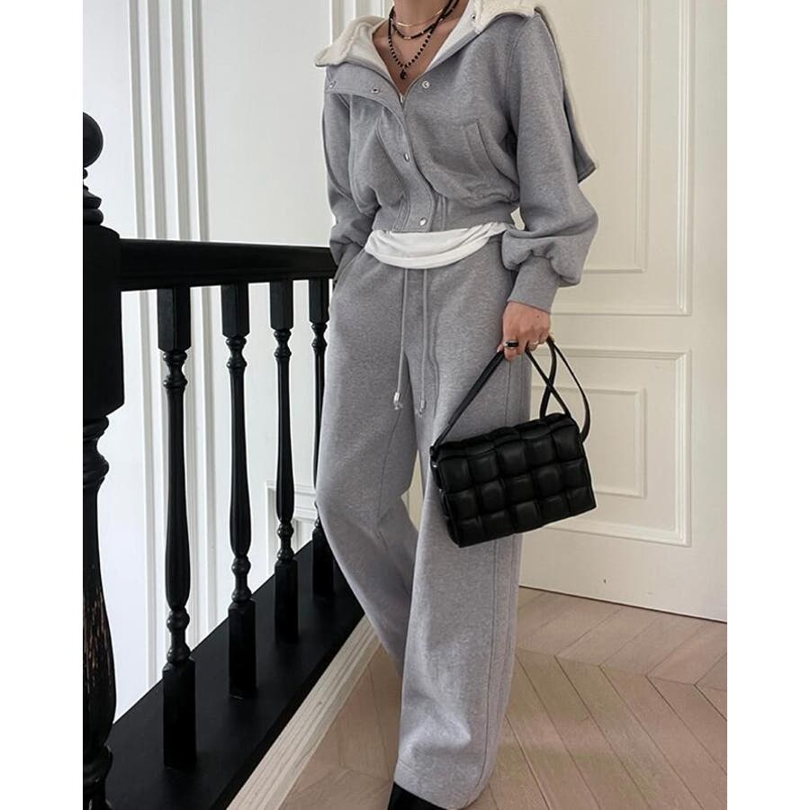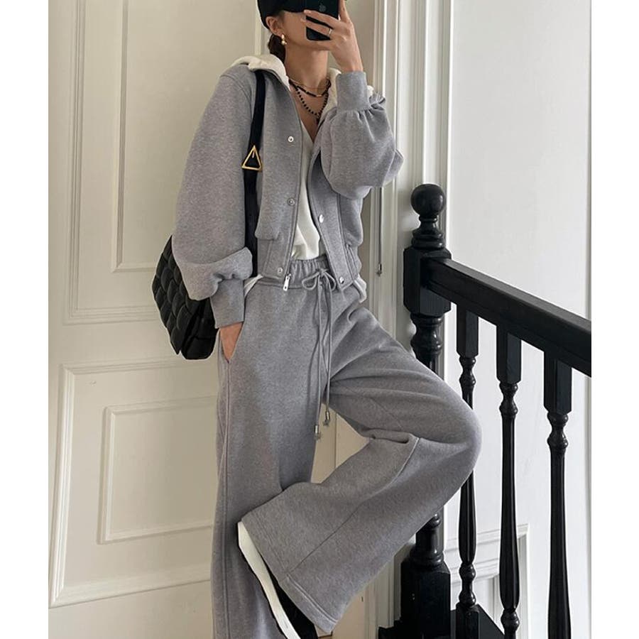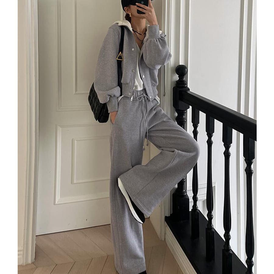 パーカートップス × ワイドパンツ スウェットセット フード付きコーディネート