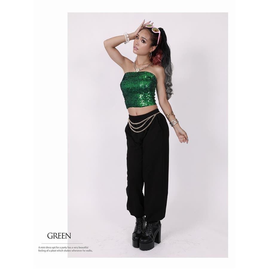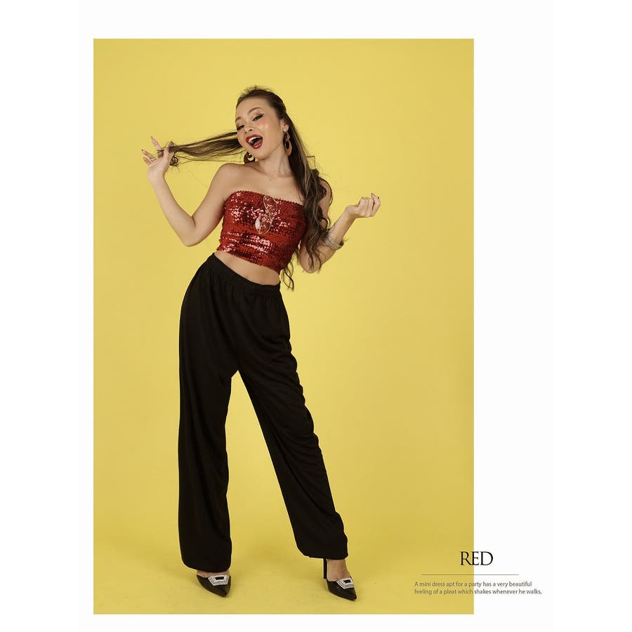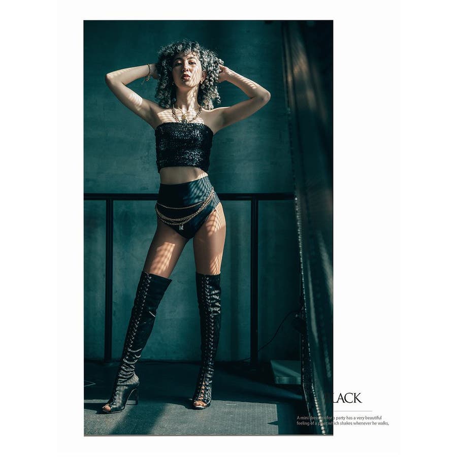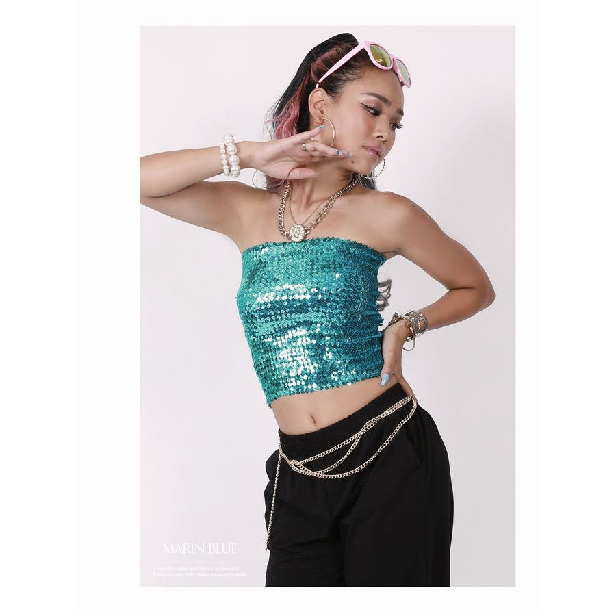 ☆ライティングや太陽でギラギラに眩しく煌めくメタリックなスパンコールが圧倒的なインパクトを放つベアトップ。