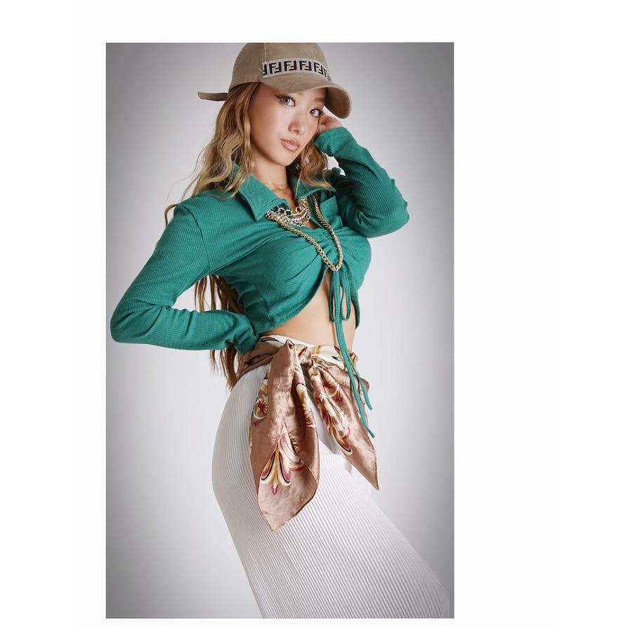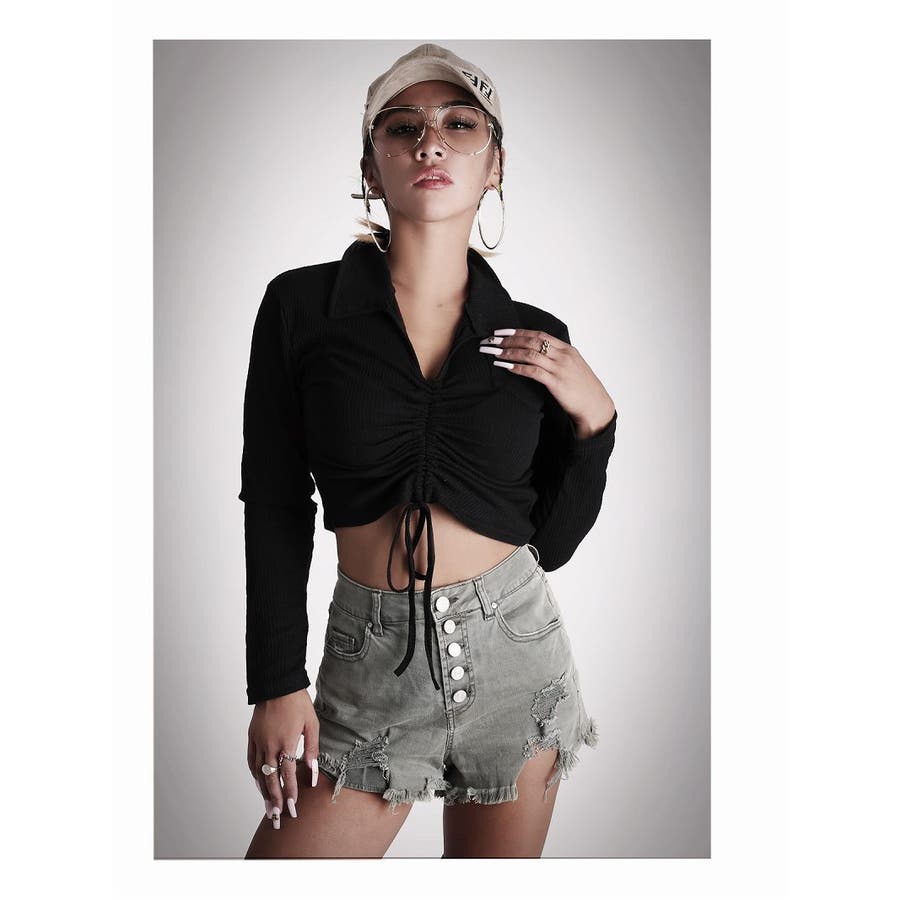 ☆フロントドロストで2wayの着方ができるショート丈トップスはセクシーでかっこいいデザイン。