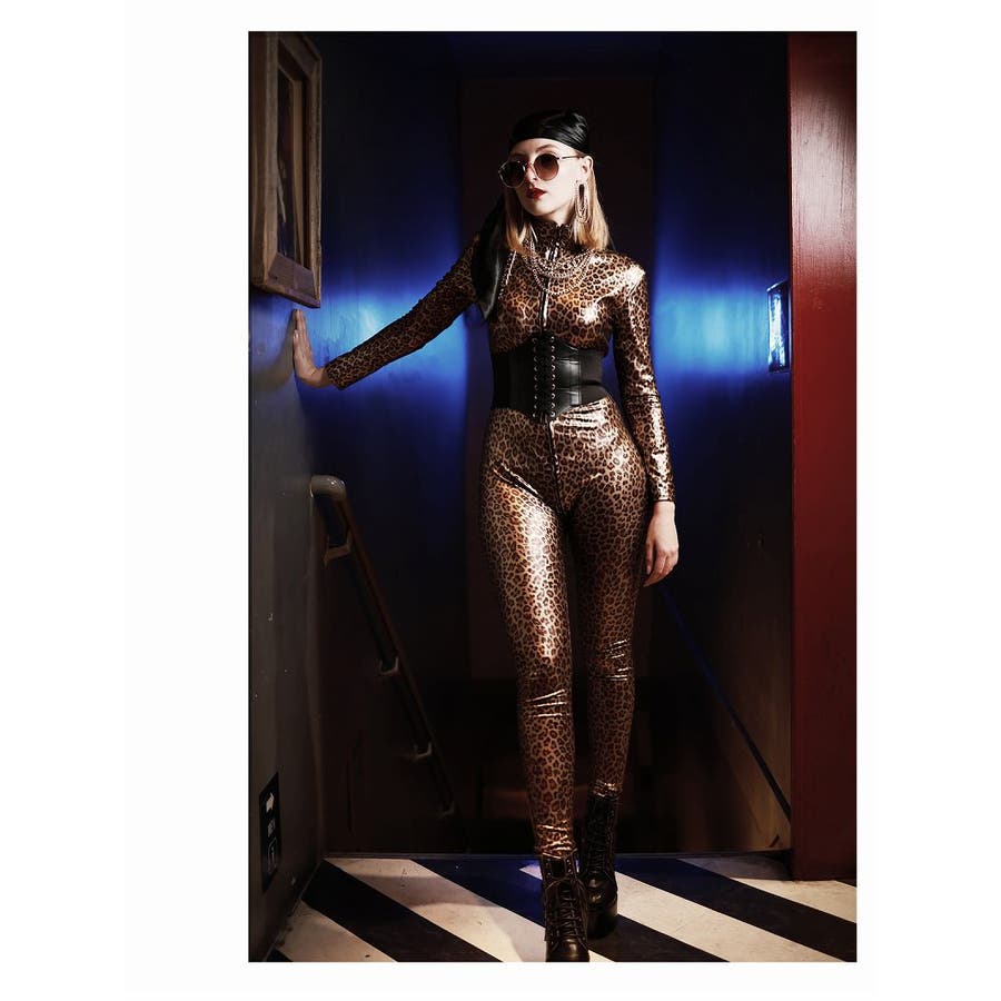 ☆全身スーツでクールにステージを魅了。ハロウィンやダンス衣装に最適。レオパード柄とエナメルの光沢が大胆さをアピール。