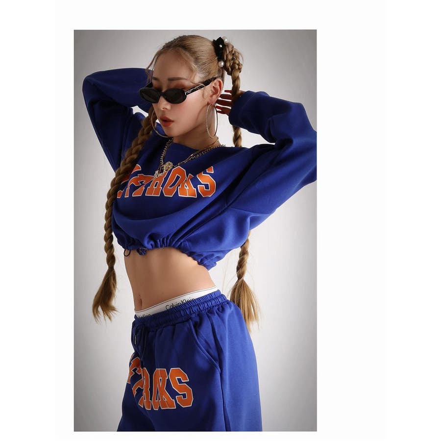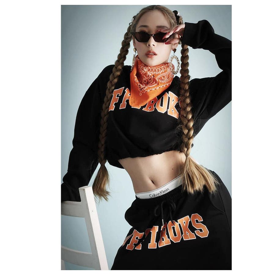 インパクトのあるフロントロゴセットアップは、トップスのドロストリングでウエスト縛りへそ出しコーデがオススメ!