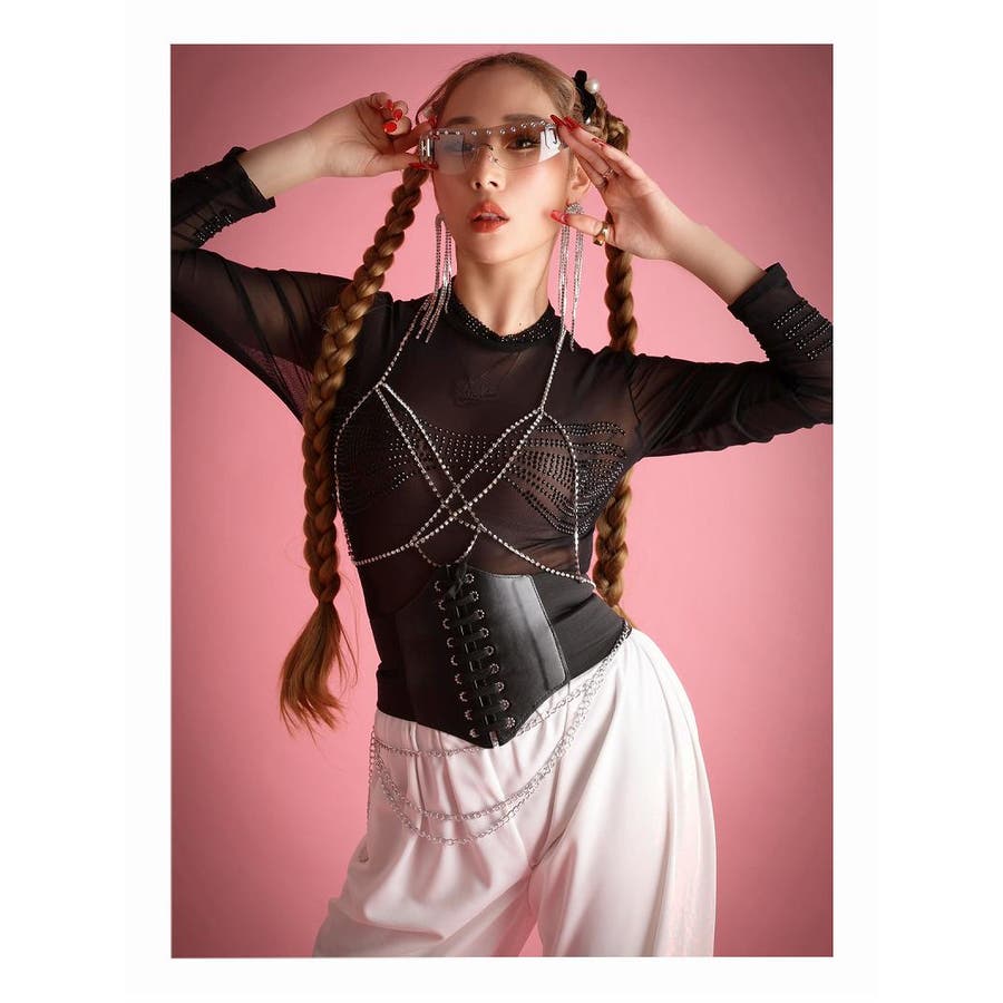 透け感のあるメッシュボディースーツは首元と胸元のビジューが動く度キラキラで美しいトップス。