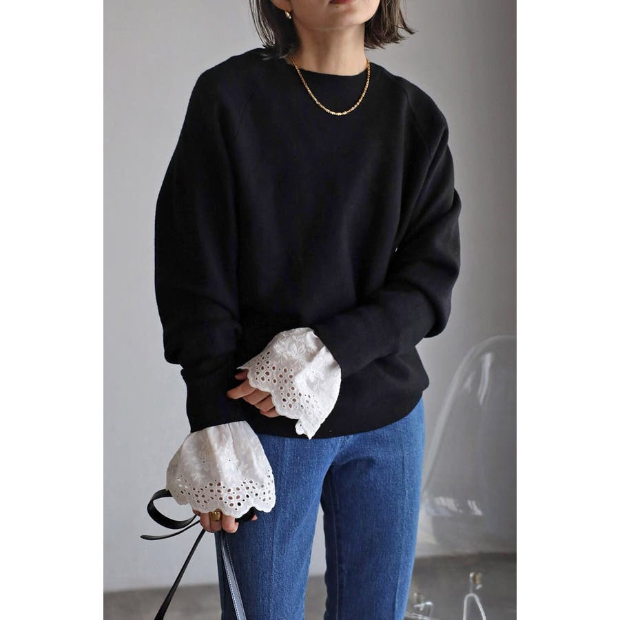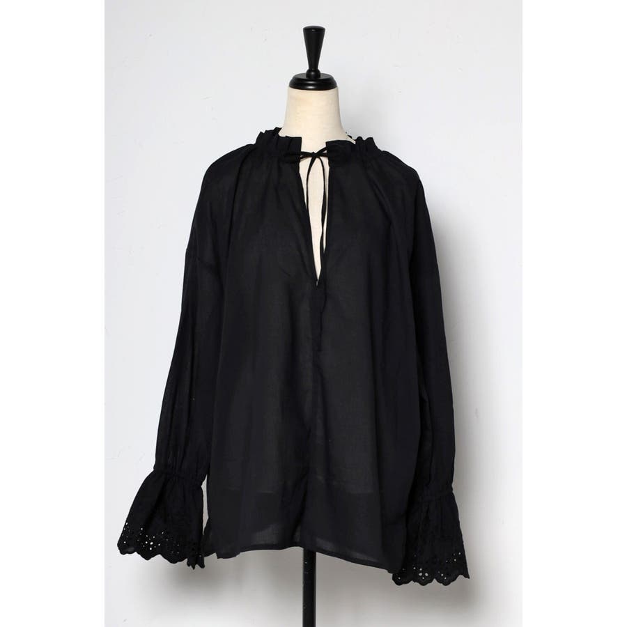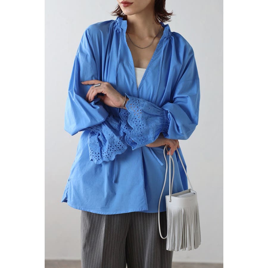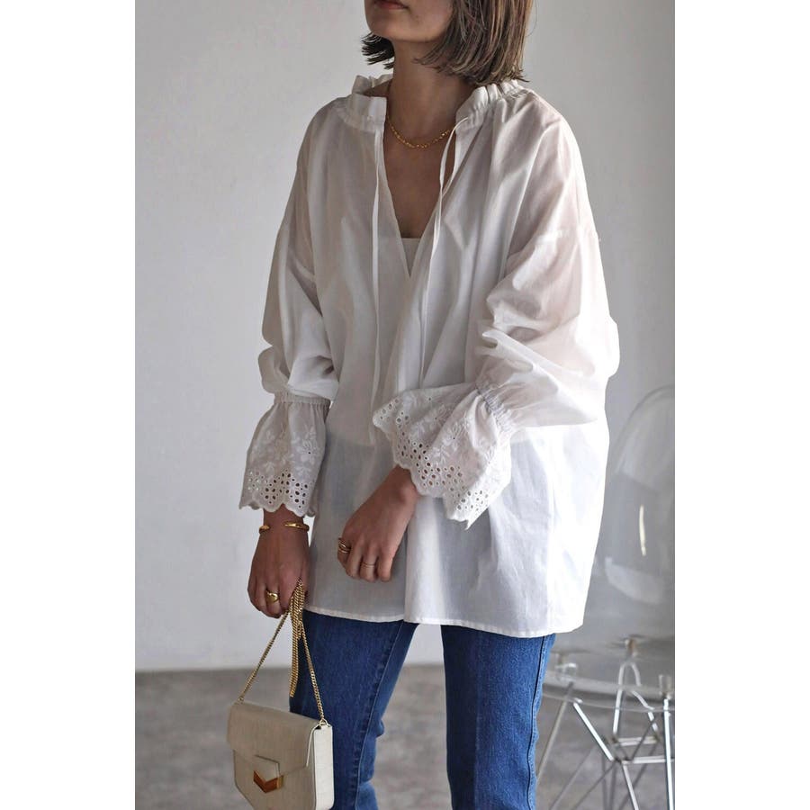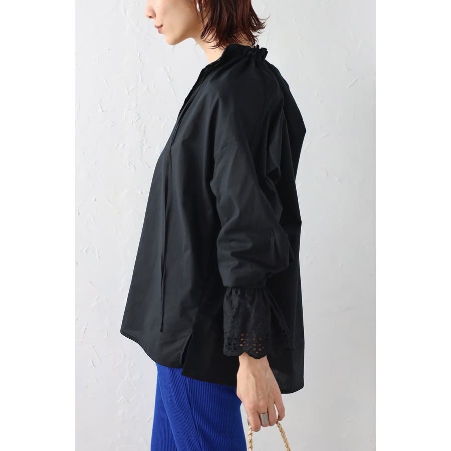 袖口に刺繍レースをあしらったスキッパーシャツ