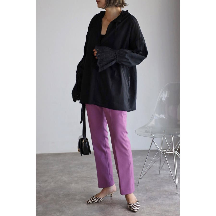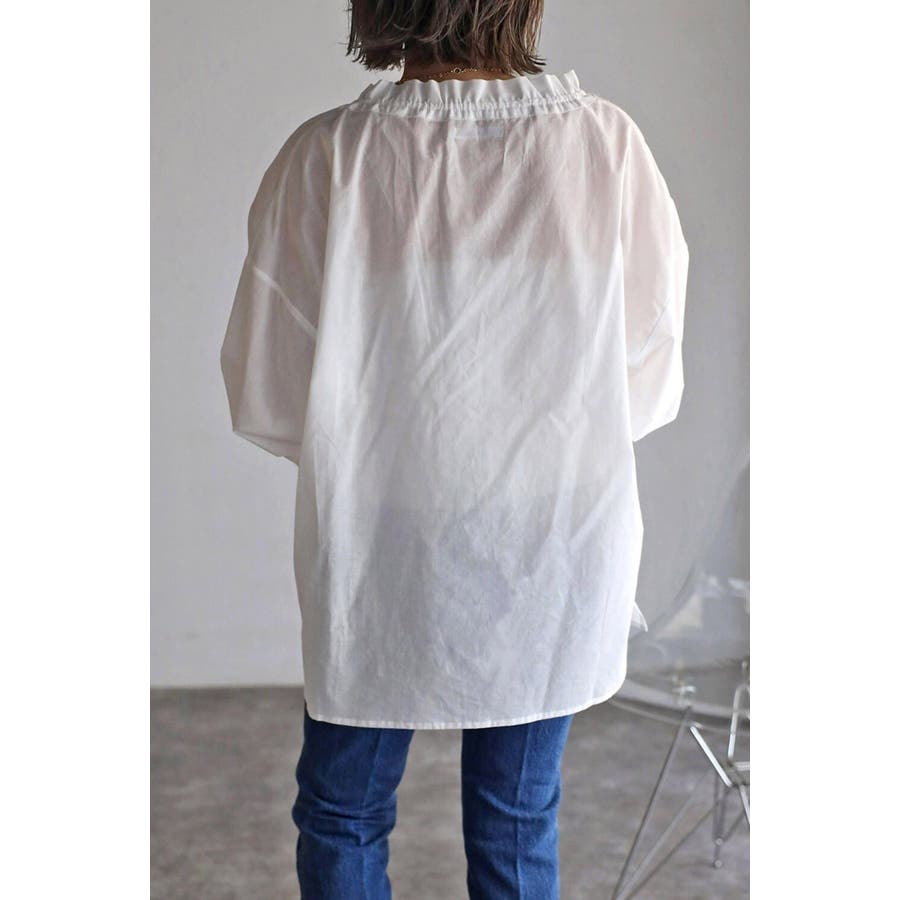 衿のフリルディテールは紐でギャザー量を調節でき、衿を開けて紐を垂らしたりリボン結びでスタンドカラーにとアレンジが可能。
