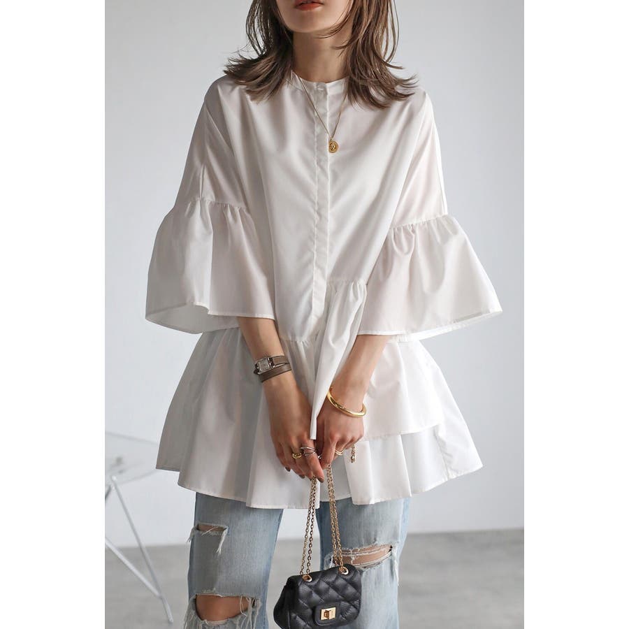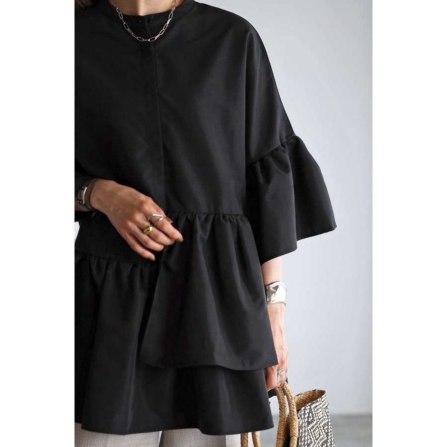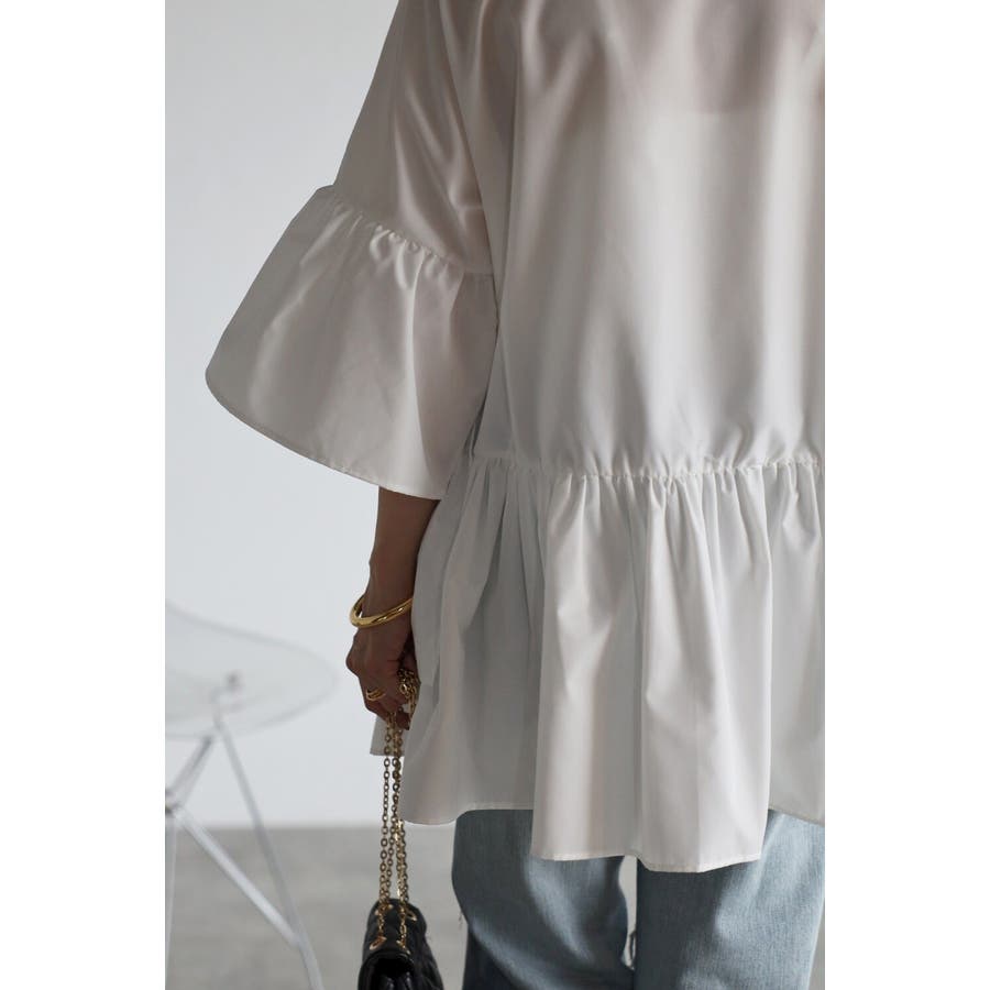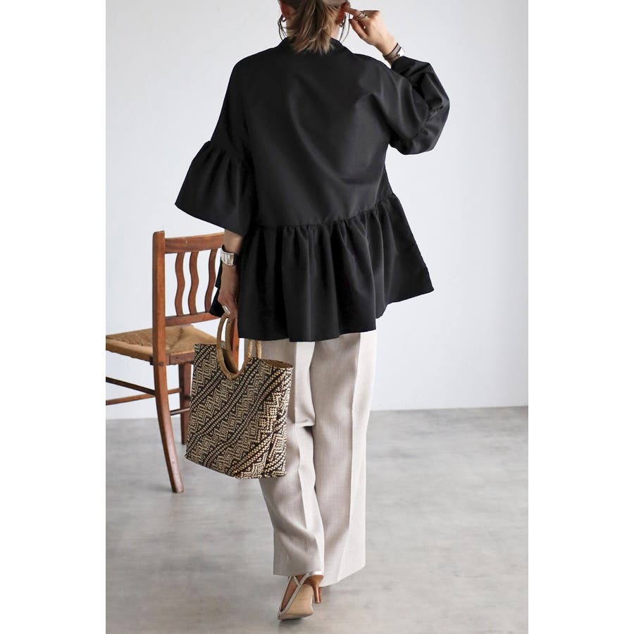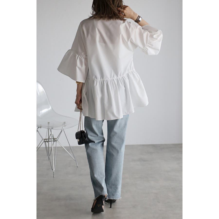 ドルマンシルエットのフレアスリーブに、裾のペプラムフリルがフェミニンなシャツブラウス。