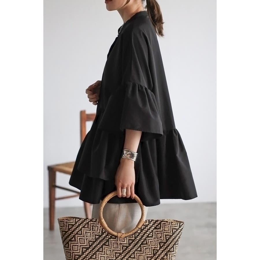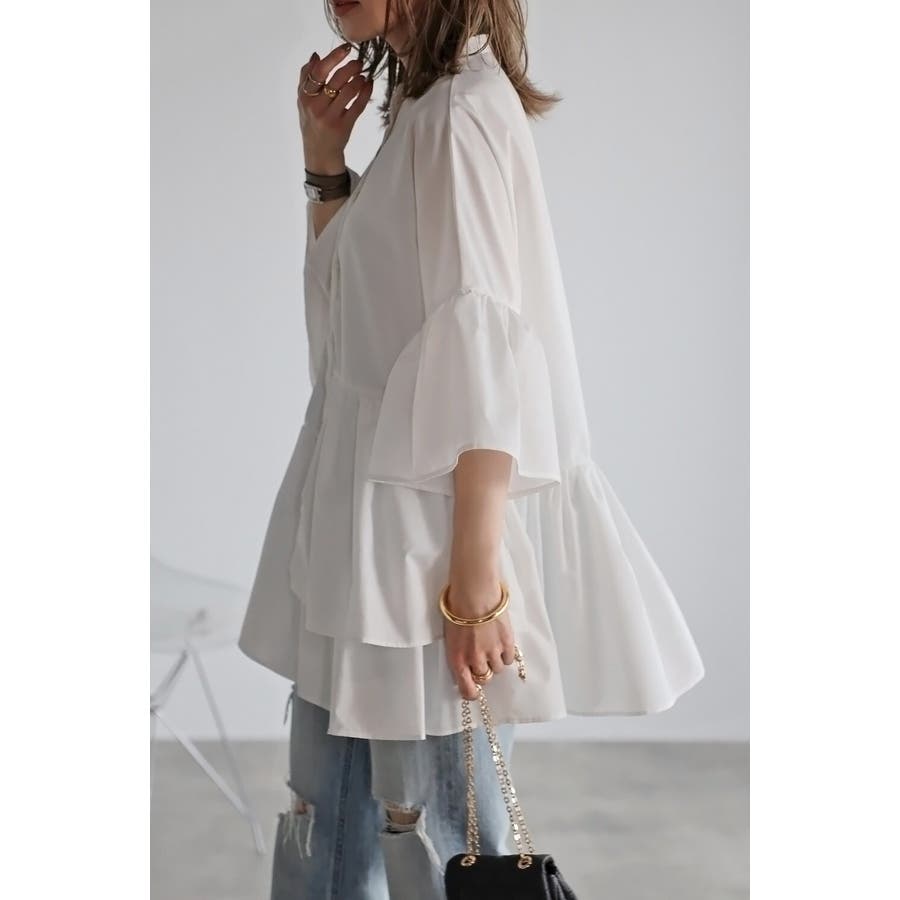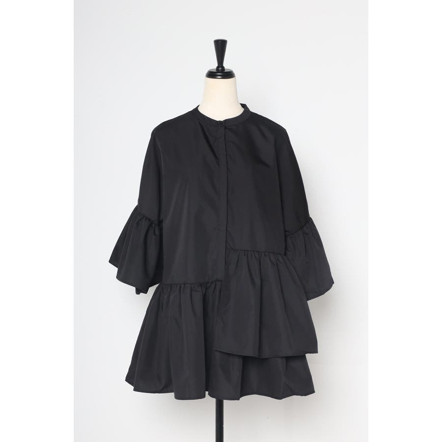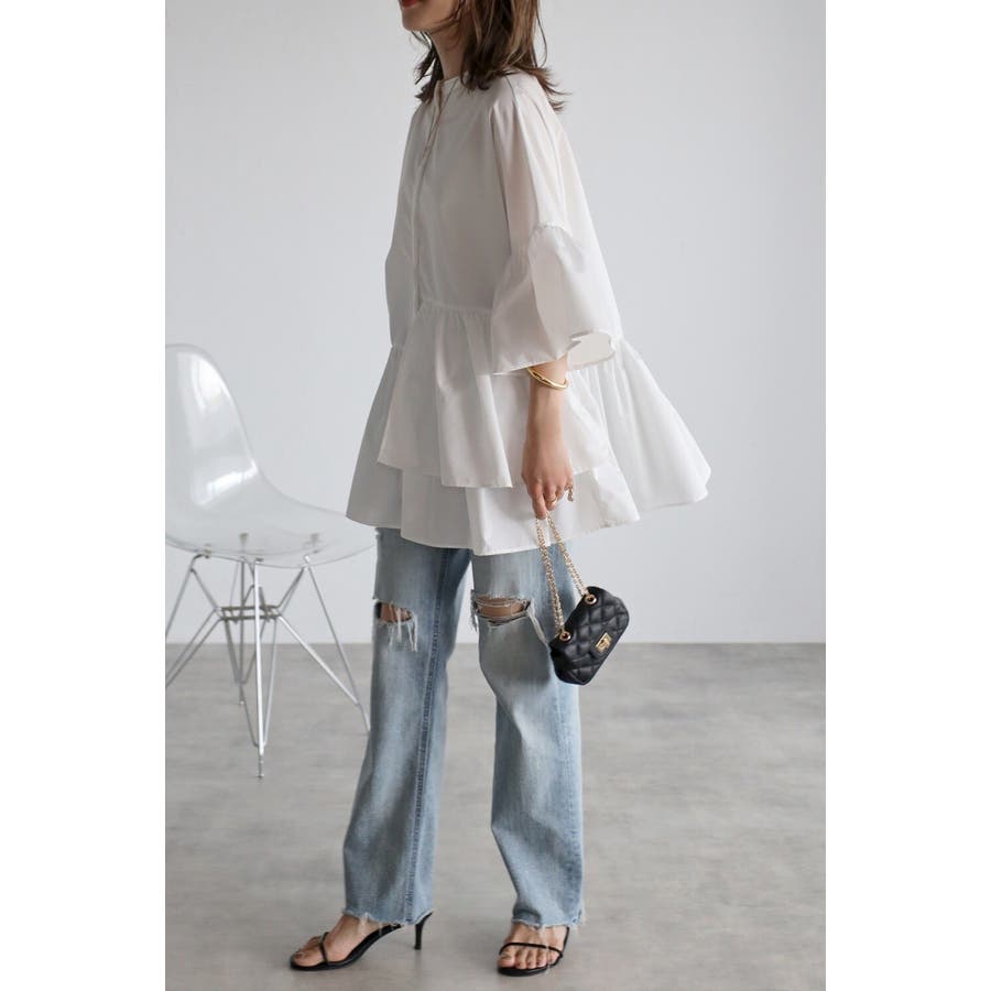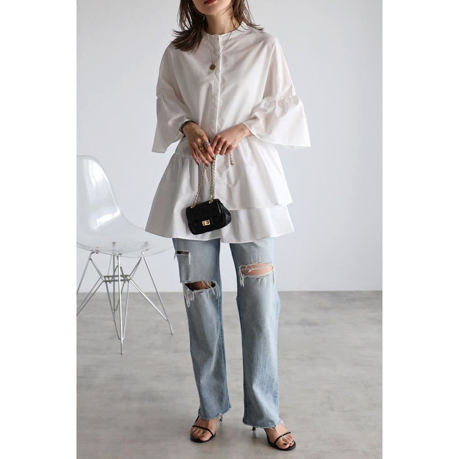 ドルマンシルエットのフレアスリーブに、裾のペプラムフリルがフェミニンなシャツブラウス。