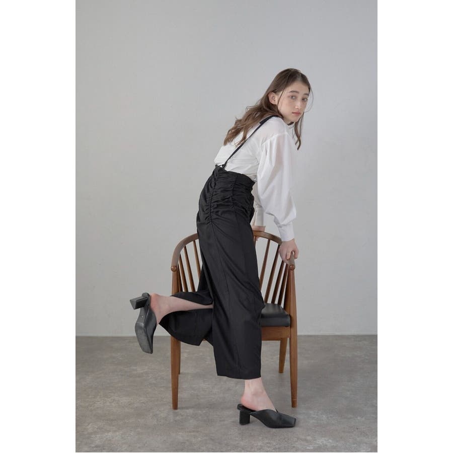 シャーリング×サスペンダーが魅力のモードなスカートウエスト部分のシャーリングが、立体感を演出するスカート。