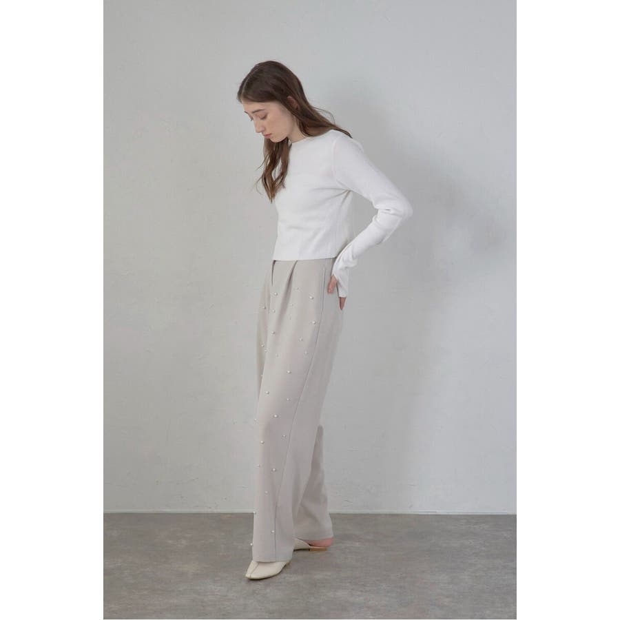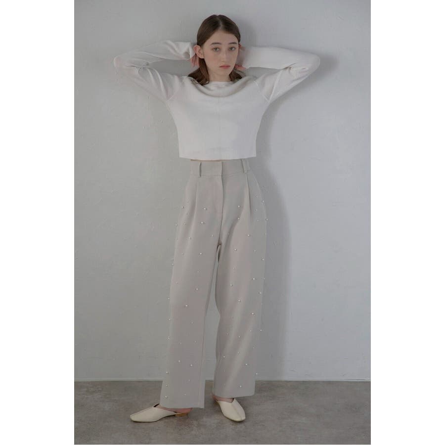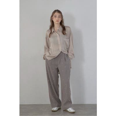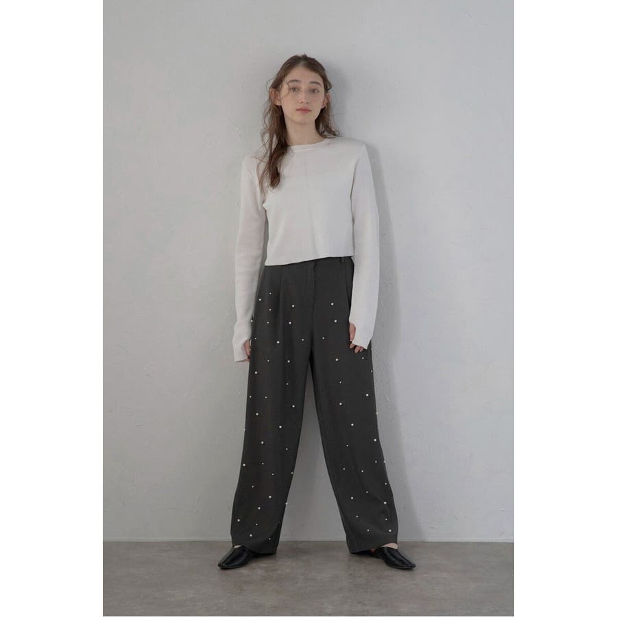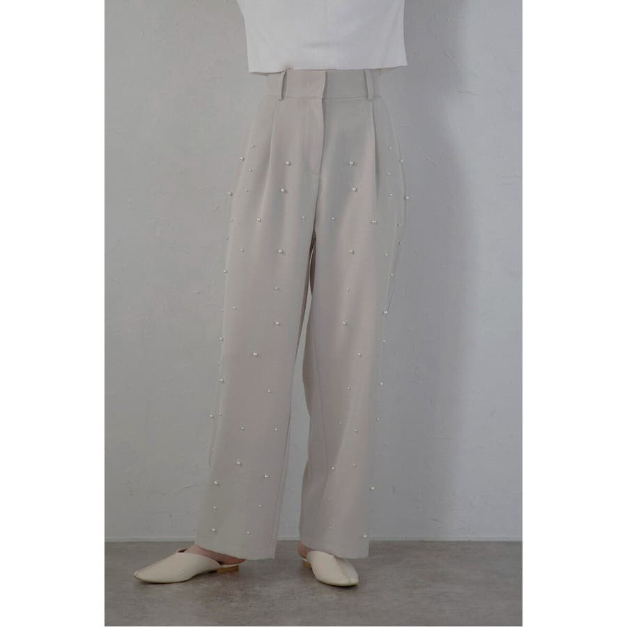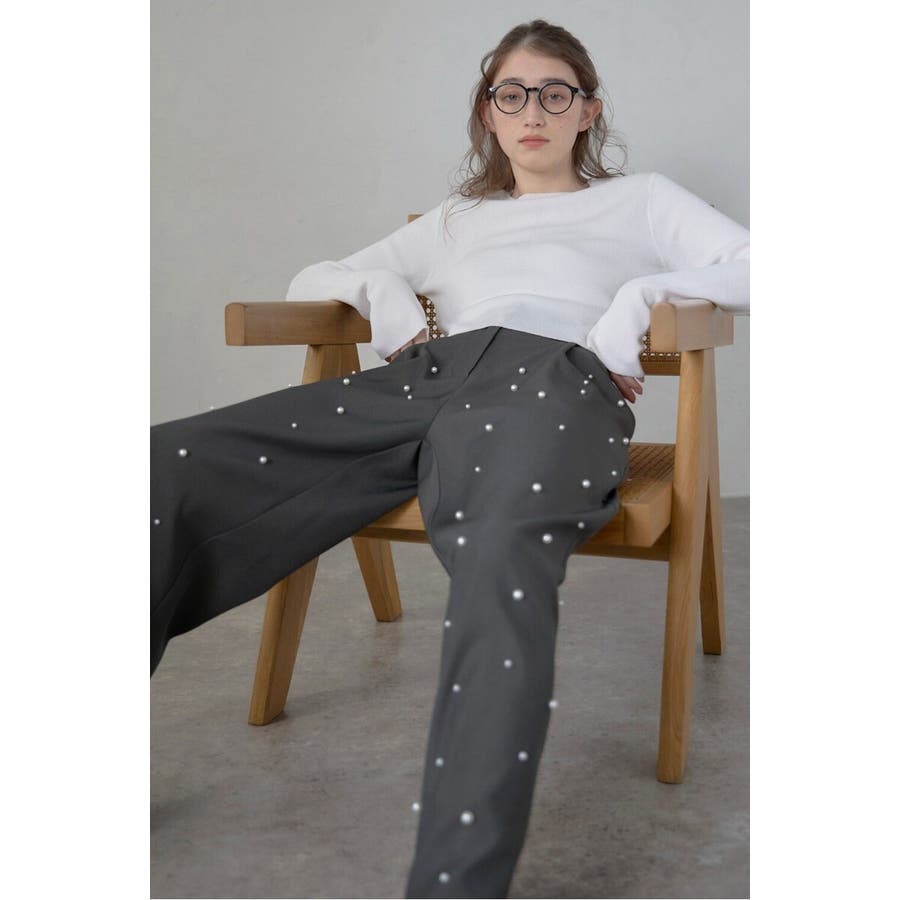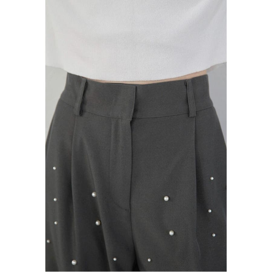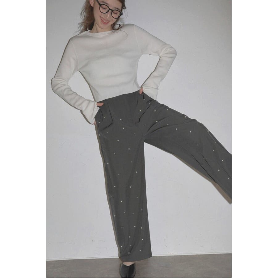 動くたびにパールが煌めき、存在感を際立たせる一着パールビジューが散りばめられたデザインが目を引くワイドパンツ。