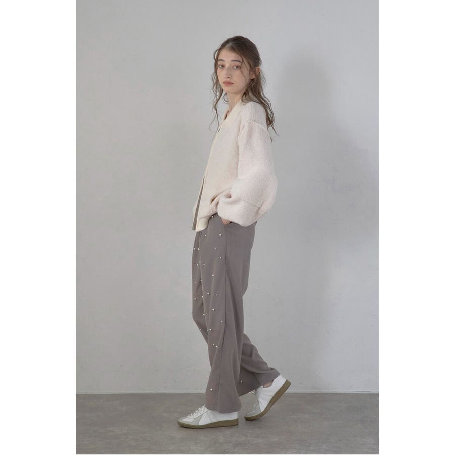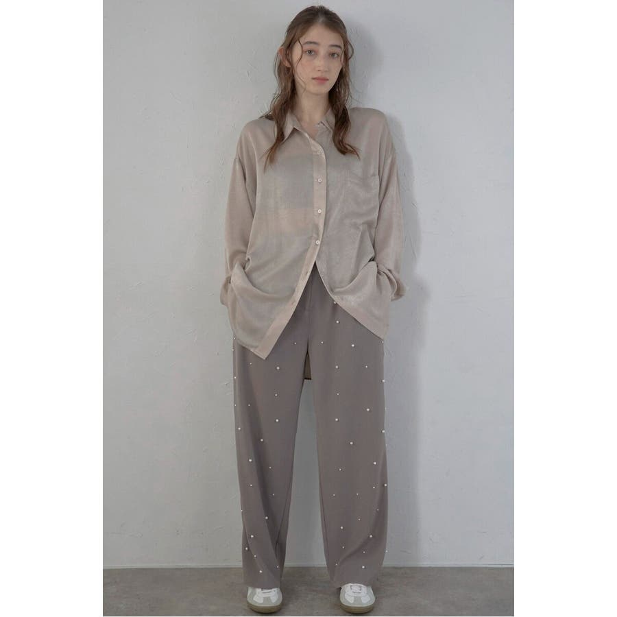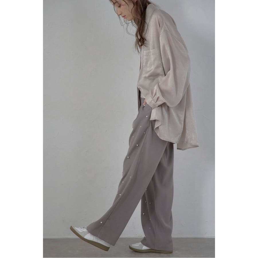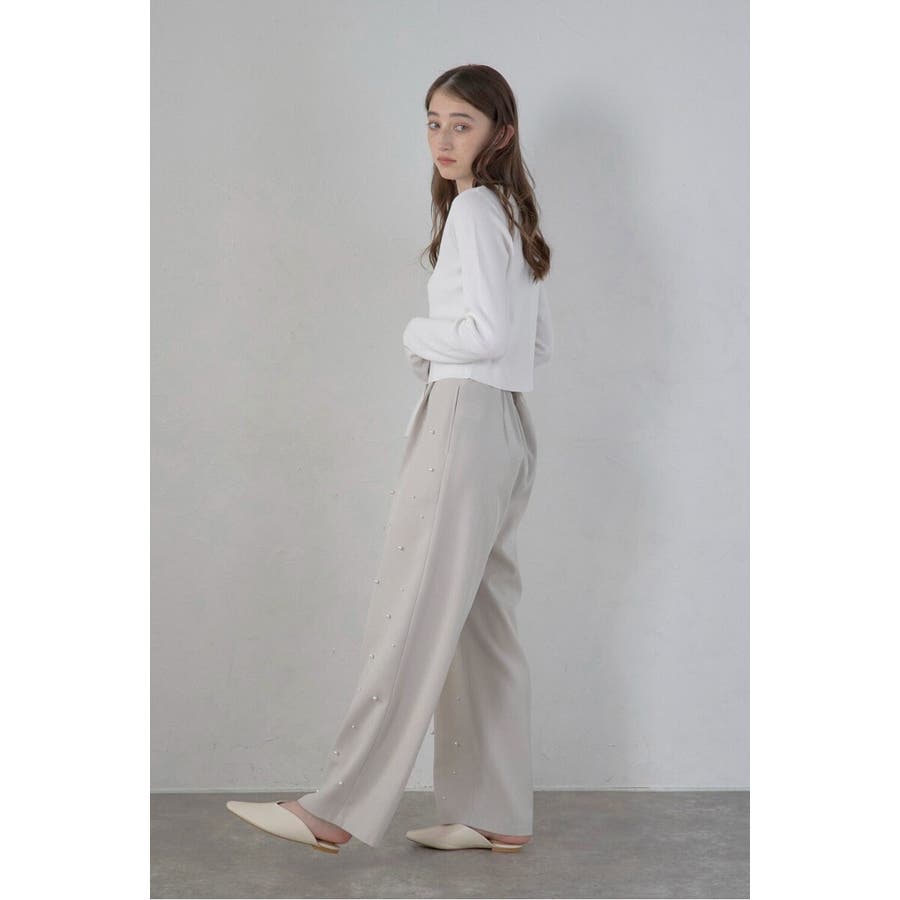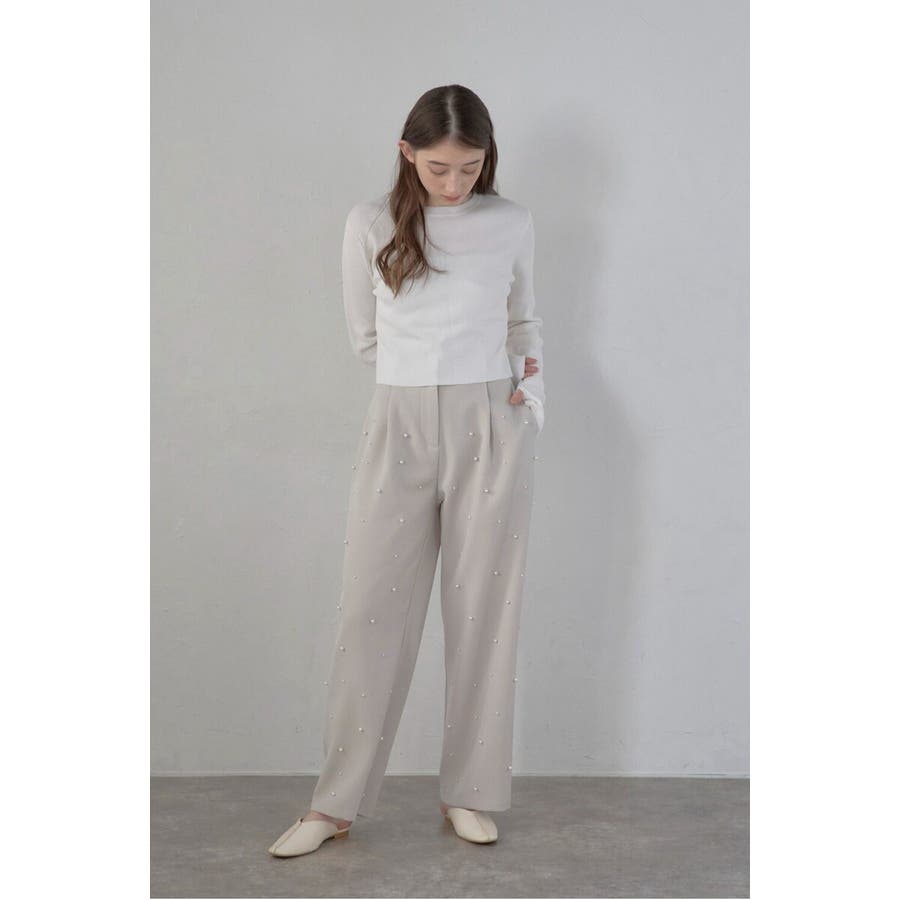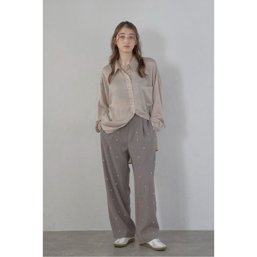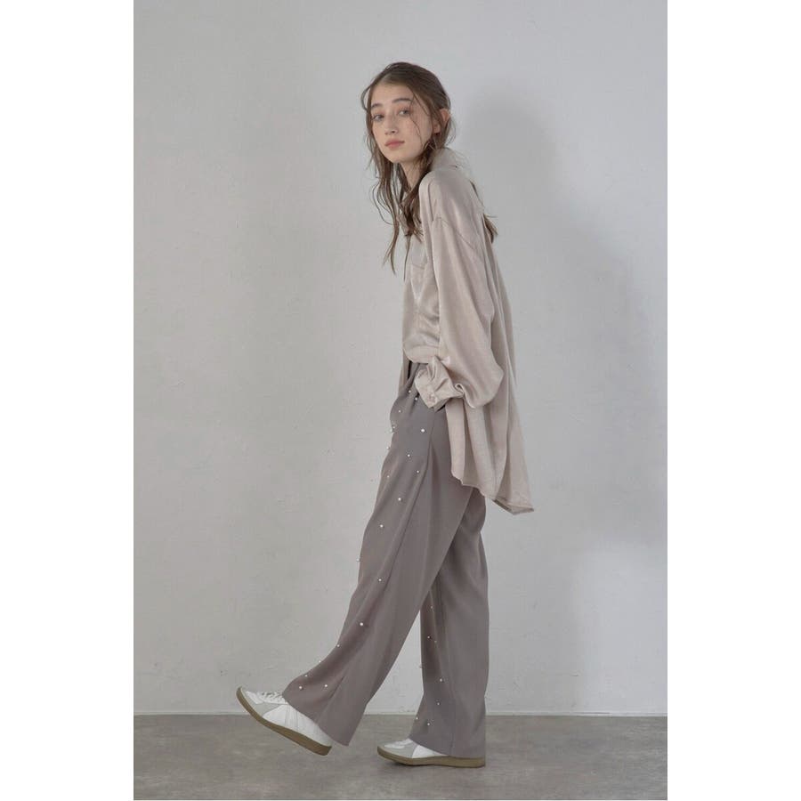 動くたびにパールが煌めき、存在感を際立たせる一着パールビジューが散りばめられたデザインが目を引くワイドパンツ。