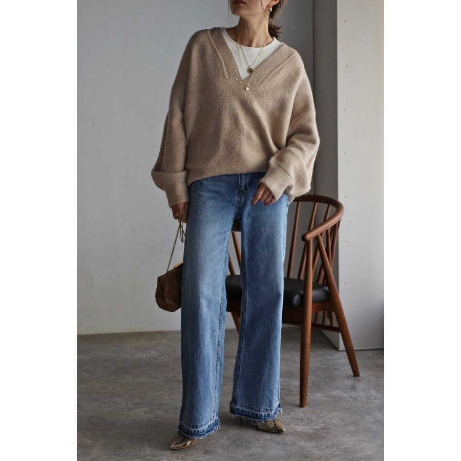 深く開いているVネックにTシャツをレイヤードすることで、トレンドライクな着こなしに。
