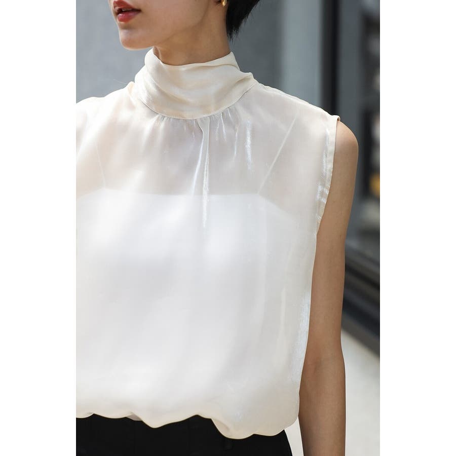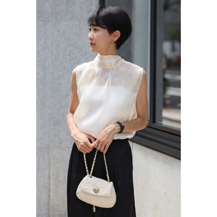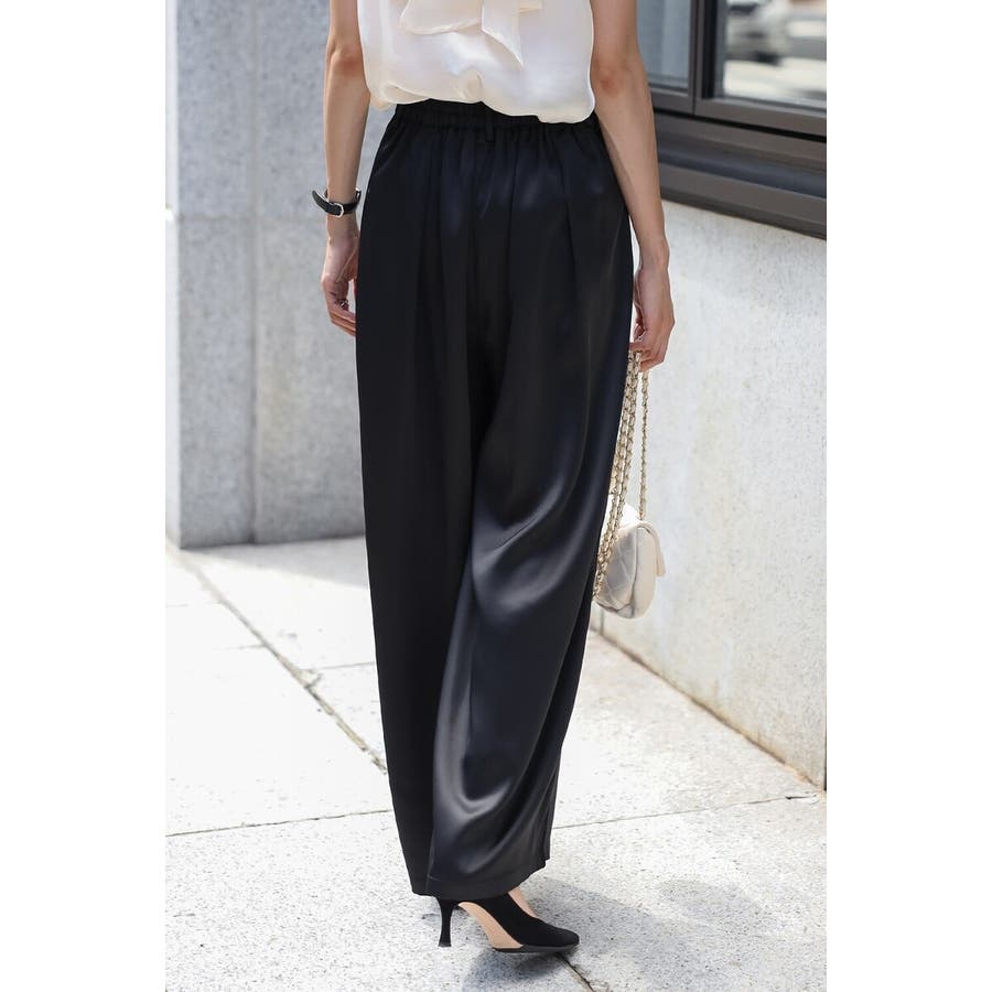 エレガントなオーガンジー素材のブラウスと、シルエットが美しいサテンパンツの贅沢な2点セット。