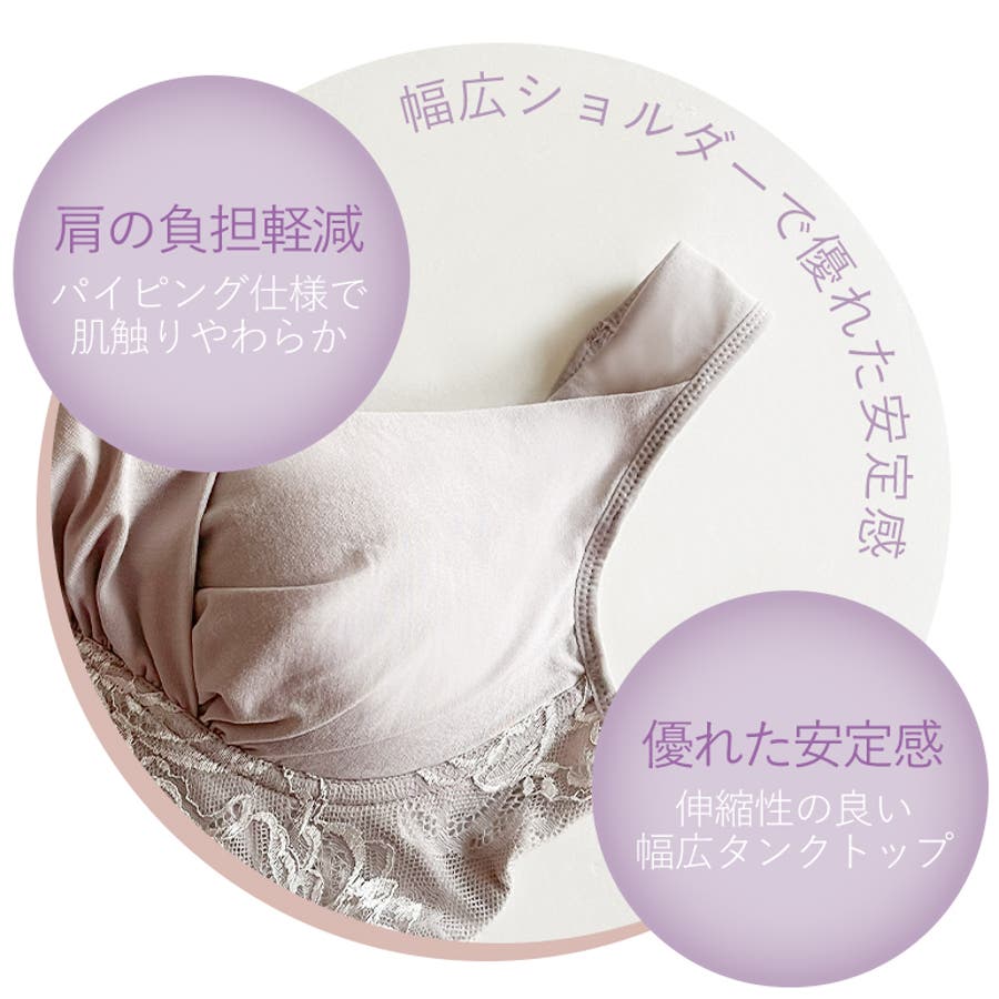 幅広のタンクトップ型ショルダーで、食い込みにくく優しい肌触りです。