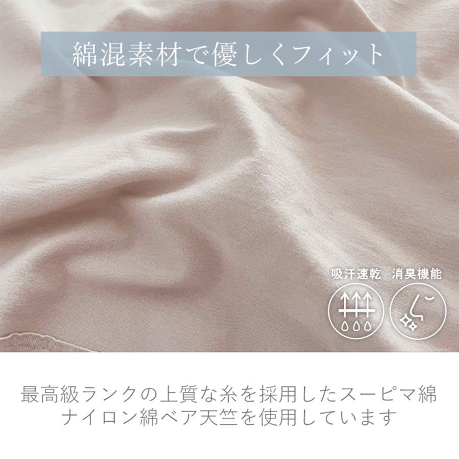 35mm以上の超長綿繊維に限定された最高級ランクの「スーピマ綿」を使用した、ナイロン綿ベア天竺素材(綿49%・ナイロン39%・ポリウレタン12%)と、フィット感が良い日本製の綿混トリコットサテン(ナイロン65%・綿23%・ポリウレタン12%)を使用。