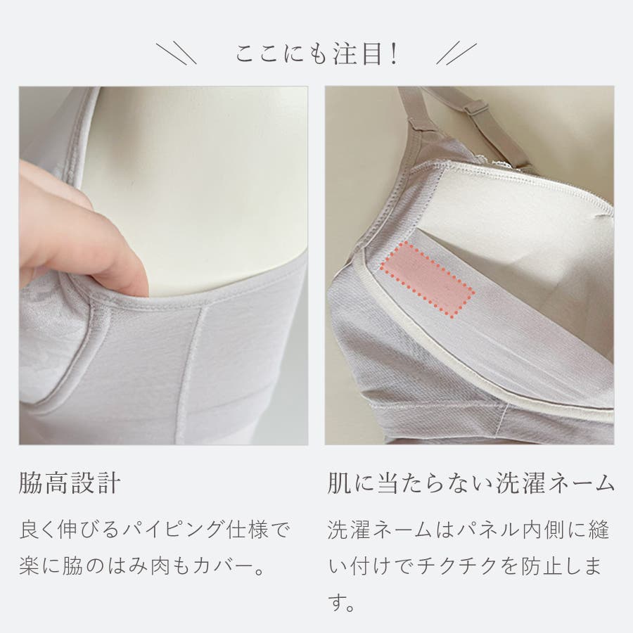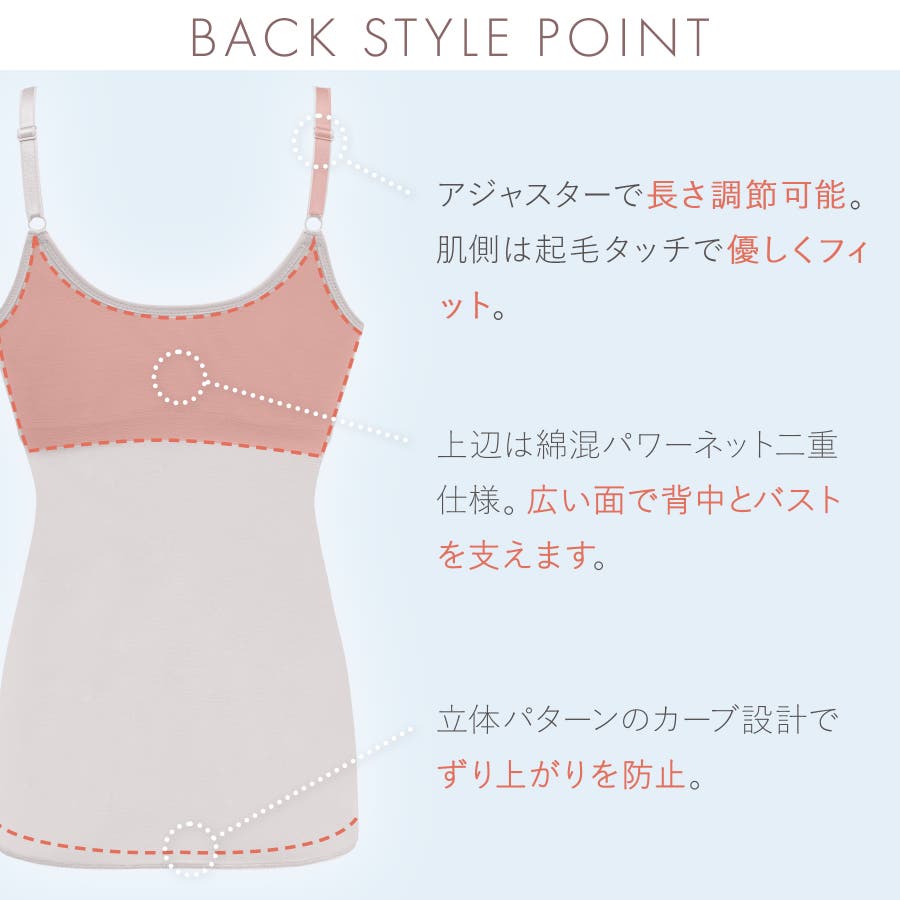 アジャスター付きのストラップで長さ調節が可能。バストが大きな方や身長のある方でも自分のバスト縦幅に合わせることができ、アンダーのずれ上がりも軽減。肌側は起毛タッチで柔らかな肌触りです。