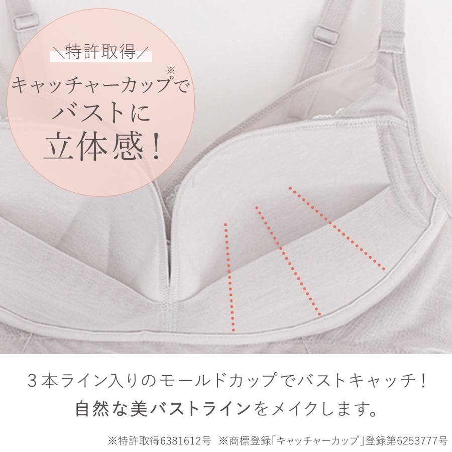 バストを立体的に包み込むモールド加工を施したオリジナル開発の『キャッチャーカップ』を使用。カップの3本の縦ラインがバストをキャッチして立体的に馴染ませ、自然なバストラインを作ります。(※特許第6381612号)