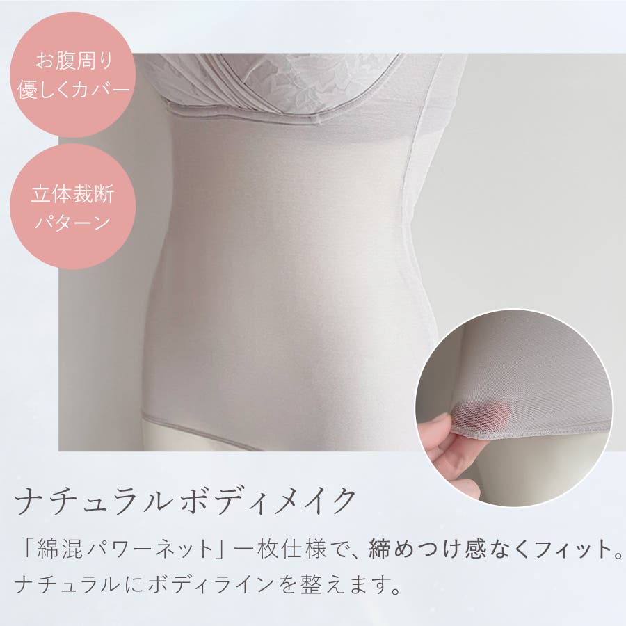 お腹部分は綿混パワーネットの一枚仕様で、広い面積でお腹とウエストをすっきりと整えます。パワーネットを横に伸びる方向に使用しているので、ほどよいシェイプ感で心地よく着用いただけます。