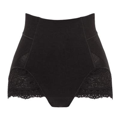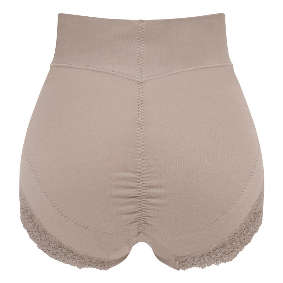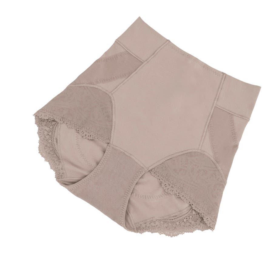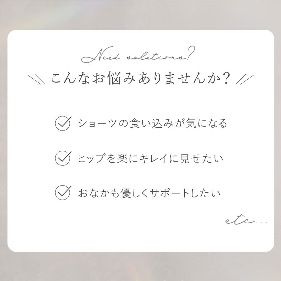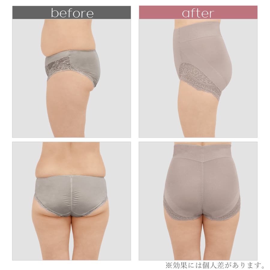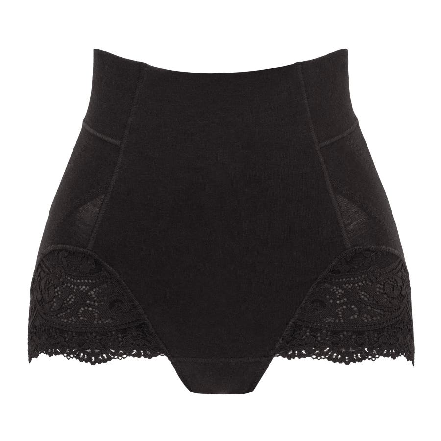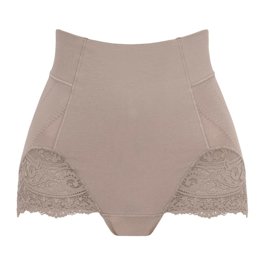 腰周りのはみ肉(浮輪肉)を包み込んですっぽりカバーするハイウエスト設計。フロントは身生地にナイロンメッシュを挟み込んだ三重構造でお腹押さえをサポートします
