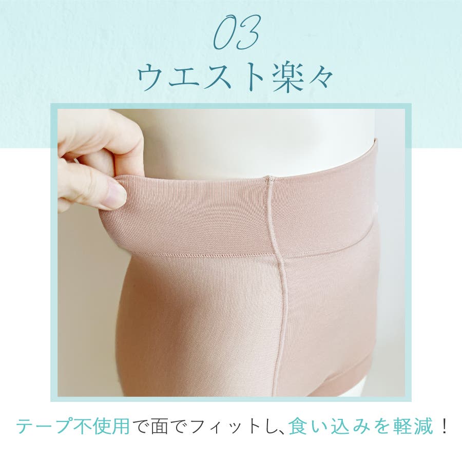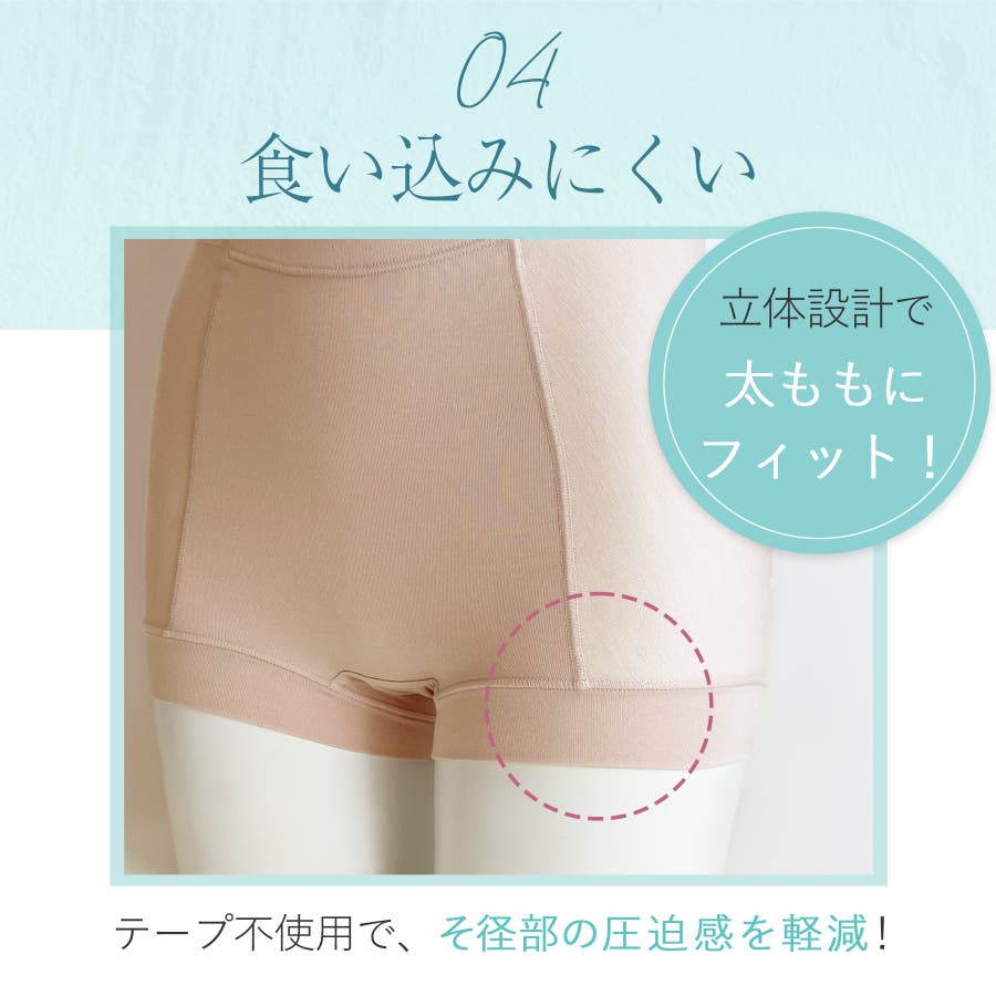 ゴムを使用せず、身生地を二重に折り返したわさ仕様*のため、ウエストサイズに合わせてパネルが可動するので座っている時でも食い込みにくくソフトなはき心地です。