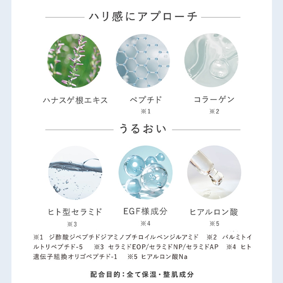 水 、BG 、エチルヘキサン酸セチル、グリセリン、水添ポリイソブテン、ハナスゲ根エキス、セラミドEOP、セラミドNP、セラミドAP 、フィトスフィンゴシン、ヒト遺伝子組換オリゴペプチド-1、ジ酢酸ジペプチドジアミノブチロイルベンジルアミド、プエラリアミリフィカ根エキス、ダイズ種子エキス、パルミトイルトリペプチド-5、水溶性コラーゲン、ザクロ果実エキス、ヒナギク花エキス 、ヒアルロン酸Na 、カニナバラ果実油、ニオイテンジクアオイ油 、アルガニアスピノサ核油、カキタンニン、チャ乾留液、ラウロイルラクチレートNa 、コレステロール、(アクリレーツ/アクリル酸アルキル(C10-30))クロスポリマー、キサンタンガム、カルボマー、ラウリン酸ポリグリセリル-10 、ジステアリン酸ポリグリセリル-3メチルグルコース、ペンチレングリコール、マンニトール、 エタノール、クロラミンT、炭酸水素Na、炭酸Na、水酸化K、メチルパラベン、プロピルパラベン、フェノキシエタノール、香料