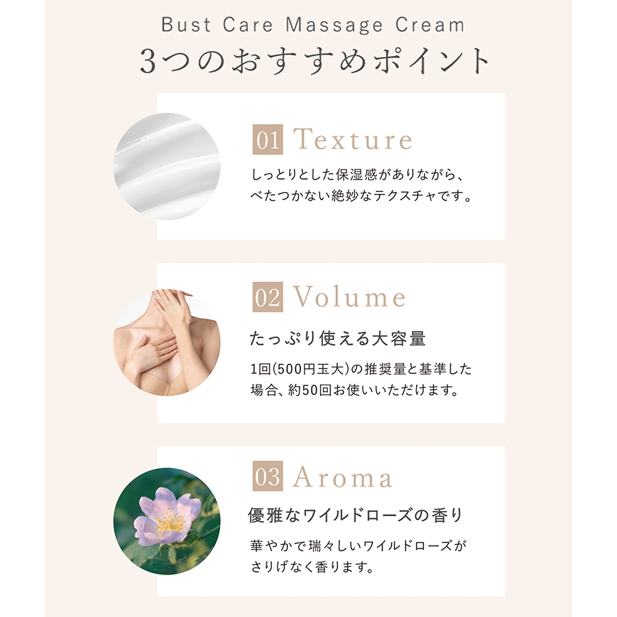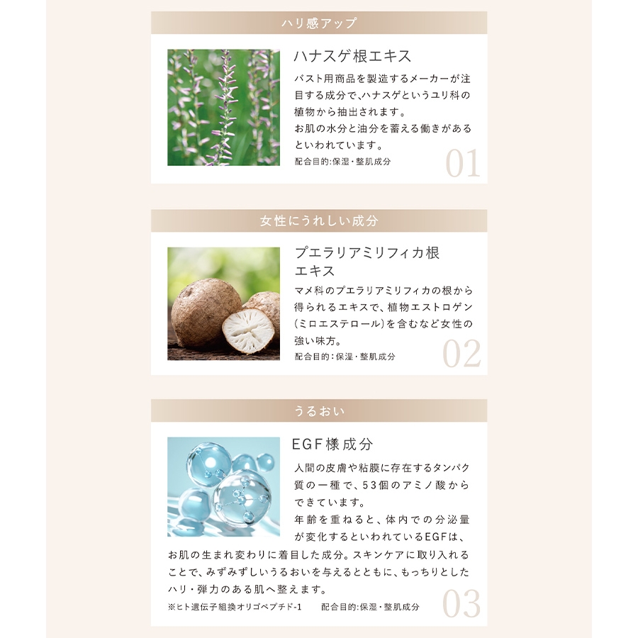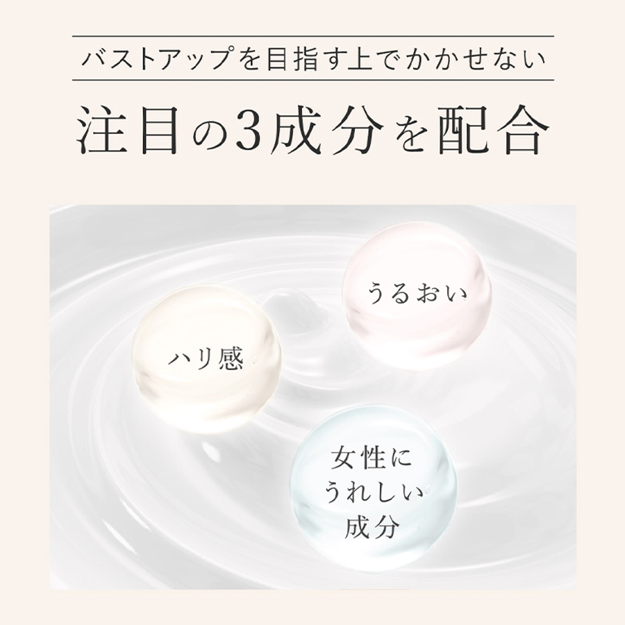 ふんわりバストを目指す女性の強い味方「ハナスゲ根エキス※」をはじめ、「ザクロ果実エキス※」「ダイズ種子エキス※」など自然由来の成分を配合。