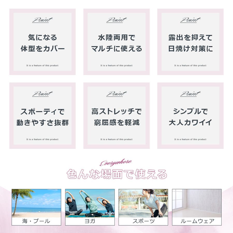 機能性だけでなく、大人カワイイデザインもこだわり。スポーツ系水着が初めての方でも使いやすいシンプルでオシャレなデザインです。